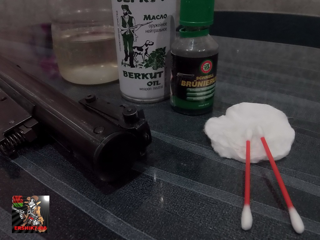 Также решил доработать товарищу и его железо.У него был выточен на замену штатного новый стальной задник компрессора.Пользуясь тем,что он стальной-решил его заворонить.Мне показалось будет это симпатичнее на пистолете,едино с общей концепцией.Зачистил не снимая его с пистолета-кое где на нём уже появились пятна ржавчины.Последней была 2000-я нулёвка.Обезжирил его хорошо растворителем 646.Далее ватной палочкой нанёс состав «Клевер»,снова обработал всё растворителем,сушка,снова «Клевер». Такую процедуру повторил 4 раза.После протирания растворителем последнего слоя «Клевер», нанёс на обработанный задник нейтральное ружейное масло.Оставил на 3 часа,затем протёр всё мягкой тканью.И вышло всё как нельзя здорово,вот ДО и ПОСЛЕ:
