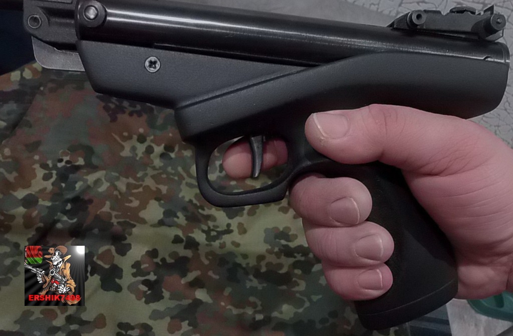 Рукоятка мала,кисть вперёд не подать,очень узкое пространство между той же рукояткой и нижней частью ложи.К тому же на крючок уже давишь не первой фалангой(пальцы то вытянулись),а сгибом между первой и второй.Также было желание хозяина пистолета,чтобы рукоятка была универсальной-подходила бы для стрельбы с обоих рук.Но конечно при этом была ухватистой и удобной.На том и порешили…