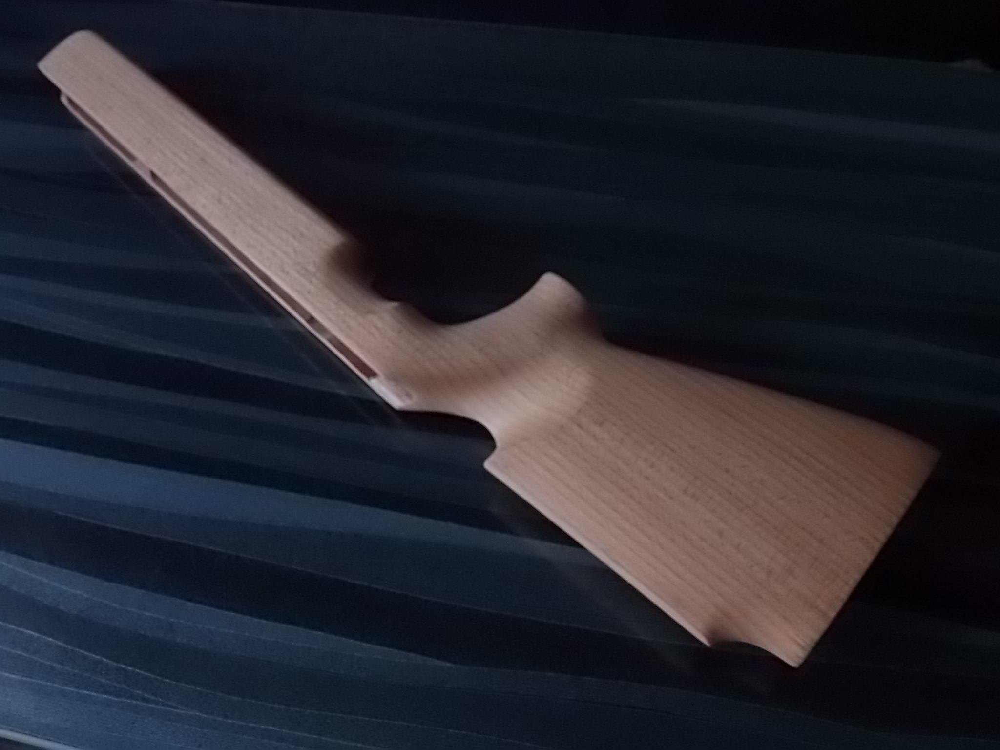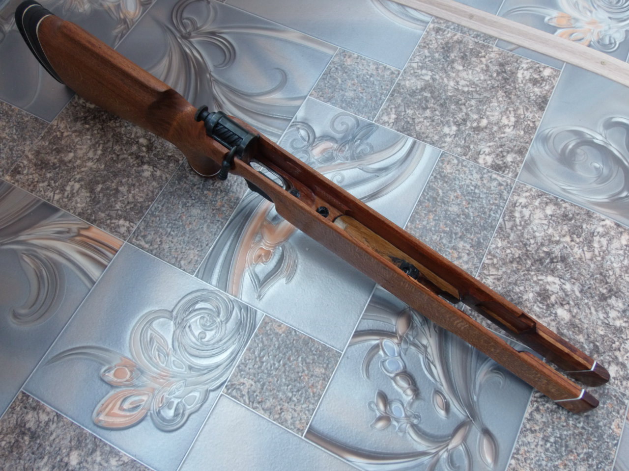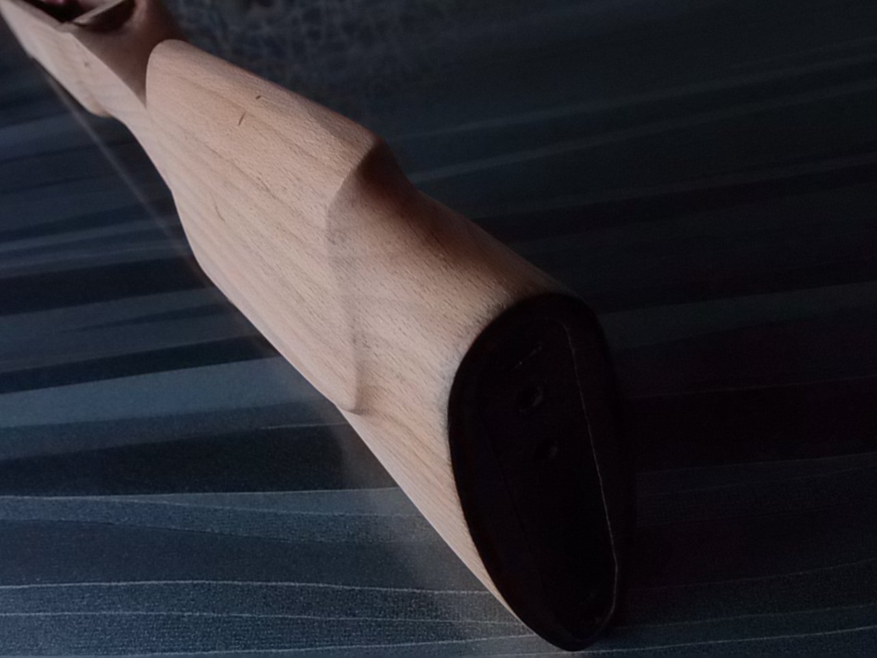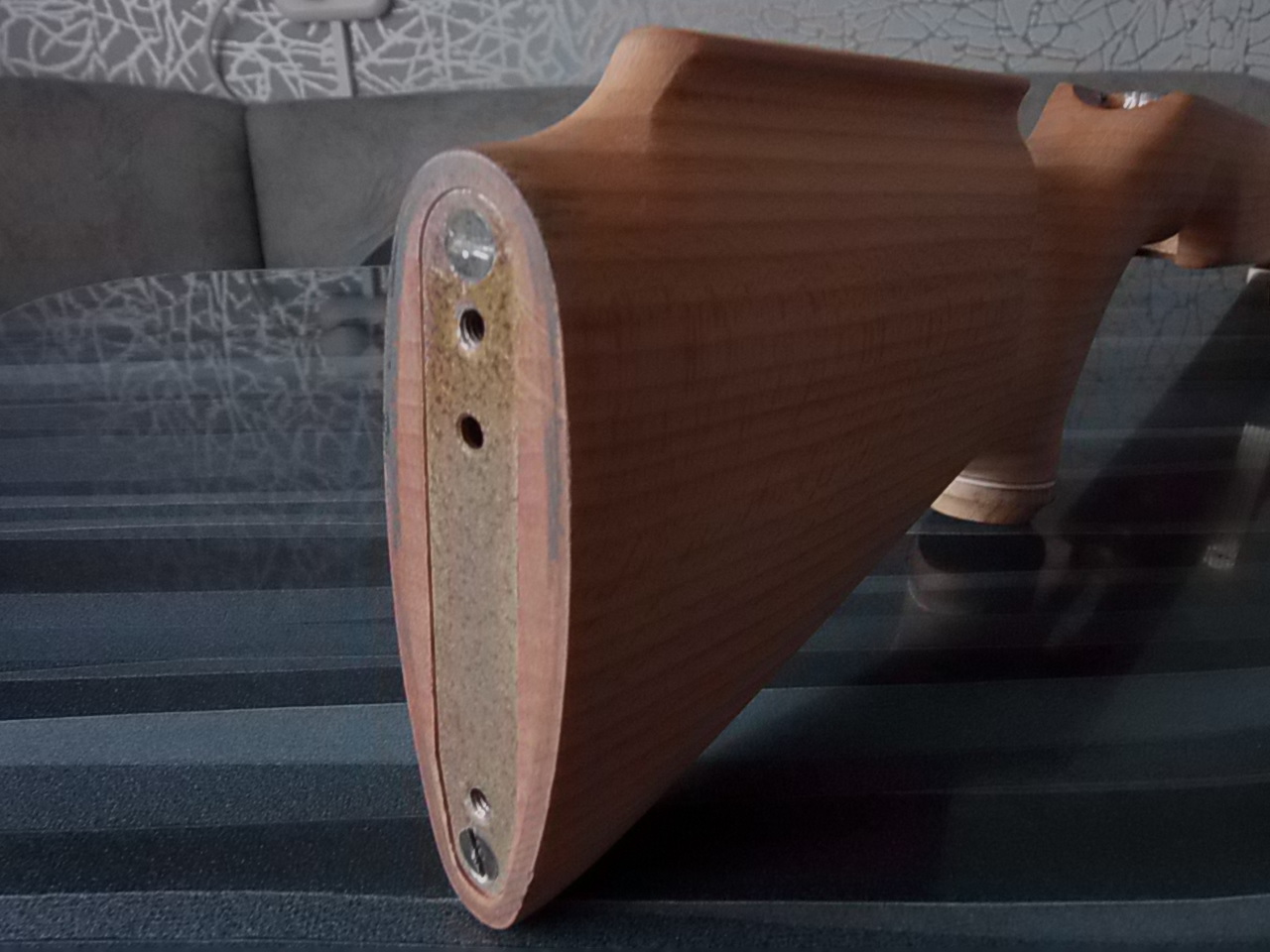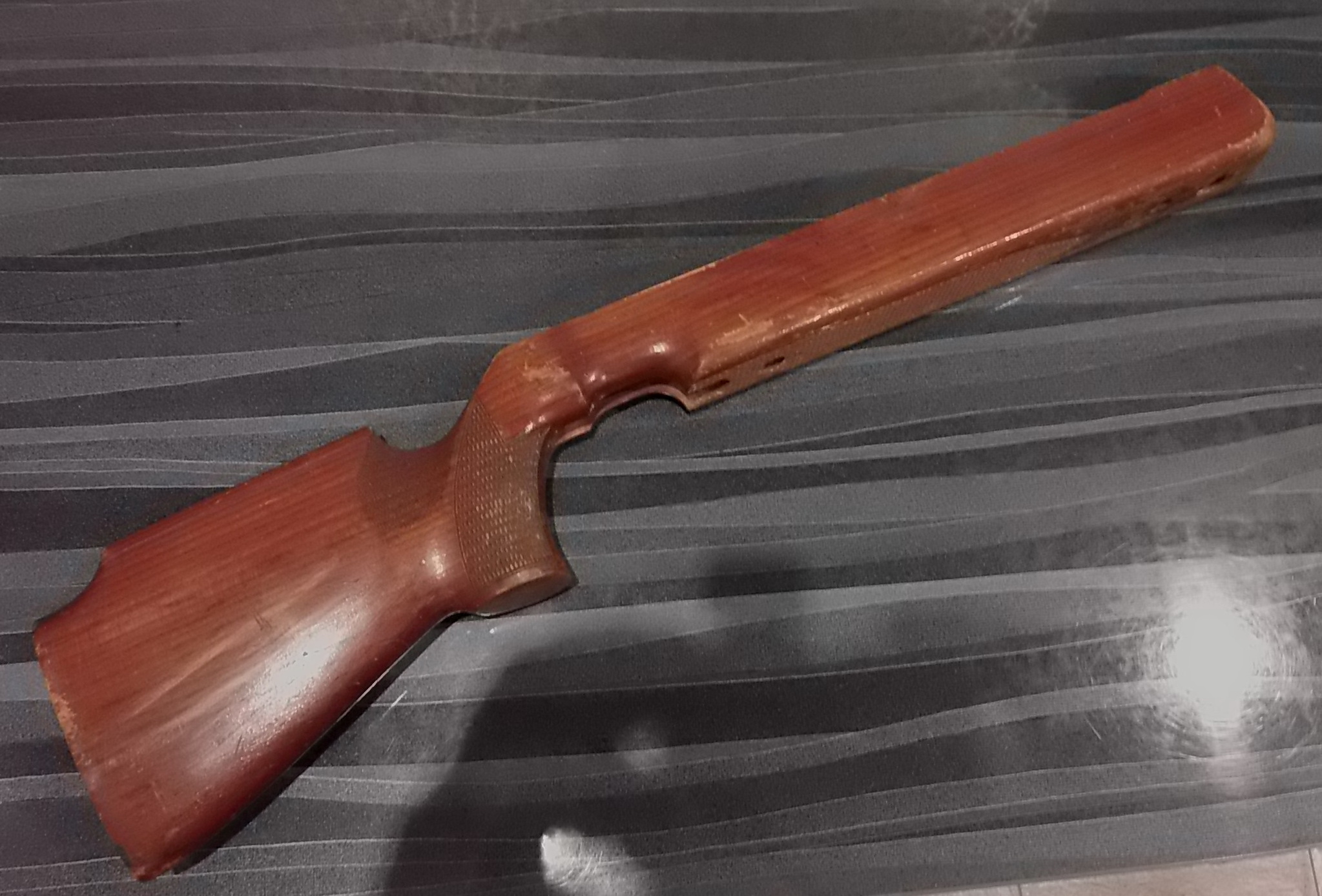 Покрытое ржавчиной железо было обильно покрыто аэрозолью WD-40,оставлено на отмокание на сутки.После протёр всё обработанное мягкой тканью,затем обрызгал нейтральным ружейным маслом.Спустя ещё несколько часов протёр всё насухо.Итог-ну практически идеальным стало всё «железо». Ну а к тому времени нашлись некоторые детали в компрессор на замену.Приехали ко мне манжета новенькая с перепуском,пружина новая,стальная телескопическая направляющая /утяжелитель, ну и старенькая ложа от юниорского «Зуля» с затыльником и спусковой скобой.И вот таким стал весь наборчик к «Мурке»: Затыльник был в не полном комплекте.Требовалось его доработать.О этом чуть позже,а сама ложа была вот в таком неприглядном состоянии: Выборка родная конечно же «Мурке» не подходила.Потому кроме внешнего апгрейда,требовалось адаптировать ложу «Зуль» под нашу «МР-512». Ну и конечно же внести некоторый «марафет» в сие изделие: Первым делом всё было обработано шкурками разной зернистости на оправках. Скажу честно-на этот раз попотеть пришлось изрядно,очень не хотелось ей легко отшкуриться.Материал ложи-бук. Что самое интересное-заготовка для ложи каким-то немцем была выбрана едва ли не симметричная.Будто именно середина бревна букового была выпилена в брус (доску) для этой ложи.В общем отшкурил: Обработал далеко не на чисто-это не требовалось,так как работы с клеями ещё предстояло,счищать его впоследствии нужно было бы снова.Порадовало,что кроме прямолинейной текстуры вскрылись характерные для бука мелкие тёмные риски и тигровые вкрапления.После пропитки это как бы обещало дать красивую и интересную «палку-буратинку».К слову не ошибся!!!Ну о этом будет ниже…