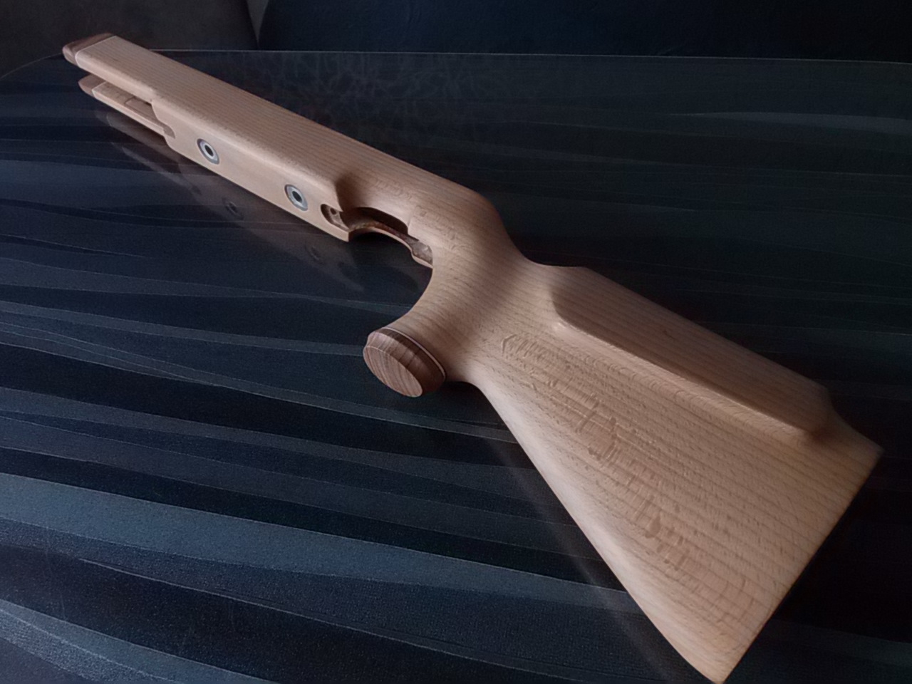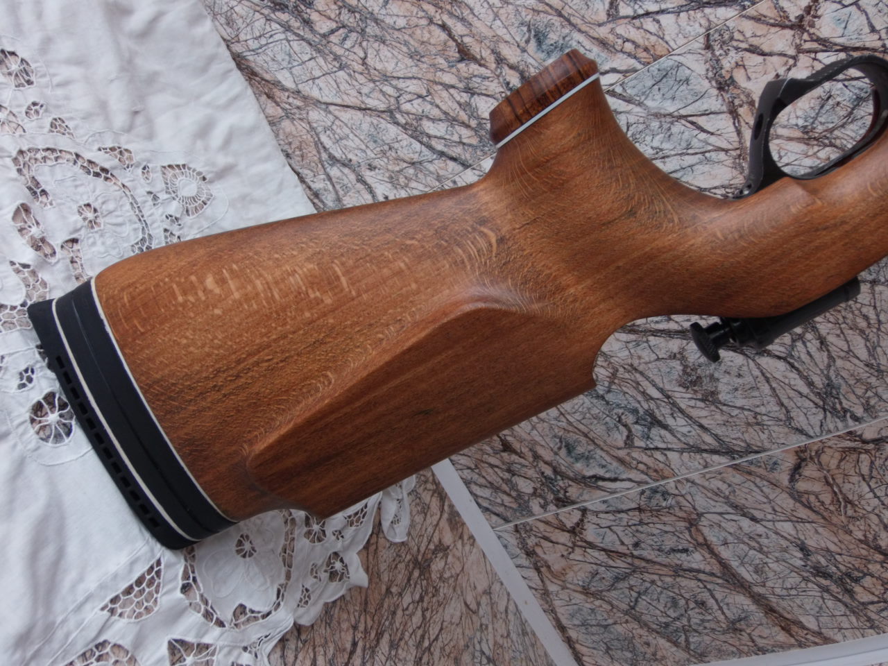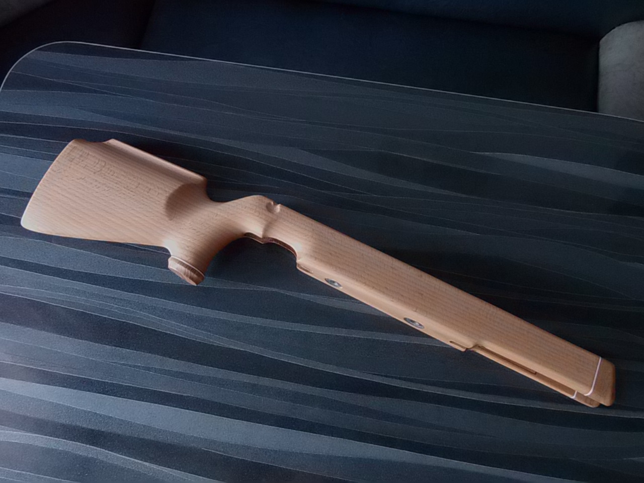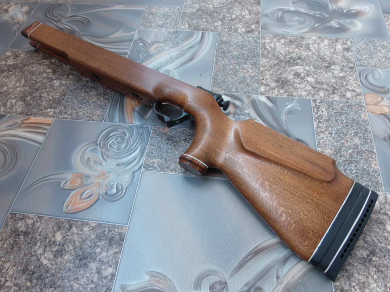 Покрытое ржавчиной железо было обильно покрыто аэрозолью WD-40,оставлено на отмокание на сутки.После протёр всё обработанное мягкой тканью,затем обрызгал нейтральным ружейным маслом.Спустя ещё несколько часов протёр всё насухо.Итог-ну практически идеальным стало всё «железо». Ну а к тому времени нашлись некоторые детали в компрессор на замену.Приехали ко мне манжета новенькая с перепуском,пружина новая,стальная телескопическая направляющая /утяжелитель, ну и старенькая ложа от юниорского «Зуля» с затыльником и спусковой скобой.И вот таким стал весь наборчик к «Мурке»: Затыльник был в не полном комплекте.Требовалось его доработать.О этом чуть позже,а сама ложа была вот в таком неприглядном состоянии: Выборка родная конечно же «Мурке» не подходила.Потому кроме внешнего апгрейда,требовалось адаптировать ложу «Зуль» под нашу «МР-512». Ну и конечно же внести некоторый «марафет» в сие изделие: Первым делом всё было обработано шкурками разной зернистости на оправках. Скажу честно-на этот раз попотеть пришлось изрядно,очень не хотелось ей легко отшкуриться.Материал ложи-бук. Что самое интересное-заготовка для ложи каким-то немцем была выбрана едва ли не симметричная.Будто именно середина бревна букового была выпилена в брус (доску) для этой ложи.В общем отшкурил: Обработал далеко не на чисто-это не требовалось,так как работы с клеями ещё предстояло,счищать его впоследствии нужно было бы снова.Порадовало,что кроме прямолинейной текстуры вскрылись характерные для бука мелкие тёмные риски и тигровые вкрапления.После пропитки это как бы обещало дать красивую и интересную «палку-буратинку».К слову не ошибся!!!Ну о этом будет ниже…