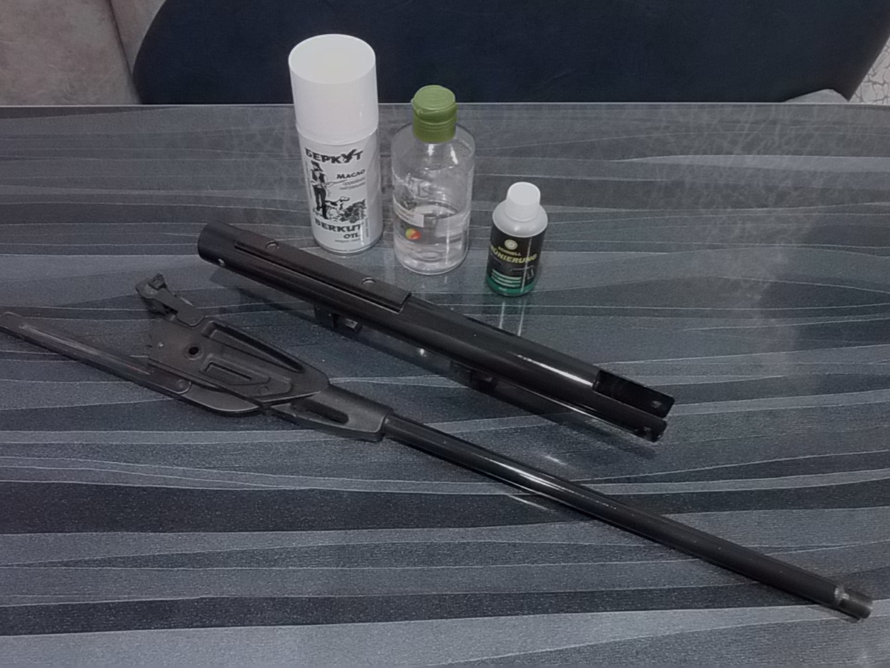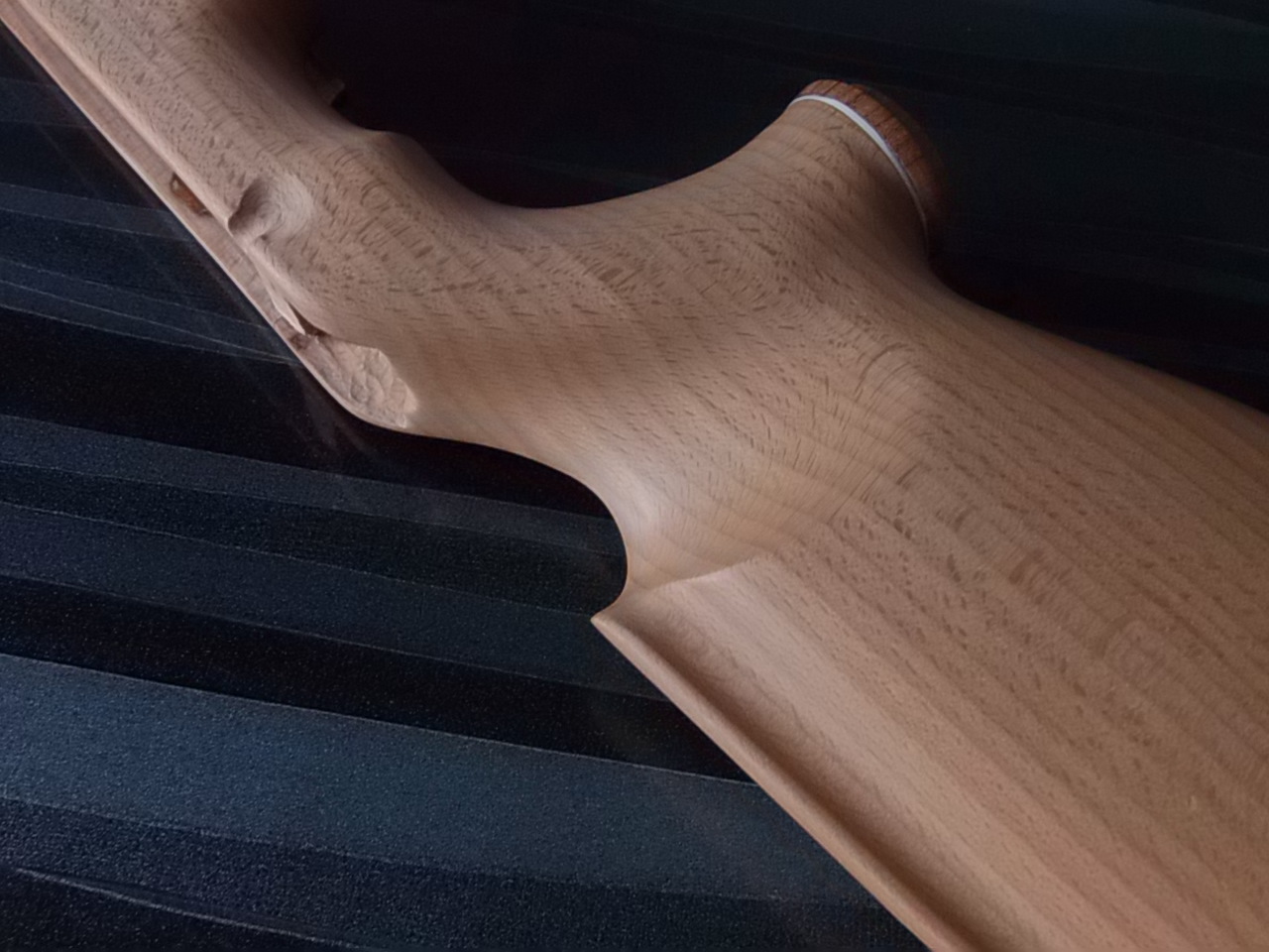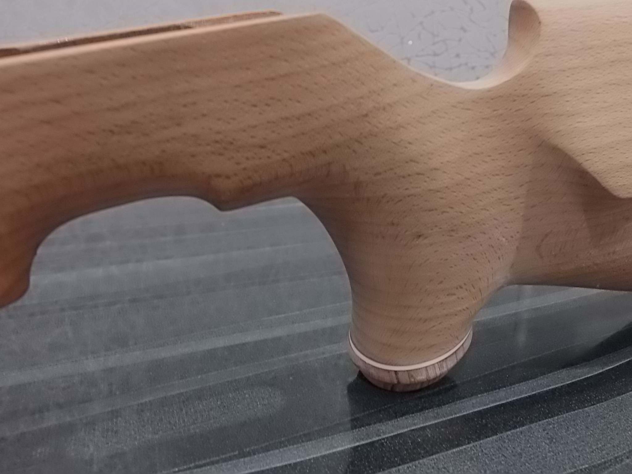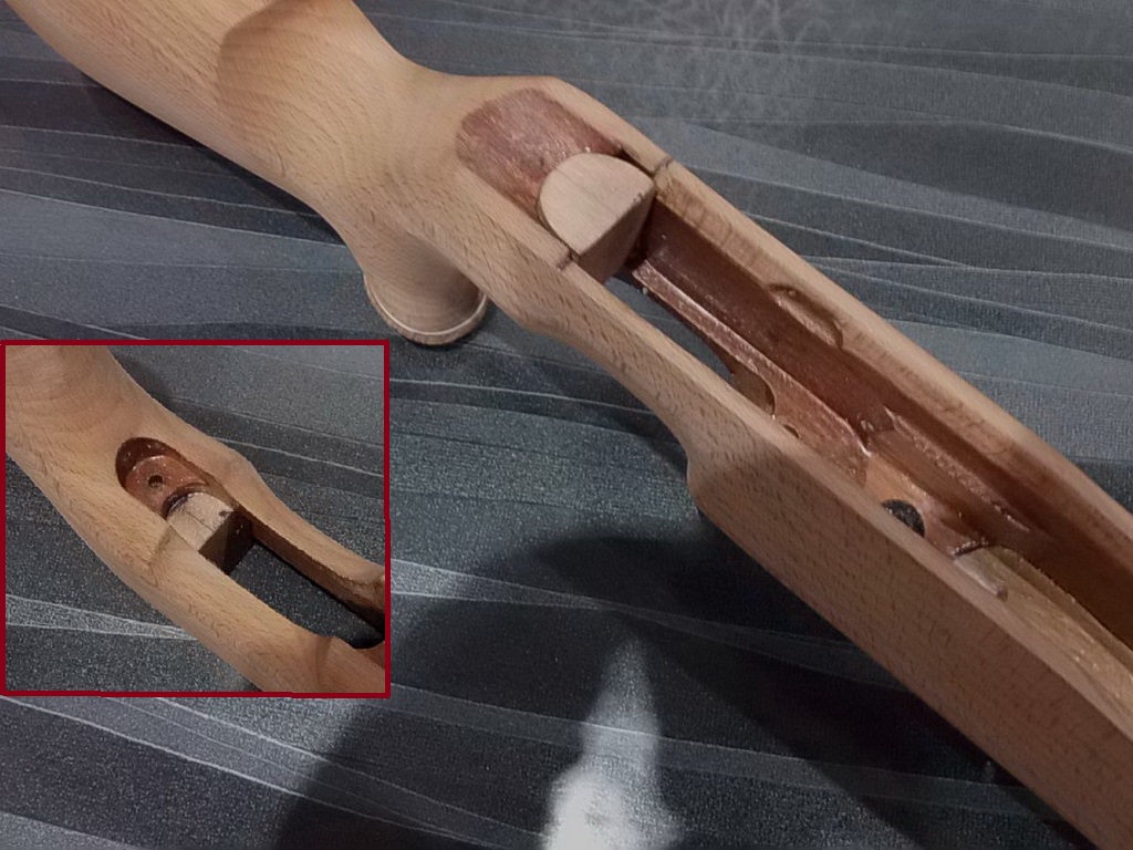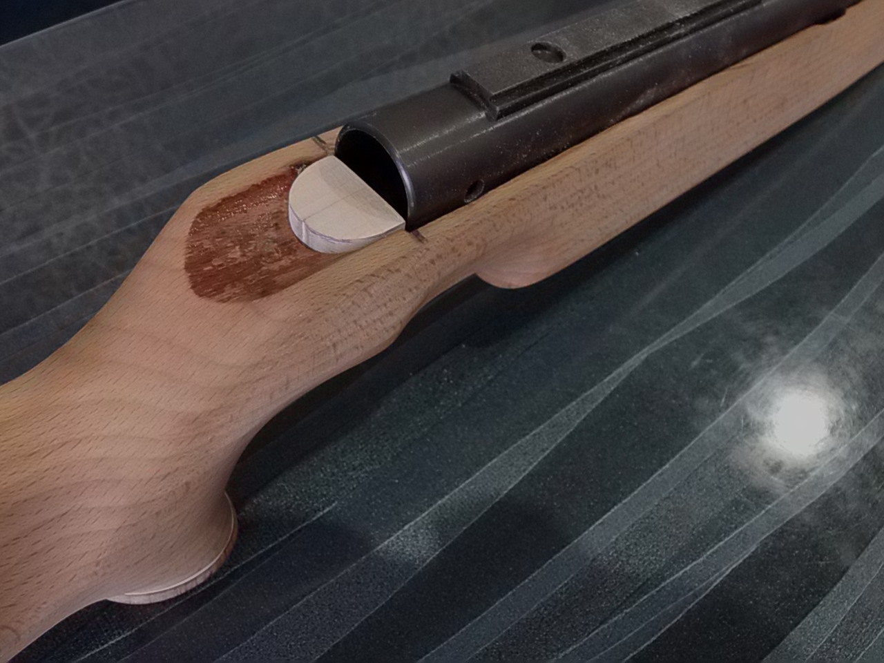 Покрытое ржавчиной железо было обильно покрыто аэрозолью WD-40,оставлено на отмокание на сутки.После протёр всё обработанное мягкой тканью,затем обрызгал нейтральным ружейным маслом.Спустя ещё несколько часов протёр всё насухо.Итог-ну практически идеальным стало всё «железо». Ну а к тому времени нашлись некоторые детали в компрессор на замену.Приехали ко мне манжета новенькая с перепуском,пружина новая,стальная телескопическая направляющая /утяжелитель, ну и старенькая ложа от юниорского «Зуля» с затыльником и спусковой скобой.И вот таким стал весь наборчик к «Мурке»: Затыльник был в не полном комплекте.Требовалось его доработать.О этом чуть позже,а сама ложа была вот в таком неприглядном состоянии: Выборка родная конечно же «Мурке» не подходила.Потому кроме внешнего апгрейда,требовалось адаптировать ложу «Зуль» под нашу «МР-512». Ну и конечно же внести некоторый «марафет» в сие изделие: Первым делом всё было обработано шкурками разной зернистости на оправках. Скажу честно-на этот раз попотеть пришлось изрядно,очень не хотелось ей легко отшкуриться.Материал ложи-бук. Что самое интересное-заготовка для ложи каким-то немцем была выбрана едва ли не симметричная.Будто именно середина бревна букового была выпилена в брус (доску) для этой ложи.В общем отшкурил: Обработал далеко не на чисто-это не требовалось,так как работы с клеями ещё предстояло,счищать его впоследствии нужно было бы снова.Порадовало,что кроме прямолинейной текстуры вскрылись характерные для бука мелкие тёмные риски и тигровые вкрапления.После пропитки это как бы обещало дать красивую и интересную «палку-буратинку».К слову не ошибся!!!Ну о этом будет ниже…