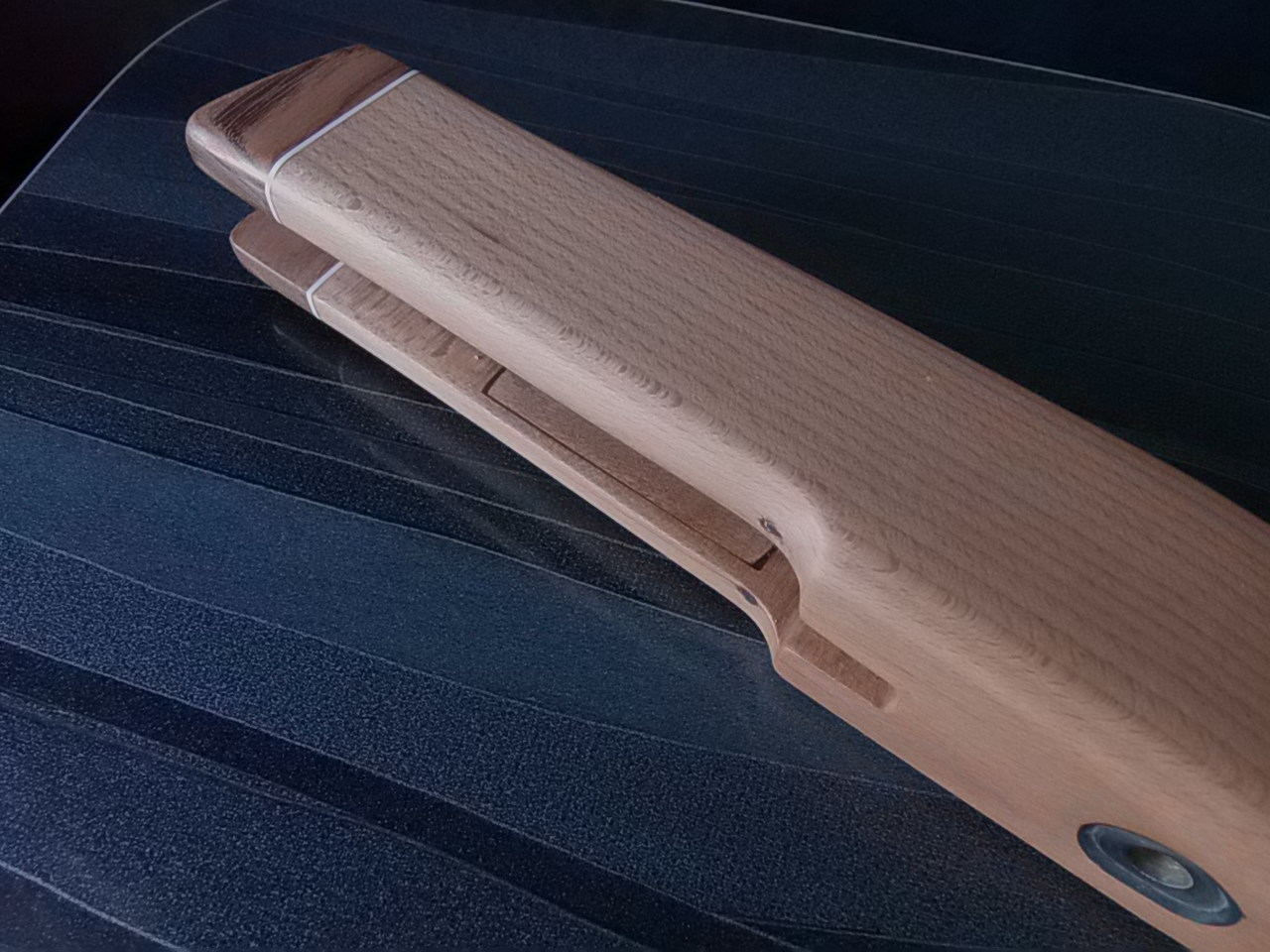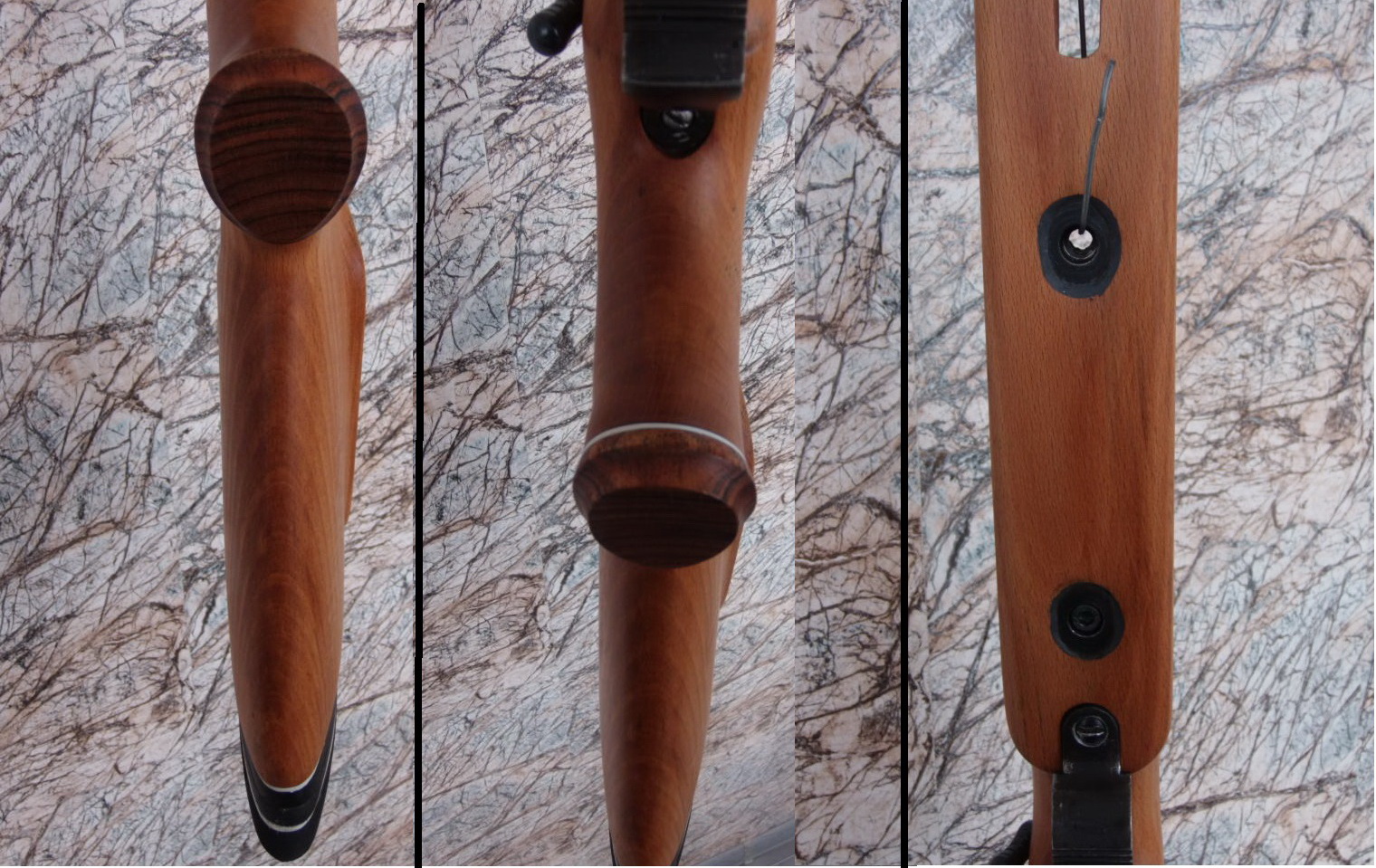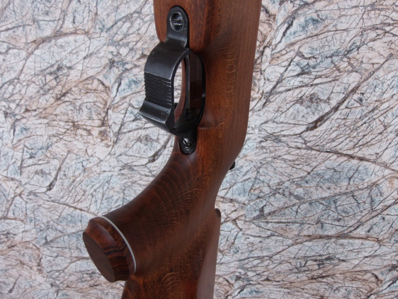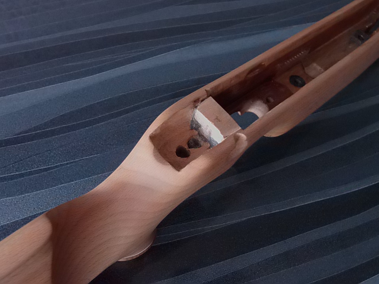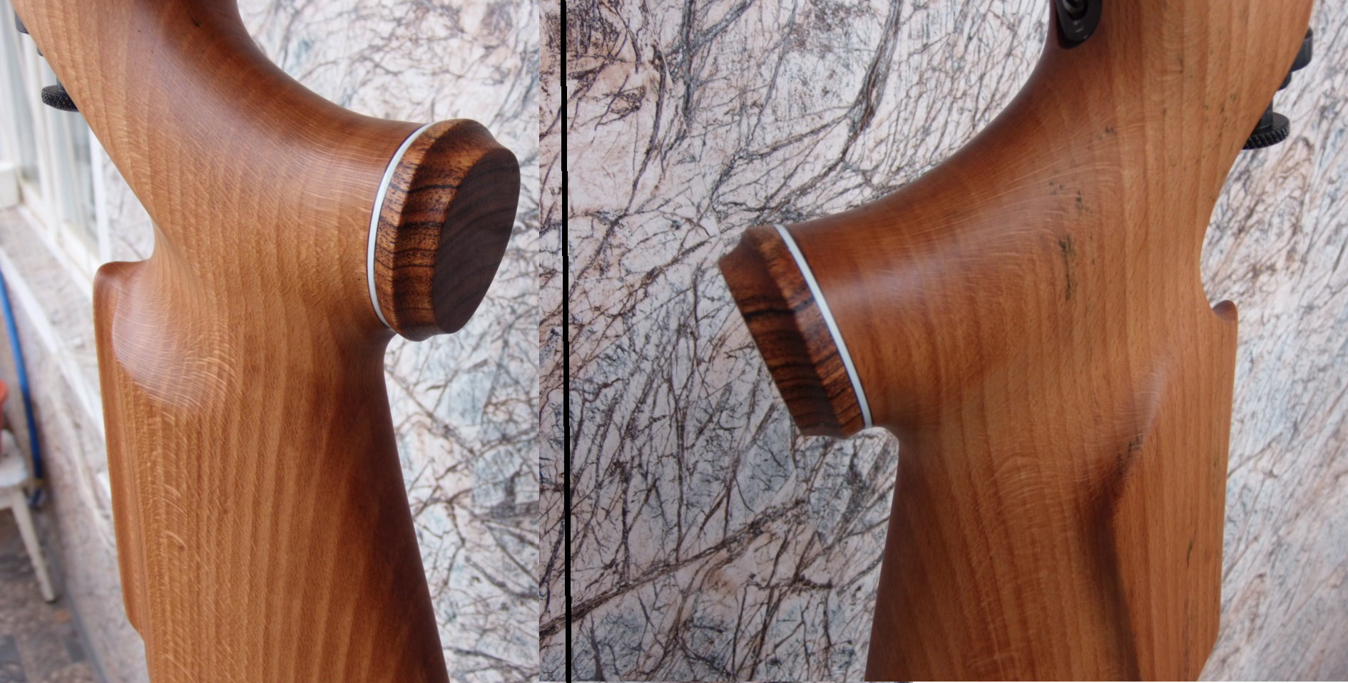 Покрытое ржавчиной железо было обильно покрыто аэрозолью WD-40,оставлено на отмокание на сутки.После протёр всё обработанное мягкой тканью,затем обрызгал нейтральным ружейным маслом.Спустя ещё несколько часов протёр всё насухо.Итог-ну практически идеальным стало всё «железо». Ну а к тому времени нашлись некоторые детали в компрессор на замену.Приехали ко мне манжета новенькая с перепуском,пружина новая,стальная телескопическая направляющая /утяжелитель, ну и старенькая ложа от юниорского «Зуля» с затыльником и спусковой скобой.И вот таким стал весь наборчик к «Мурке»: Затыльник был в не полном комплекте.Требовалось его доработать.О этом чуть позже,а сама ложа была вот в таком неприглядном состоянии: Выборка родная конечно же «Мурке» не подходила.Потому кроме внешнего апгрейда,требовалось адаптировать ложу «Зуль» под нашу «МР-512». Ну и конечно же внести некоторый «марафет» в сие изделие: Первым делом всё было обработано шкурками разной зернистости на оправках. Скажу честно-на этот раз попотеть пришлось изрядно,очень не хотелось ей легко отшкуриться.Материал ложи-бук. Что самое интересное-заготовка для ложи каким-то немцем была выбрана едва ли не симметричная.Будто именно середина бревна букового была выпилена в брус (доску) для этой ложи.В общем отшкурил: Обработал далеко не на чисто-это не требовалось,так как работы с клеями ещё предстояло,счищать его впоследствии нужно было бы снова.Порадовало,что кроме прямолинейной текстуры вскрылись характерные для бука мелкие тёмные риски и тигровые вкрапления.После пропитки это как бы обещало дать красивую и интересную «палку-буратинку».К слову не ошибся!!!Ну о этом будет ниже…
