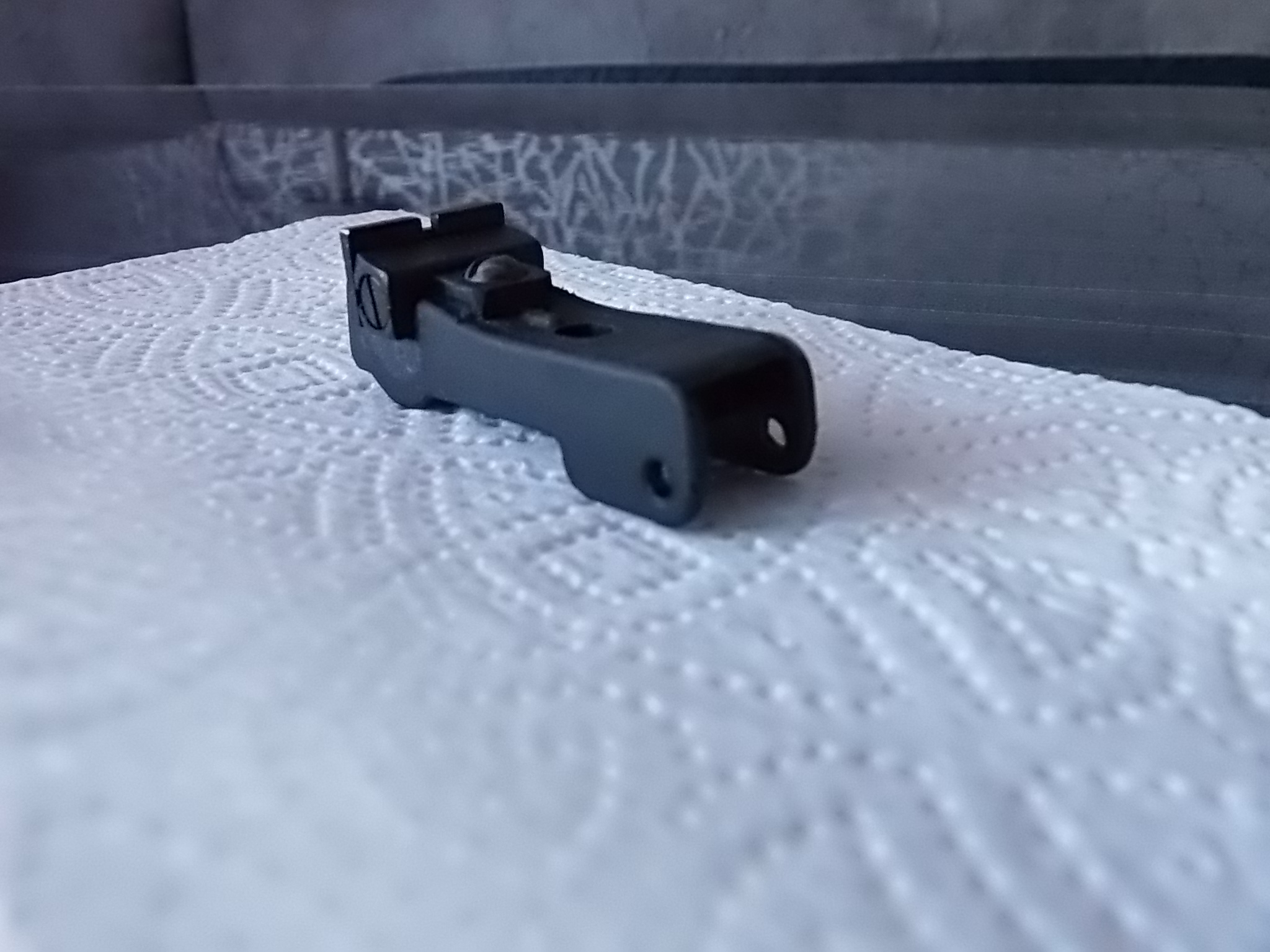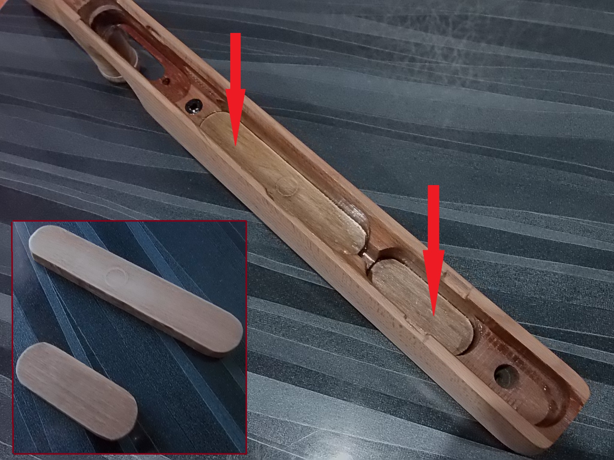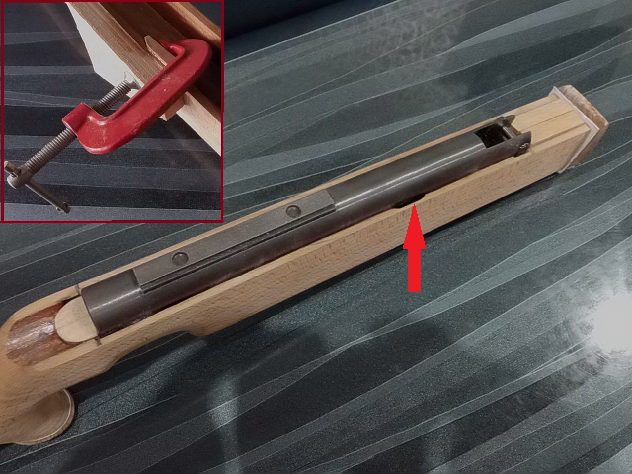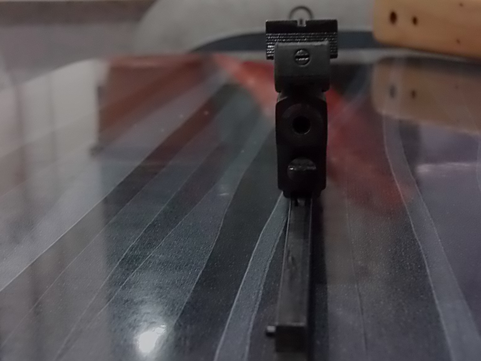 Теперь нужно было изготовить недостающий в комплекте целик.Опять помог Иван-колодку под него он мне отыскал.Сам же целик планировал применить от «ИЖ-40», но примерив понял-не то,что нужно! Порыскал по своим сусекам и отыскал целик от «Кандар»,присланный на поделки как-то Павлом (1Паша1).Вот его и решил применить. Снял с колодки сам целик,немного нос его отпилил,подработал надфилями.Сделал в колодке крепёжное отверстие для этого целика.На этой же колодке «хол.сваркой» залепил и после высыхания аккуратно обработал выборку под цилиндр с целиком,предусмотренный для установки родного ижевского целика.В серединке сделал небольшой паз надфилем плоским для посадки на колодку кандаровского целика.На ЭДП его к ней приклеил,завернул крепёжный винт,снизу замазал пустоту той же «хол.сваркой».Возможность горизонтальных поправок была сохранена-целик не касается задней стенки колодки.По вертикали целик регулируется стандартным верхним винтом с круглой рифлёной «шляпой». Когда примерил целик по месту и всё мне вполне понравилось-установил на казну и зафиксировал штифтом,сделанным из хвостовика свёрлышка.Задний винтик в колодке также работает.После внесения горизонтальных поправок,можно зафиксировать целик им тоже: Попутно немного доработал и ствол.Фаской на дульном срезе,как водится у «ИЖМЕХ» даже не пахло.На токарном станке легонько отторцевал,сделал далее аккуратную лёгкую фасочку.Резьбу на конце ствола М12Х1 также поправил после резца.Примерно так,может рассмотрите что: По состоянию канала ствола нареканий не было-нарезы чёткие,без коцок.Теперь пулька выходила из ствола с чёткими равномерными нарезами,что очень гуд! Далее решено было облагородить рукоять прокладкой с чёпиком.Для него выбрал красивую индийскую древесину-было пару кусочков в «загашнике».Вот такая она в виде дощечек раньше приходила к нам в качестве поддонов с индийским стеклопрутком,их мы и курочили на дощечки.Кто на что: Прокладку сделал из белого пластика от электрокороба,чёпик выпилил и обработал с неимоверным усердием из-за прочности из показанной выше древесины: В середине чёпика сделал отверстие на половину глубины для вклейки самореза шляпкой вниз.В прокладке сделал три отверстия-центральное для того самого самореза.Боковые-для крепежа прокладки к рукояти.Вклеил обезжиренный предварительно саморез в отверстие на ЭДП шляпкой вниз.Лицевая сторона чёпика осталась такой же красивой и не изгаженной отверстиями и клеем.Примерил прокладку на рукояти,отметил отверстия.Просверлил их в рукояти: Специально оставил шероховатыми поверхности чтобы клей лучше впитался в поры древесины.Прокладку обезжирил ацетоном,приготовил два крепёжных маленьких самореза.Приготовленным клеем ЭДП смазал поверхности,наложил прокладку, зафиксировал её к рукояти саморезами.Шляпки заподлицо-накладыванию чёпика не припятствуют: Затем накапал в центральное отверстие ЭДП,намазал клеем основание рукояти и плоскость на чёпике,опустил саморезом в это отверстие,выставил ровно его и зафиксировал вокруг рукояти скотчем. Вот примерно: Застывший ЭДП надёжно удержит чёпик-ПРОВЕРЕНО!!! Вот и застыло.И прокладка, и чёпик были с небольшим припуском для точной подгонки.На фото видно: Снова наждачку в руки-час неспешной работы,и всё слито воедино.Красиво и ровно: Теперь можно было занять