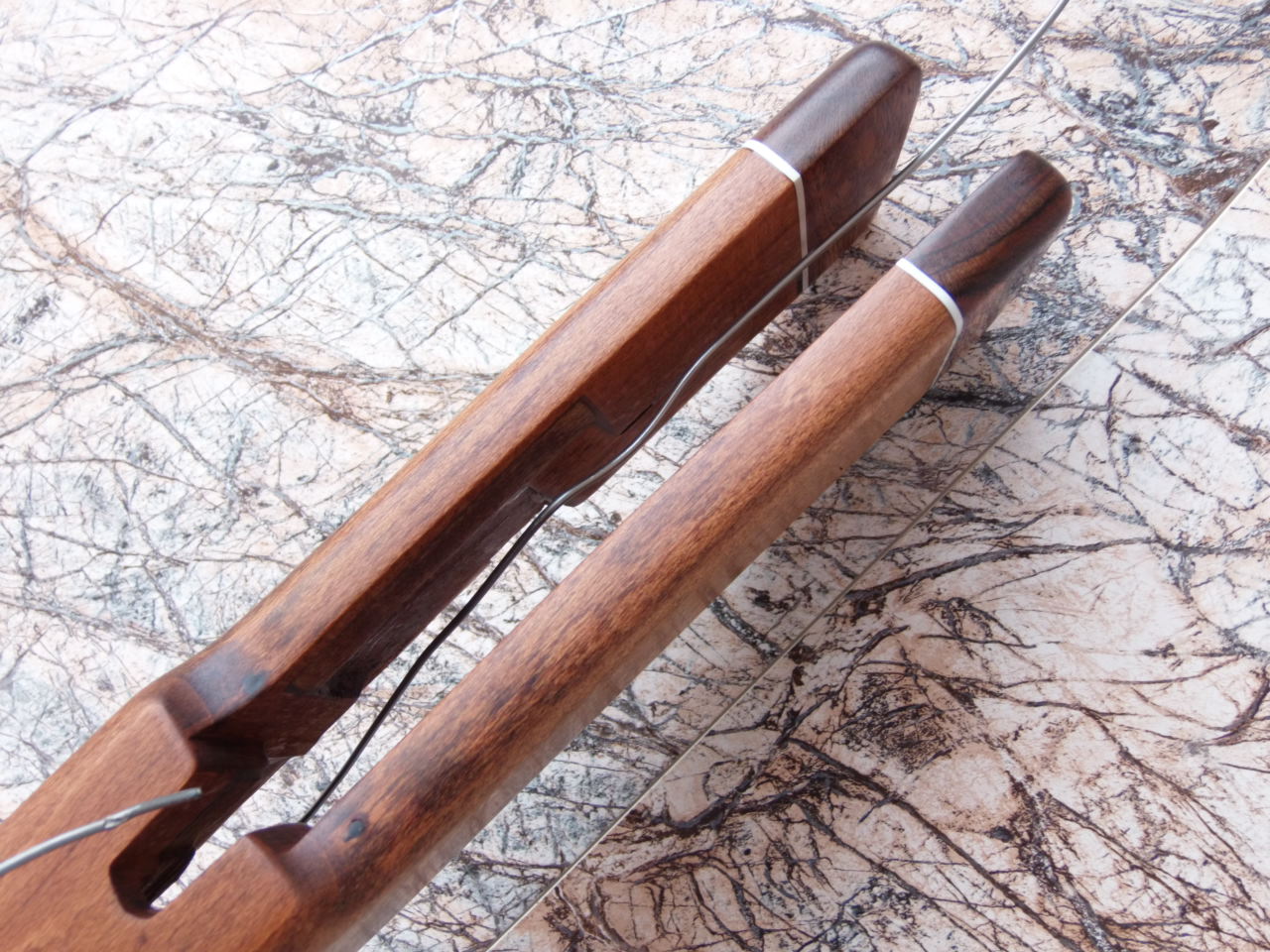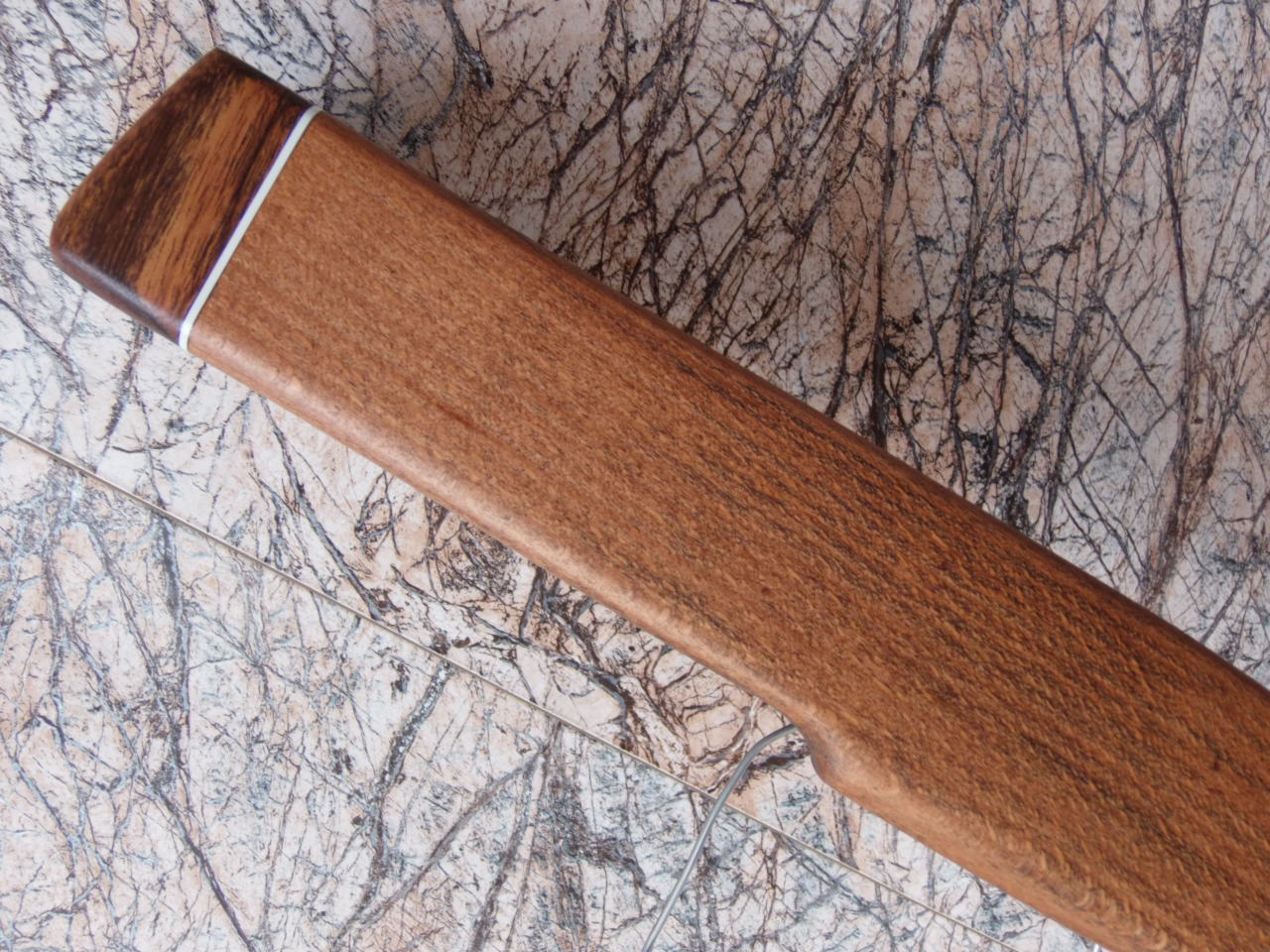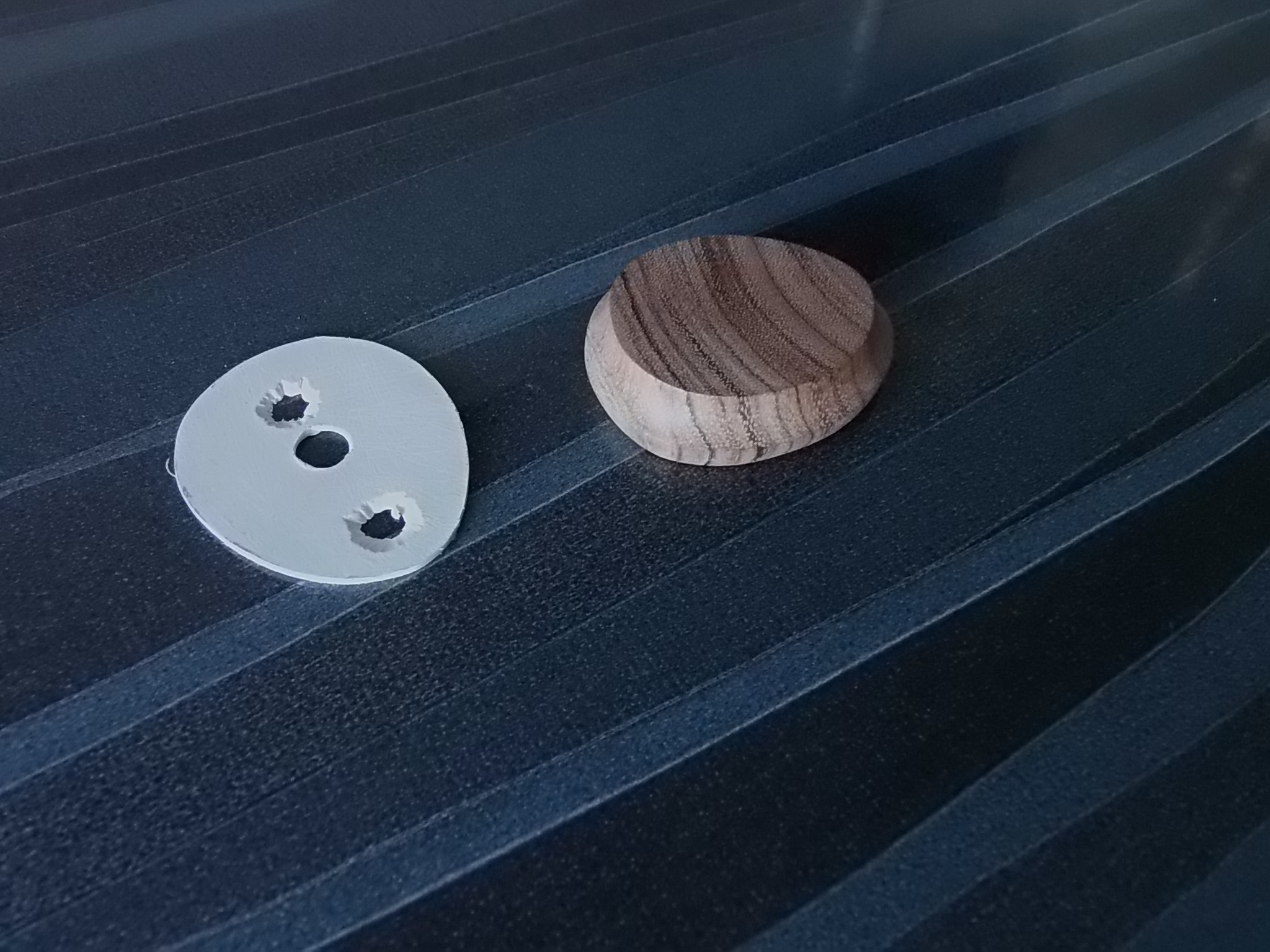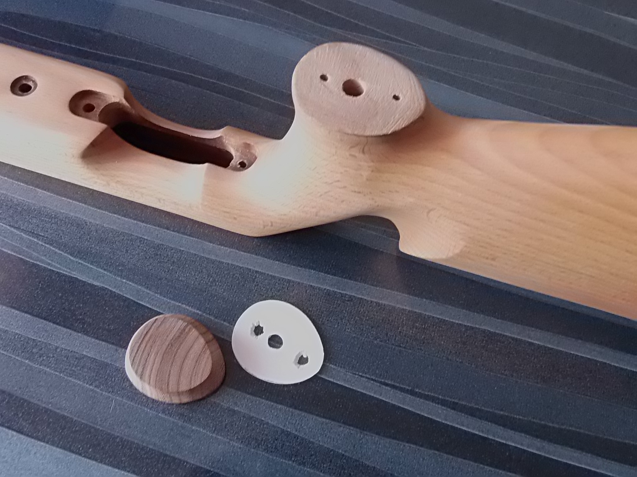 Теперь нужно было изготовить недостающий в комплекте целик.Опять помог Иван-колодку под него он мне отыскал.Сам же целик планировал применить от «ИЖ-40», но примерив понял-не то,что нужно! Порыскал по своим сусекам и отыскал целик от «Кандар»,присланный на поделки как-то Павлом (1Паша1).Вот его и решил применить. Снял с колодки сам целик,немного нос его отпилил,подработал надфилями.Сделал в колодке крепёжное отверстие для этого целика.На этой же колодке «хол.сваркой» залепил и после высыхания аккуратно обработал выборку под цилиндр с целиком,предусмотренный для установки родного ижевского целика.В серединке сделал небольшой паз надфилем плоским для посадки на колодку кандаровского целика.На ЭДП его к ней приклеил,завернул крепёжный винт,снизу замазал пустоту той же «хол.сваркой».Возможность горизонтальных поправок была сохранена-целик не касается задней стенки колодки.По вертикали целик регулируется стандартным верхним винтом с круглой рифлёной «шляпой». Когда примерил целик по месту и всё мне вполне понравилось-установил на казну и зафиксировал штифтом,сделанным из хвостовика свёрлышка.Задний винтик в колодке также работает.После внесения горизонтальных поправок,можно зафиксировать целик им тоже: Попутно немного доработал и ствол.Фаской на дульном срезе,как водится у «ИЖМЕХ» даже не пахло.На токарном станке легонько отторцевал,сделал далее аккуратную лёгкую фасочку.Резьбу на конце ствола М12Х1 также поправил после резца.Примерно так,может рассмотрите что: По состоянию канала ствола нареканий не было-нарезы чёткие,без коцок.Теперь пулька выходила из ствола с чёткими равномерными нарезами,что очень гуд! Далее решено было облагородить рукоять прокладкой с чёпиком.Для него выбрал красивую индийскую древесину-было пару кусочков в «загашнике».Вот такая она в виде дощечек раньше приходила к нам в качестве поддонов с индийским стеклопрутком,их мы и курочили на дощечки.Кто на что: Прокладку сделал из белого пластика от электрокороба,чёпик выпилил и обработал с неимоверным усердием из-за прочности из показанной выше древесины: В середине чёпика сделал отверстие на половину глубины для вклейки самореза шляпкой вниз.В прокладке сделал три отверстия-центральное для того самого самореза.Боковые-для крепежа прокладки к рукояти.Вклеил обезжиренный предварительно саморез в отверстие на ЭДП шляпкой вниз.Лицевая сторона чёпика осталась такой же красивой и не изгаженной отверстиями и клеем.Примерил прокладку на рукояти,отметил отверстия.Просверлил их в рукояти: Специально оставил шероховатыми поверхности чтобы клей лучше впитался в поры древесины.Прокладку обезжирил ацетоном,приготовил два крепёжных маленьких самореза.Приготовленным клеем ЭДП смазал поверхности,наложил прокладку, зафиксировал её к рукояти саморезами.Шляпки заподлицо-накладыванию чёпика не припятствуют: Затем накапал в центральное отверстие ЭДП,намазал клеем основание рукояти и плоскость на чёпике,опустил саморезом в это отверстие,выставил ровно его и зафиксировал вокруг рукояти скотчем. Вот примерно: Застывший ЭДП надёжно удержит чёпик-ПРОВЕРЕНО!!! Вот и застыло.И прокладка, и чёпик были с небольшим припуском для точной подгонки.На фото видно: Снова наждачку в руки-час неспешной работы,и всё слито воедино.Красиво и ровно: Теперь можно было занять