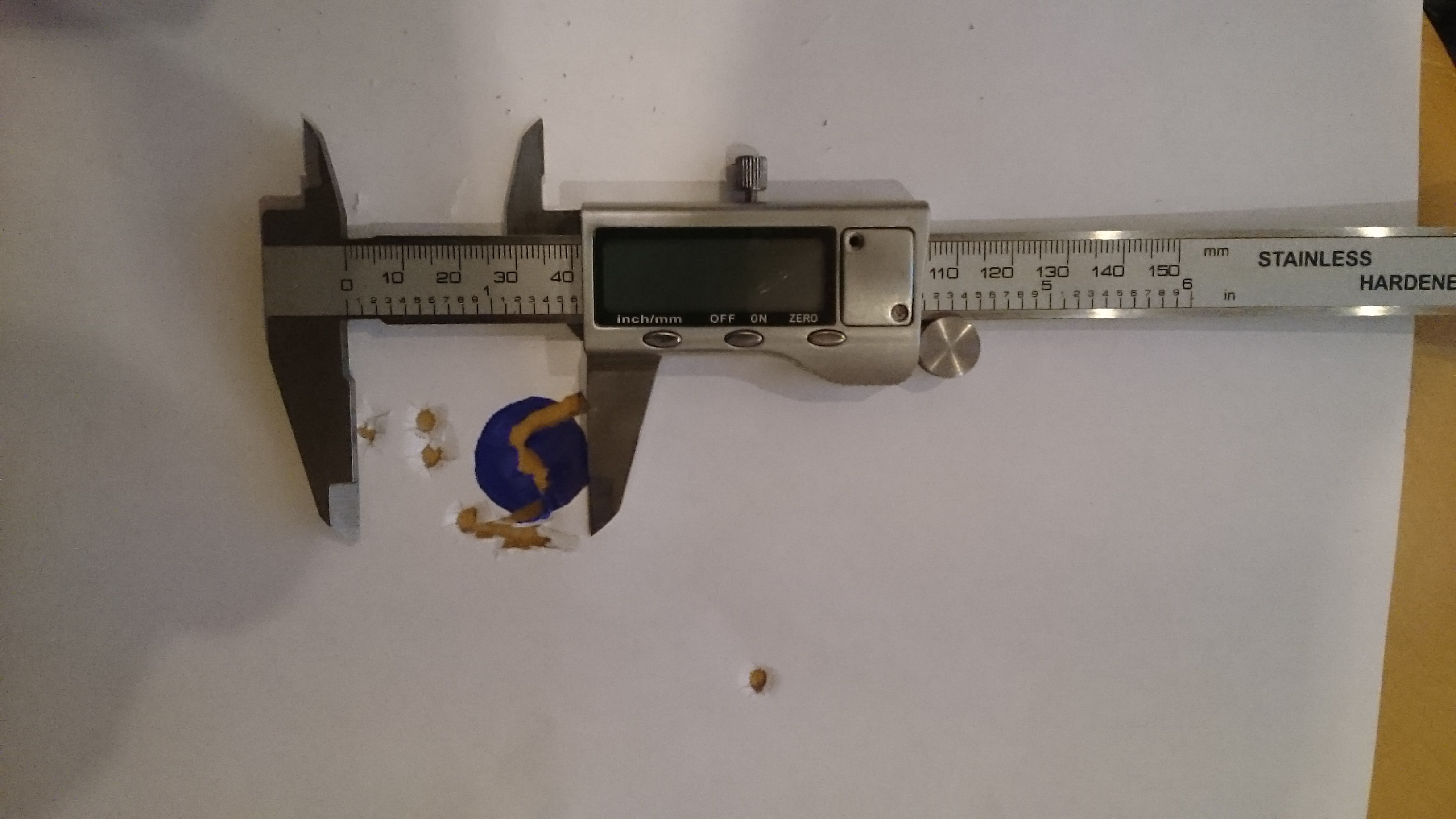 Пострелял на 50 метров, попытался пристрелять, но не очень удачно, всетаки надо станок склепать, с мешков нет стабильности. На фото результат дьяблой jsb 2,2 грамма, кучка собиралась в процессе пристрелки, попробывал после этого такуюже но 1,645 результатом остался не очень доволен. В мишень конечно летит но о кучности речь даже не идет. Обнаружился косячек. На дульном срезе, точнее на крышке модератора виден какойто след, будто пулька чиркает. что скажете, может чуть рассверлить крышку?