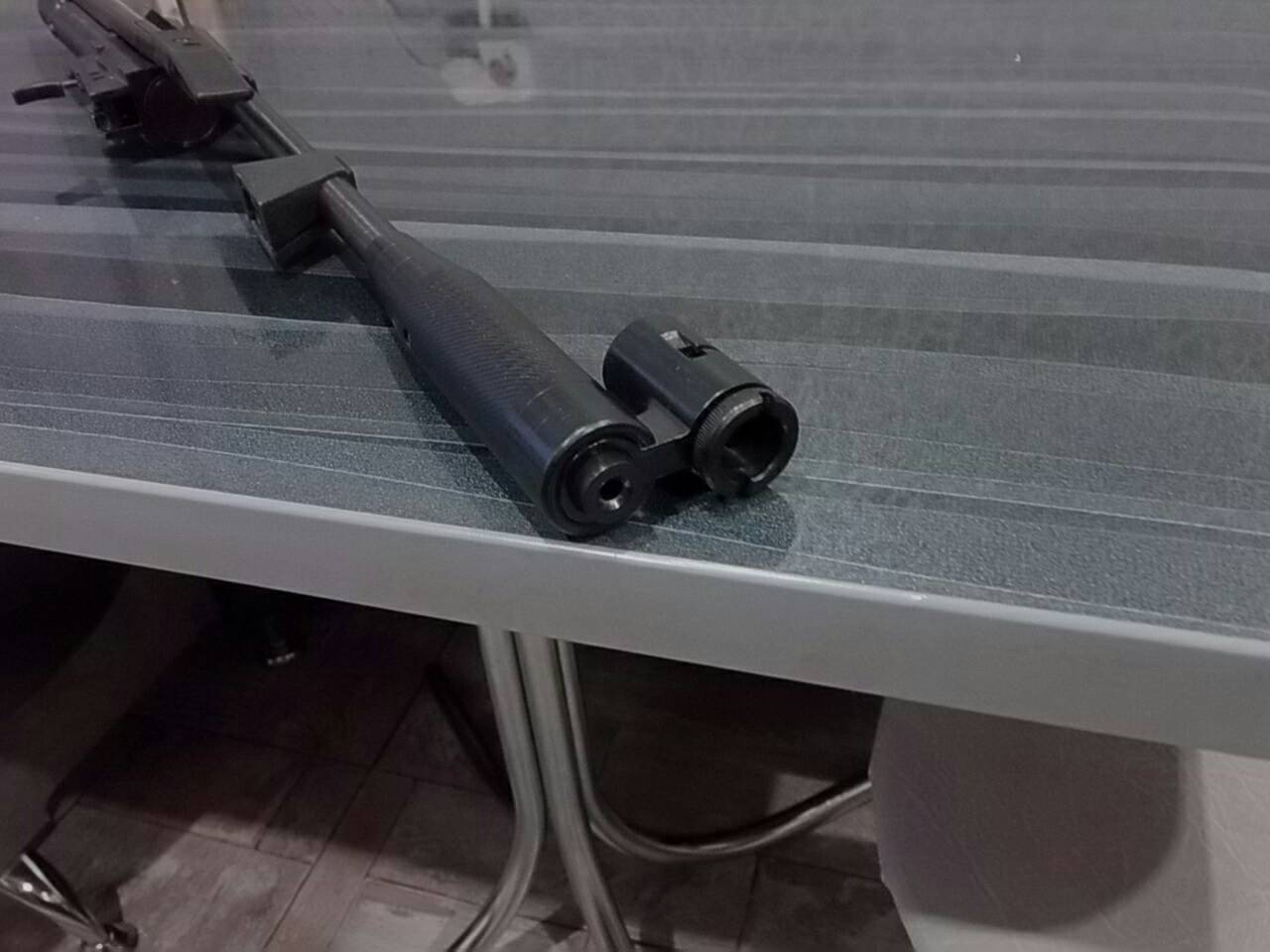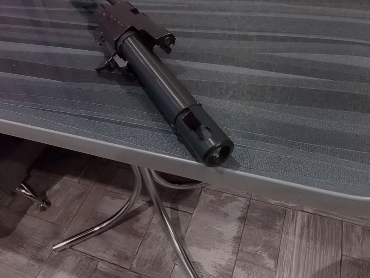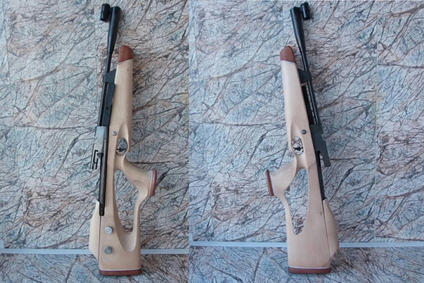 И как-то вспомнил-есть же у дружка-комрада «ИЖ-60»!!! Ну и предложил ему «нарядить» его металлического «Ёжика» в деревянный «костюм»,а пластиковую ложу оставить на возможный «апокалипсис». Подумалось-чем деревяху будут мухи метить,лучше её довести до ума и сделать приятную и нужную вещь для товарища.В общем самолично дружище прибыл ко мне в Витебск и передал своего «Ижика».Вынес некоторые пожелания, хотелки-весь будущий конструктив. Основным пожеланием была компактность. Был у него чехольчик маленький,так он с ним под скрипача успешно «косил».И в пластиковой ложе его «ИЖ» там очень хорошо помещался,хотелось ему и обновлённую версию носить в этом чехольчике в «консерваторию».Ствол винтовки был уже чуть отпилен и на него сделан шикарнейший надульник с родной металлической мушкой!Длины он не увеличивал-служил именно именно утяжелителем.Во красавец: Необходим был новый задник стальной в компрессор.С этим помог и также поучаствовал в проекте дружок Саня!Саша,спасибо!Отменная работа!!! Стоковый задник из лёгкого сплава был отложен.Также вместо штатного рычага взвода был поставлен отменно работающий новёхонький рычаг с пластиковой ручкой.Просто в рычаге родном заедало кнопку,а на ручке железной в конце крюк-и этот крюк упирался в ложу,а отпиливать и срезать совсем ничего не хотелось.Рычажок этот с ручкой «подсеял» всё тот же….ну конечно же Митька!!! Ещё раз спасибо за помощь и участие,Димка!!!!!