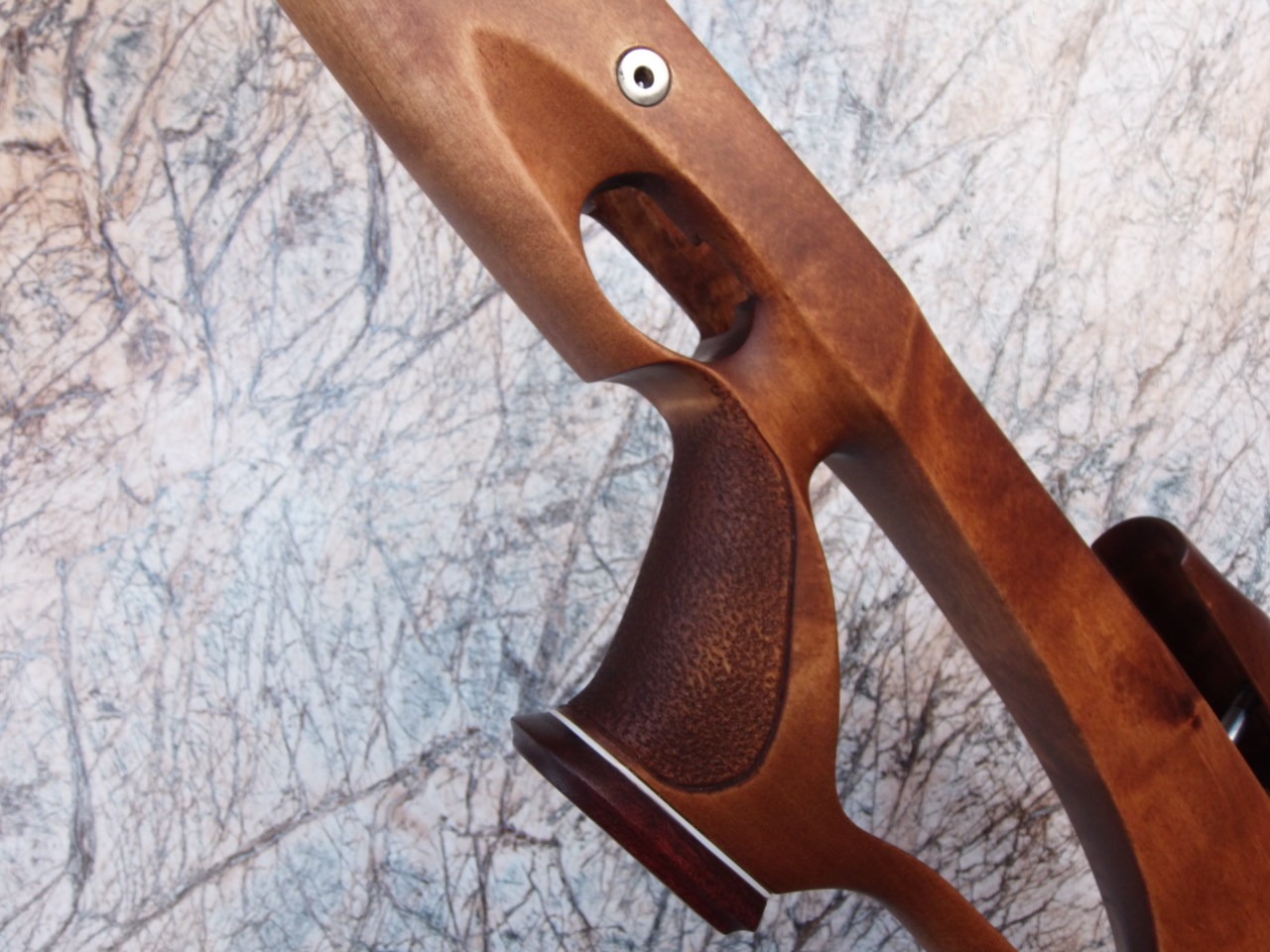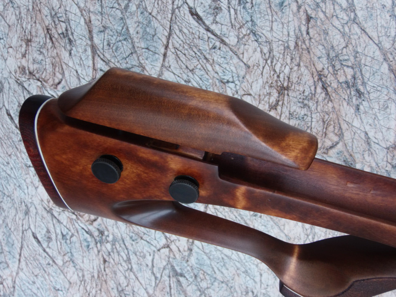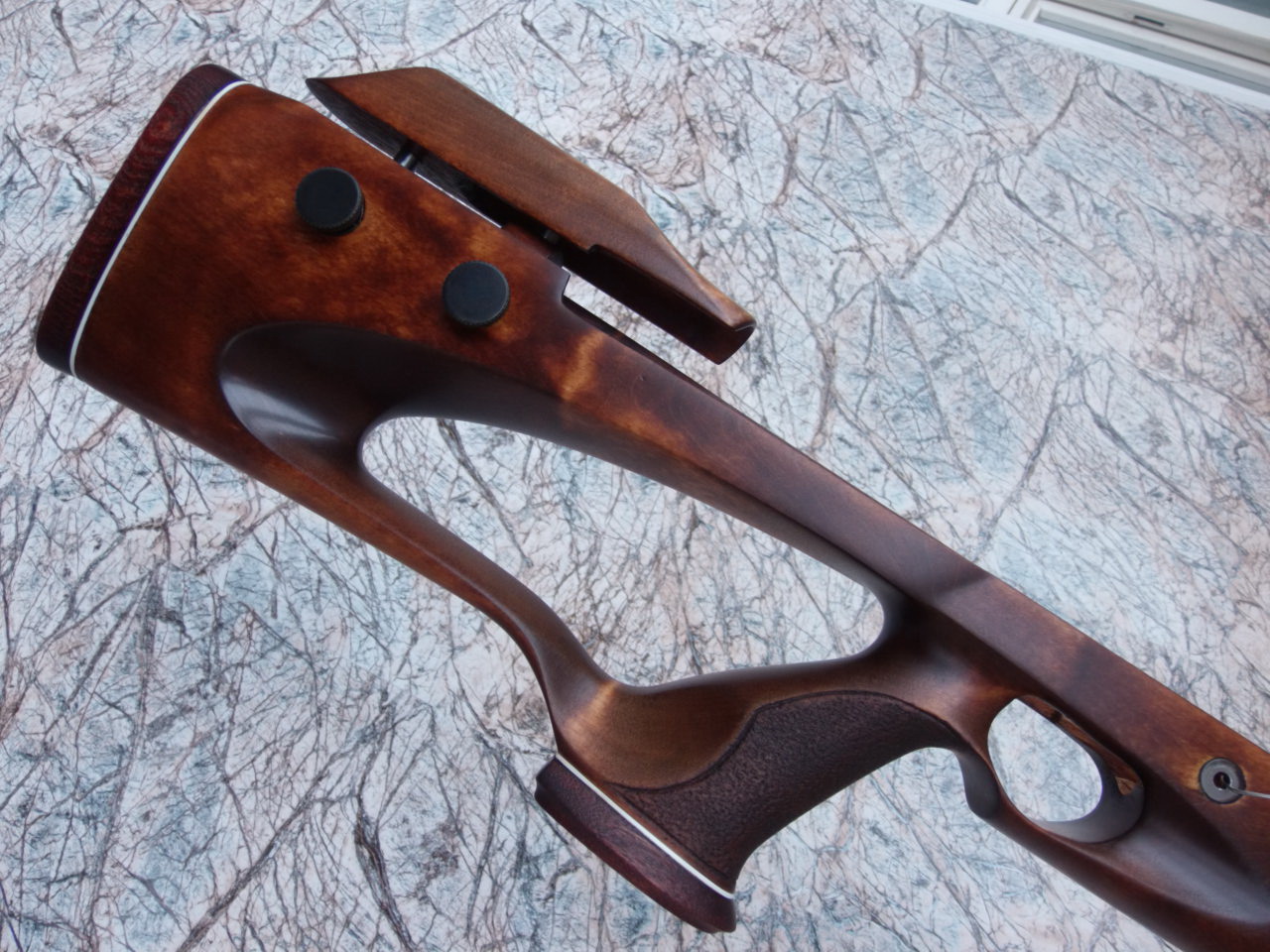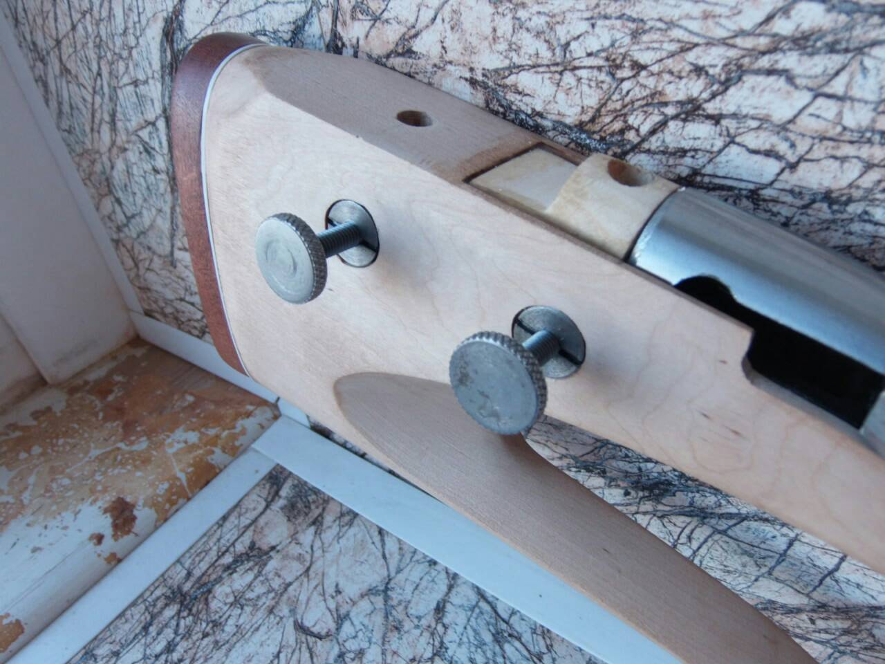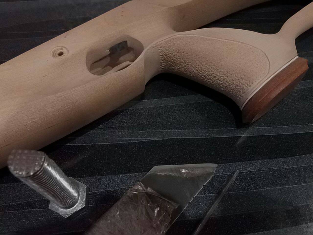 Первым делом занялся подгонкой.В ложе была выборка под резервуар.Её решено было заделать вклеенной вставкой.Чтобы сделать это-применил… не поверите! Кусок берёзового черенка от лопаты!!!Он по диаметру был едва ли не идеален для этого!Немножко подточил на станке до нужного и не шлифованный вклеил на место.Так в поры даже ЭДП лучше проник и соответственно лучше всё склеилось.После высыхания обработал и подогнал по нужным мне размерам по высоте. Ложа сделана из той же берёзы-так что всё соответствовало. Из индийской деревяхи красивой красной смастерил новый носик цевья.От сделанного цевья Димой отпилил нужную длину(прикидывал по пирамидке),на его место на шпильках и ЭДП присобачил новый красный нос через белую прокладочку из куска пластика от крышки электрокороба. Она тоненькая,изящно выглядит и отменно шлифуется,полируется.Получилось примерно так: На рукоять сделал также пяточку из той же индийской деревяхи.Также через прокладку и ЭДП+шпильки,закрепил это на основании рукоятки.Итог: Длина приклада для «заказчика» была великовата,потому отпилил нужное от приклада,из всё той же деревяшки присланной индусом,сделал я и белую прокладку,и затыльник приклада.Ну чтобы вязался между собой этот декор так сказать: Это здесь на фотках уже всё по ложе подогнано!На деле всё крепилось с допуском на обработку,и подгонял всё я уже по месту-сливал с ложей весь этот «прикид».Изготовленный Сашей задник мы укоротили.Выборку я Диму просил сделать на весь штатный задник,говорил он мне: «Давай на более короткий сделаю?Обрежешь же потом всё равно?» Нет же-не послушал!В общем отпилил и заворонил его: Для крепежа щеки приклада на шпильках(шпильки врезаны в эту щеку на резьбе с ЭДП),выточил из стали 2 маховика с накаткой и резьбой М6 и 2 втулки под эти маховики с той же внутренней резьбой.Как бы и не нужна была щека регулируемая,хватало стрелку и в сложенном виде высоты прицеливания в диоптр,но щека эта закрывала и задник компрессора,и кусок его самого,да к тому же и то безобразие что я смудрил…За помощь в изготовлении втулок скажу дружку Артёму огромное СПАСИБО!!! А чтобы закрыть лишнюю выборку за задником компрессора-вклеил я в неё вставочку из той же берёзы.Также выточил новые крепёжные винты в боковины ложи с более массивными шляпками под шлиц.Передний крепёжный винт в пирамидку был найден готовый-изменил форму шляпки и сделал его также под шлиц.Во все крепёжные отверстия под эти винты были вклеены стальные шайбы для жёсткости.Железяки эти в нужных местах чуть позже заворонил.А теперь пояснения фотками.Вклеенная вставка за компрессором и выточенные маховики с втулками(не зачищено): Это сама регулируемая щека со шпильками на резьбе+ЭДП: Это уже воронёные выточенные железяки в полном составе: Ну и после зачистки высохшего ЭДП в месте вклейки вставки берёзовой за задником,собрал «для посмотреть» получающееся на тот момент.Вставил «ИЖ» в ложу,закрутил три крепёжных винта,вставил на место щеку шпильками в отверстиях в ложе,затянул маховичками.Втулки под маховики были закручены пока только на резьбу-была нарезана на внешней стороне их именно резьба с крупным зубом.А на самой втулке с лицевой стороны сделан пропил под широкую шлицевую отвёртку.Потребовалось несколько минут чтобы просверлить в ложе 2 отверстия на нужную глубину и необходимыми диамет
