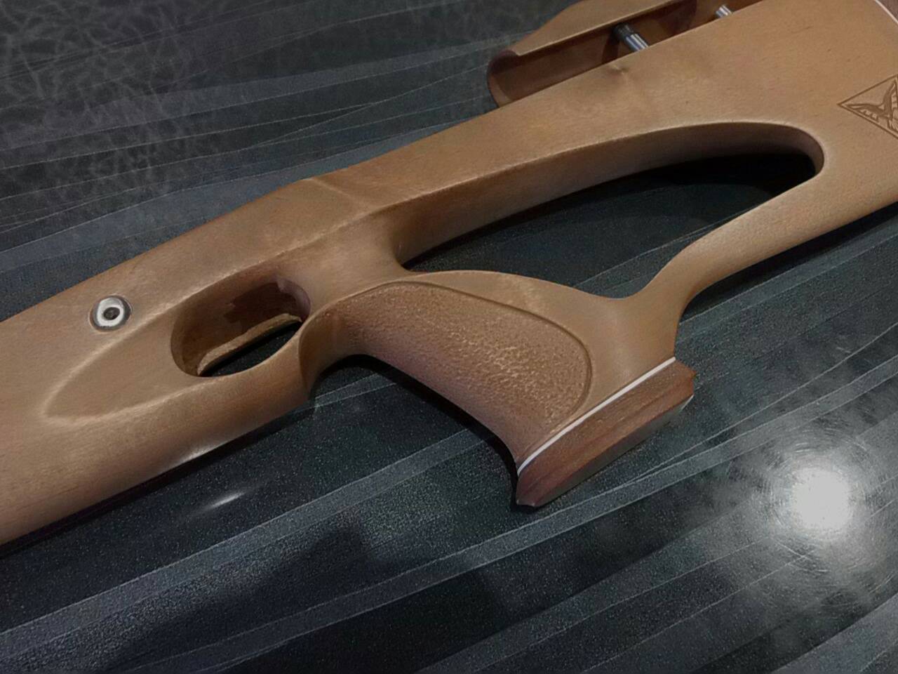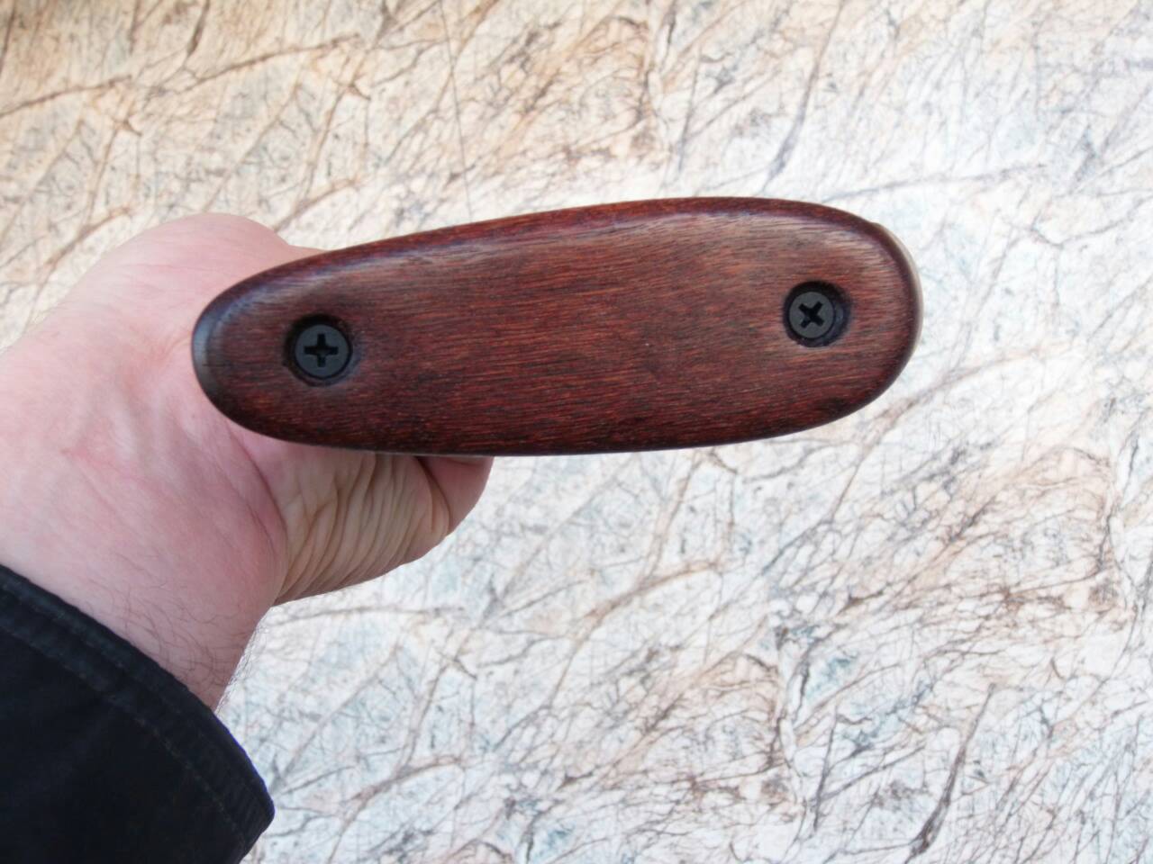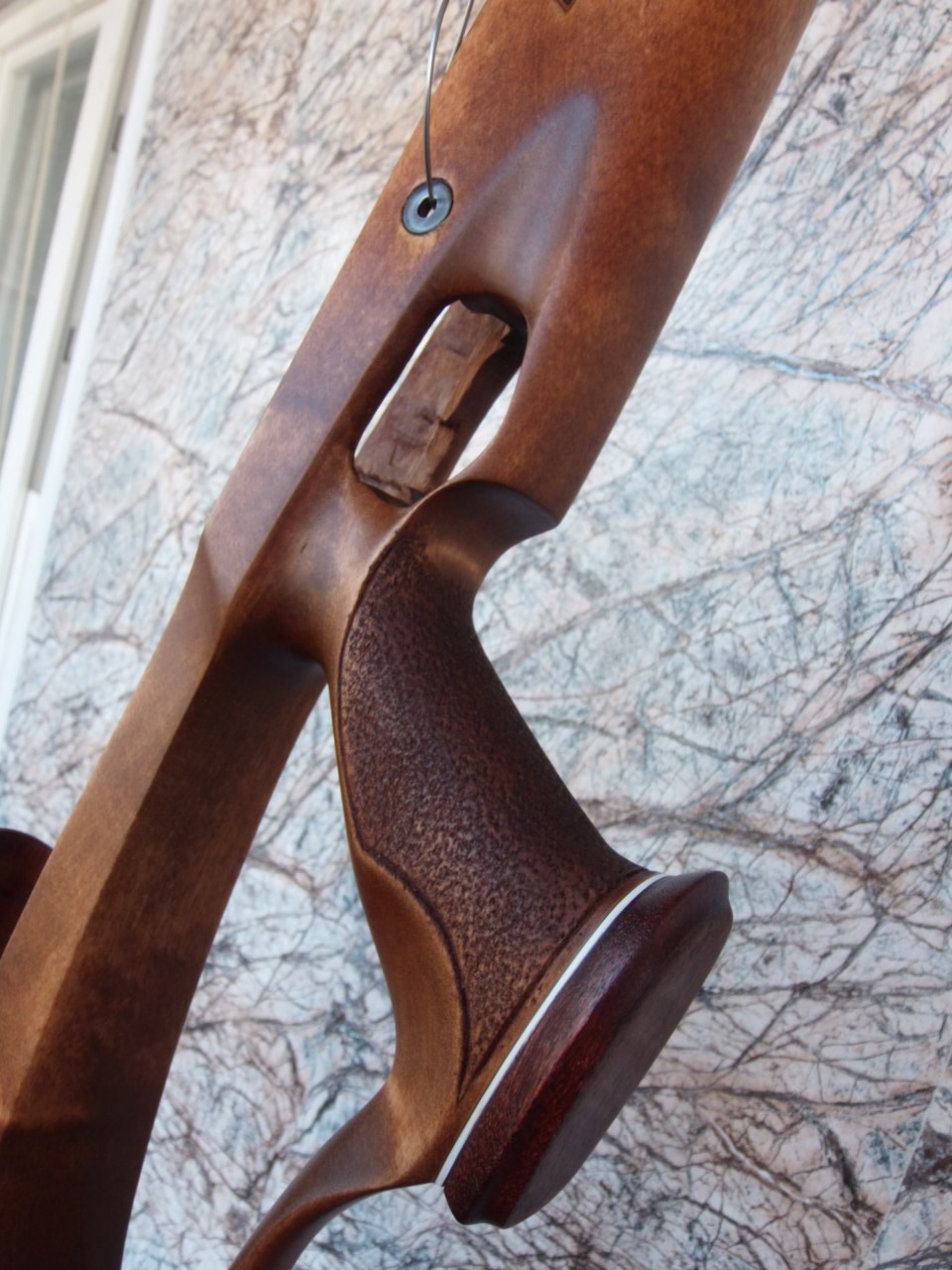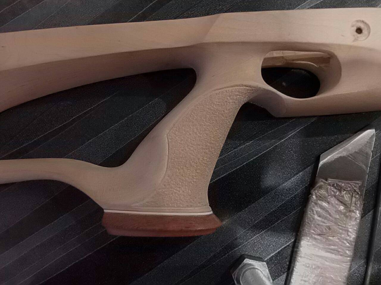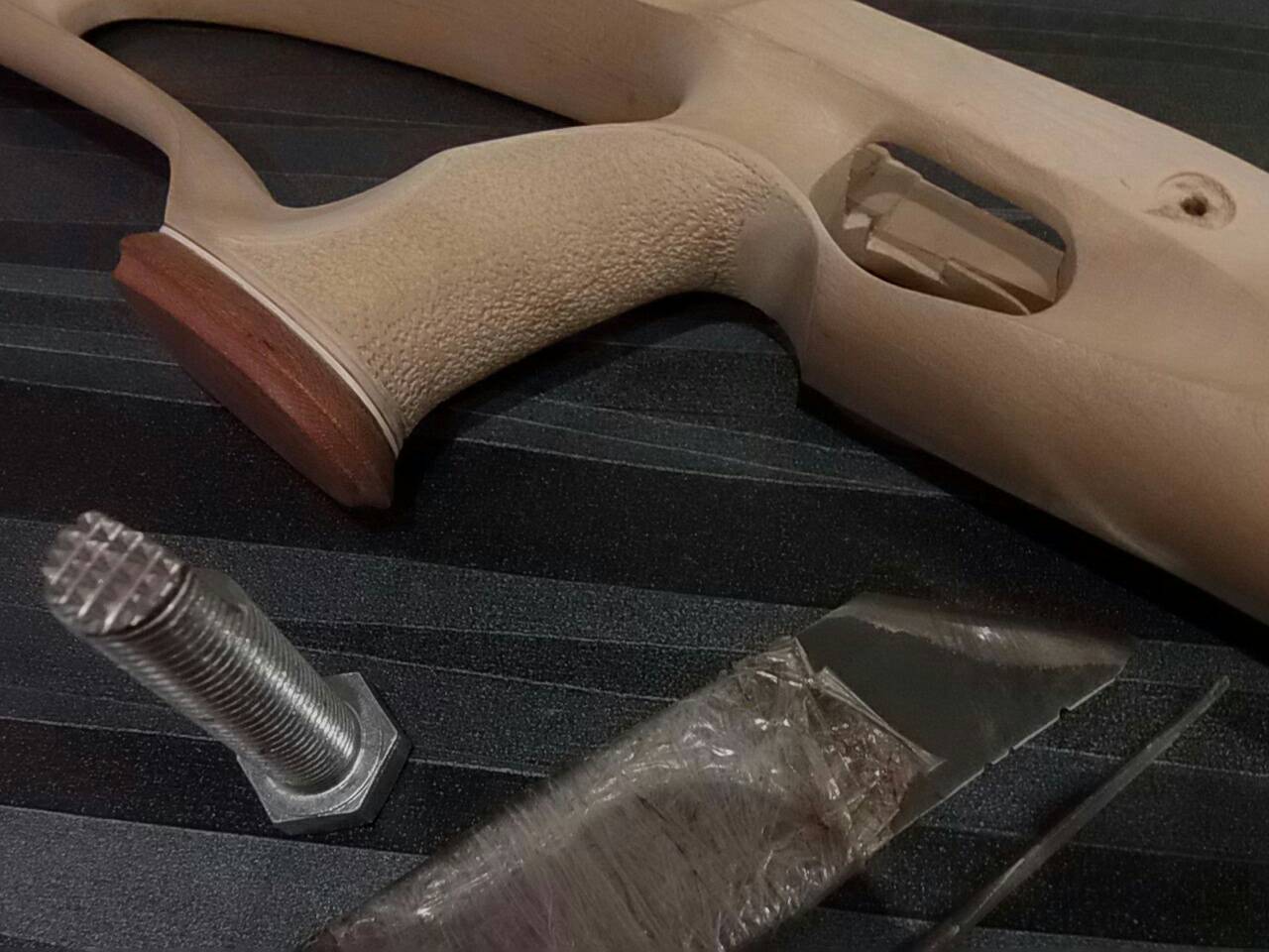 Первым делом занялся подгонкой.В ложе была выборка под резервуар.Её решено было заделать вклеенной вставкой.Чтобы сделать это-применил… не поверите! Кусок берёзового черенка от лопаты!!!Он по диаметру был едва ли не идеален для этого!Немножко подточил на станке до нужного и не шлифованный вклеил на место.Так в поры даже ЭДП лучше проник и соответственно лучше всё склеилось.После высыхания обработал и подогнал по нужным мне размерам по высоте. Ложа сделана из той же берёзы-так что всё соответствовало. Из индийской деревяхи красивой красной смастерил новый носик цевья.От сделанного цевья Димой отпилил нужную длину(прикидывал по пирамидке),на его место на шпильках и ЭДП присобачил новый красный нос через белую прокладочку из куска пластика от крышки электрокороба. Она тоненькая,изящно выглядит и отменно шлифуется,полируется.Получилось примерно так: На рукоять сделал также пяточку из той же индийской деревяхи.Также через прокладку и ЭДП+шпильки,закрепил это на основании рукоятки.Итог: Длина приклада для «заказчика» была великовата,потому отпилил нужное от приклада,из всё той же деревяшки присланной индусом,сделал я и белую прокладку,и затыльник приклада.Ну чтобы вязался между собой этот декор так сказать: Это здесь на фотках уже всё по ложе подогнано!На деле всё крепилось с допуском на обработку,и подгонял всё я уже по месту-сливал с ложей весь этот «прикид».Изготовленный Сашей задник мы укоротили.Выборку я Диму просил сделать на весь штатный задник,говорил он мне: «Давай на более короткий сделаю?Обрежешь же потом всё равно?» Нет же-не послушал!В общем отпилил и заворонил его: Для крепежа щеки приклада на шпильках(шпильки врезаны в эту щеку на резьбе с ЭДП),выточил из стали 2 маховика с накаткой и резьбой М6 и 2 втулки под эти маховики с той же внутренней резьбой.Как бы и не нужна была щека регулируемая,хватало стрелку и в сложенном виде высоты прицеливания в диоптр,но щека эта закрывала и задник компрессора,и кусок его самого,да к тому же и то безобразие что я смудрил…За помощь в изготовлении втулок скажу дружку Артёму огромное СПАСИБО!!! А чтобы закрыть лишнюю выборку за задником компрессора-вклеил я в неё вставочку из той же берёзы.Также выточил новые крепёжные винты в боковины ложи с более массивными шляпками под шлиц.Передний крепёжный винт в пирамидку был найден готовый-изменил форму шляпки и сделал его также под шлиц.Во все крепёжные отверстия под эти винты были вклеены стальные шайбы для жёсткости.Железяки эти в нужных местах чуть позже заворонил.А теперь пояснения фотками.Вклеенная вставка за компрессором и выточенные маховики с втулками(не зачищено): Это сама регулируемая щека со шпильками на резьбе+ЭДП: Это уже воронёные выточенные железяки в полном составе: Ну и после зачистки высохшего ЭДП в месте вклейки вставки берёзовой за задником,собрал «для посмотреть» получающееся на тот момент.Вставил «ИЖ» в ложу,закрутил три крепёжных винта,вставил на место щеку шпильками в отверстиях в ложе,затянул маховичками.Втулки под маховики были закручены пока только на резьбу-была нарезана на внешней стороне их именно резьба с крупным зубом.А на самой втулке с лицевой стороны сделан пропил под широкую шлицевую отвёртку.Потребовалось несколько минут чтобы просверлить в ложе 2 отверстия на нужную глубину и необходимыми диамет