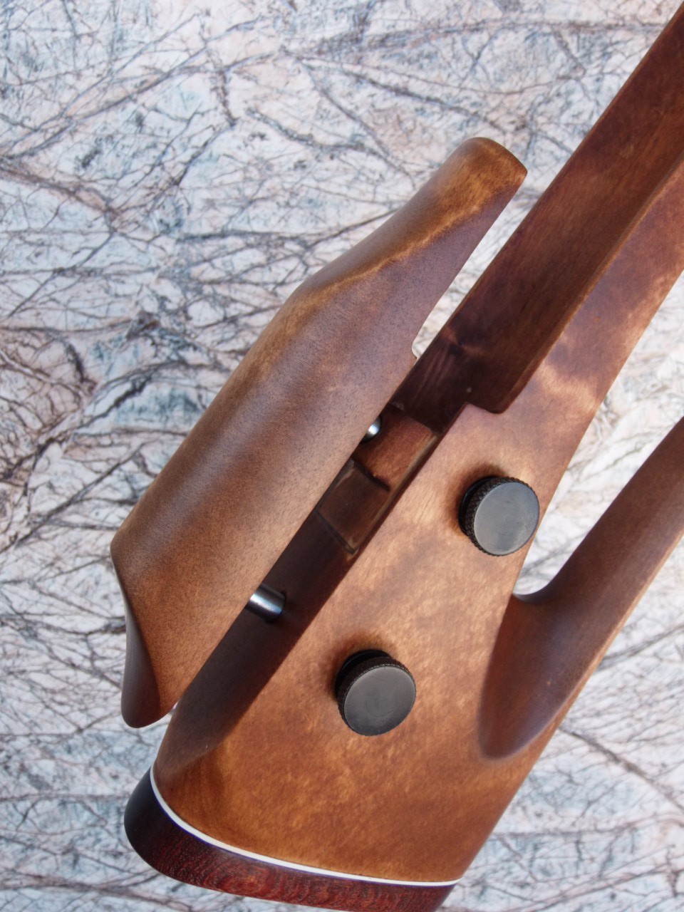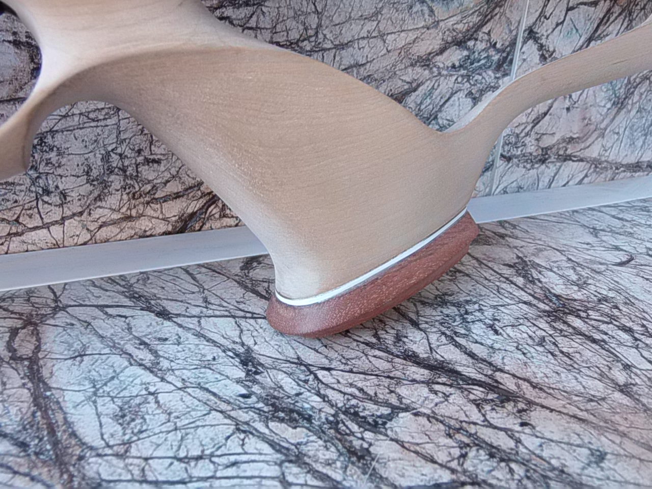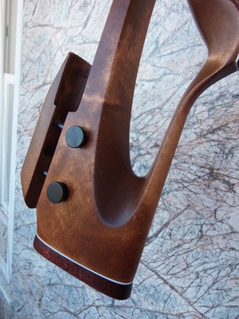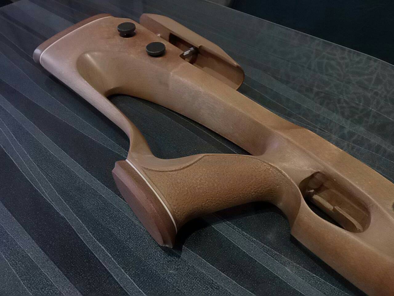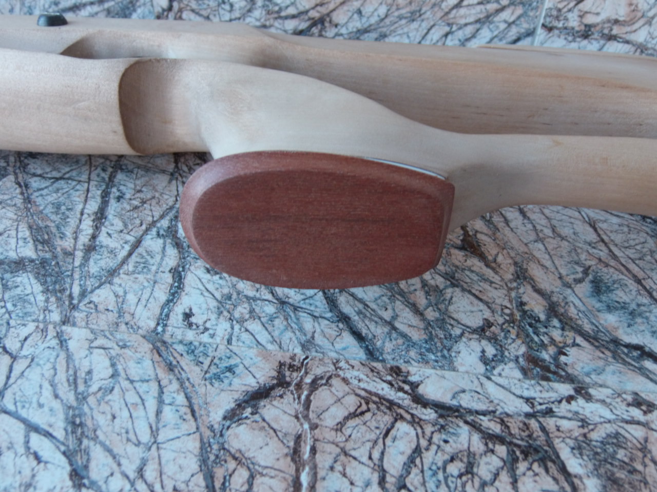 Первым делом занялся подгонкой.В ложе была выборка под резервуар.Её решено было заделать вклеенной вставкой.Чтобы сделать это-применил… не поверите! Кусок берёзового черенка от лопаты!!!Он по диаметру был едва ли не идеален для этого!Немножко подточил на станке до нужного и не шлифованный вклеил на место.Так в поры даже ЭДП лучше проник и соответственно лучше всё склеилось.После высыхания обработал и подогнал по нужным мне размерам по высоте. Ложа сделана из той же берёзы-так что всё соответствовало. Из индийской деревяхи красивой красной смастерил новый носик цевья.От сделанного цевья Димой отпилил нужную длину(прикидывал по пирамидке),на его место на шпильках и ЭДП присобачил новый красный нос через белую прокладочку из куска пластика от крышки электрокороба. Она тоненькая,изящно выглядит и отменно шлифуется,полируется.Получилось примерно так: На рукоять сделал также пяточку из той же индийской деревяхи.Также через прокладку и ЭДП+шпильки,закрепил это на основании рукоятки.Итог: Длина приклада для «заказчика» была великовата,потому отпилил нужное от приклада,из всё той же деревяшки присланной индусом,сделал я и белую прокладку,и затыльник приклада.Ну чтобы вязался между собой этот декор так сказать: Это здесь на фотках уже всё по ложе подогнано!На деле всё крепилось с допуском на обработку,и подгонял всё я уже по месту-сливал с ложей весь этот «прикид».Изготовленный Сашей задник мы укоротили.Выборку я Диму просил сделать на весь штатный задник,говорил он мне: «Давай на более короткий сделаю?Обрежешь же потом всё равно?» Нет же-не послушал!В общем отпилил и заворонил его: Для крепежа щеки приклада на шпильках(шпильки врезаны в эту щеку на резьбе с ЭДП),выточил из стали 2 маховика с накаткой и резьбой М6 и 2 втулки под эти маховики с той же внутренней резьбой.Как бы и не нужна была щека регулируемая,хватало стрелку и в сложенном виде высоты прицеливания в диоптр,но щека эта закрывала и задник компрессора,и кусок его самого,да к тому же и то безобразие что я смудрил…За помощь в изготовлении втулок скажу дружку Артёму огромное СПАСИБО!!! А чтобы закрыть лишнюю выборку за задником компрессора-вклеил я в неё вставочку из той же берёзы.Также выточил новые крепёжные винты в боковины ложи с более массивными шляпками под шлиц.Передний крепёжный винт в пирамидку был найден готовый-изменил форму шляпки и сделал его также под шлиц.Во все крепёжные отверстия под эти винты были вклеены стальные шайбы для жёсткости.Железяки эти в нужных местах чуть позже заворонил.А теперь пояснения фотками.Вклеенная вставка за компрессором и выточенные маховики с втулками(не зачищено): Это сама регулируемая щека со шпильками на резьбе+ЭДП: Это уже воронёные выточенные железяки в полном составе: Ну и после зачистки высохшего ЭДП в месте вклейки вставки берёзовой за задником,собрал «для посмотреть» получающееся на тот момент.Вставил «ИЖ» в ложу,закрутил три крепёжных винта,вставил на место щеку шпильками в отверстиях в ложе,затянул маховичками.Втулки под маховики были закручены пока только на резьбу-была нарезана на внешней стороне их именно резьба с крупным зубом.А на самой втулке с лицевой стороны сделан пропил под широкую шлицевую отвёртку.Потребовалось несколько минут чтобы просверлить в ложе 2 отверстия на нужную глубину и необходимыми диамет