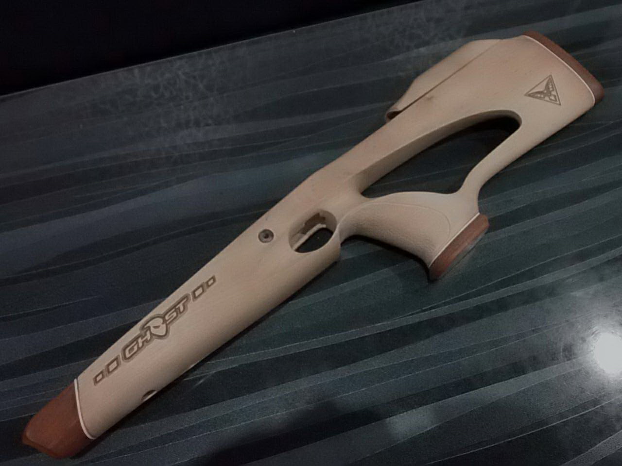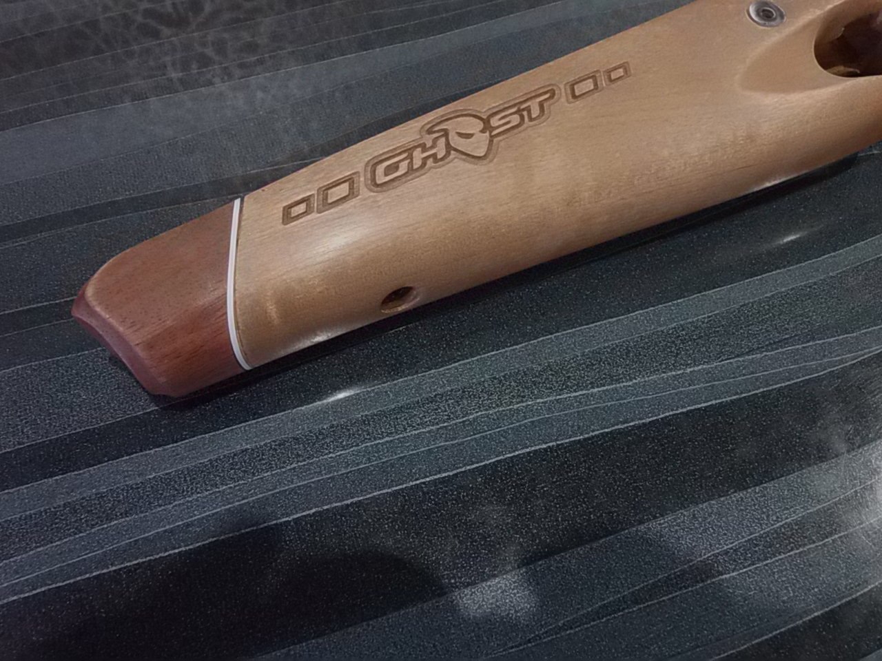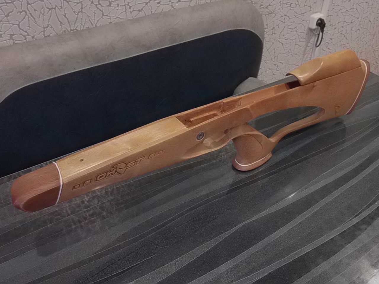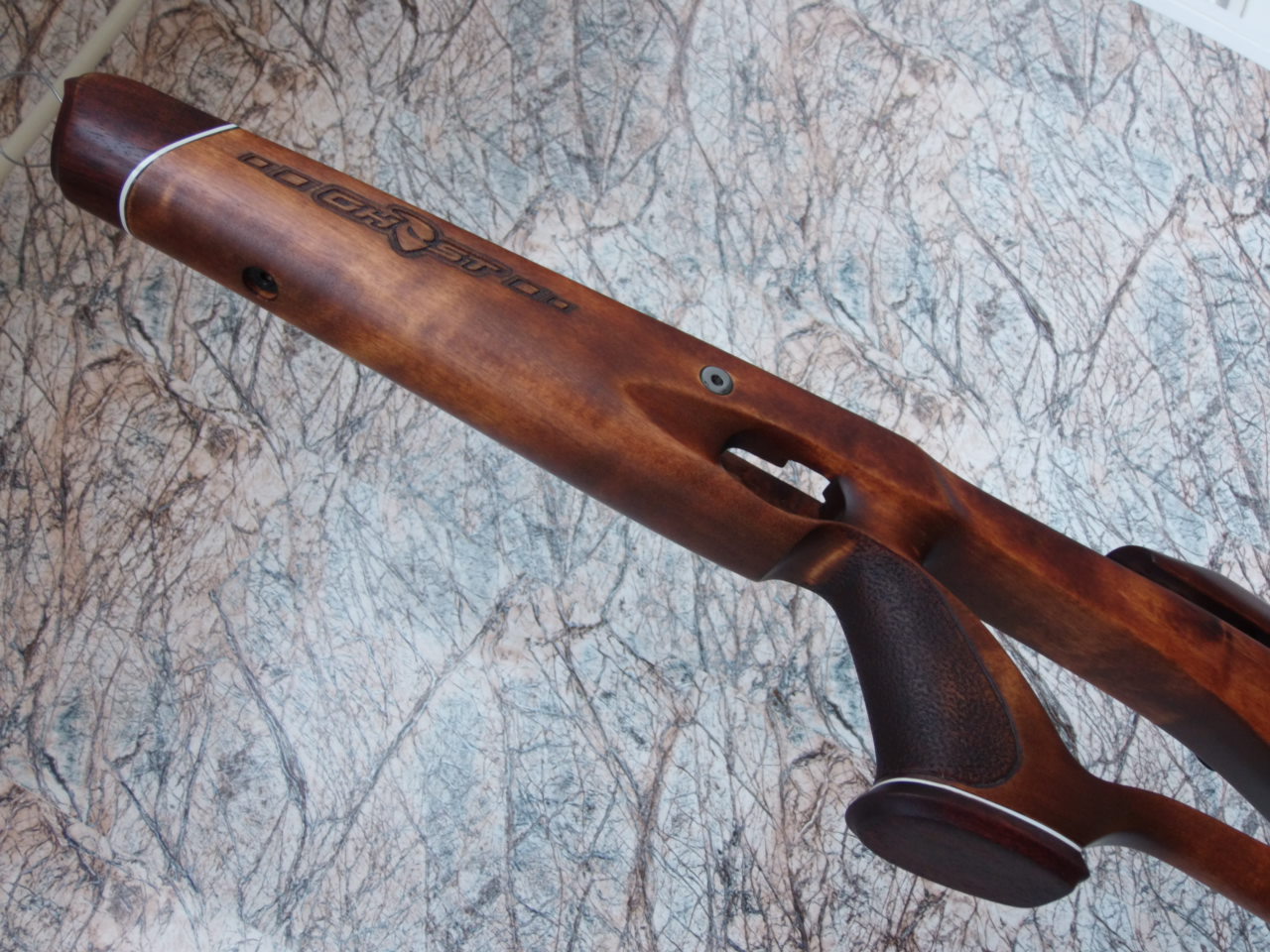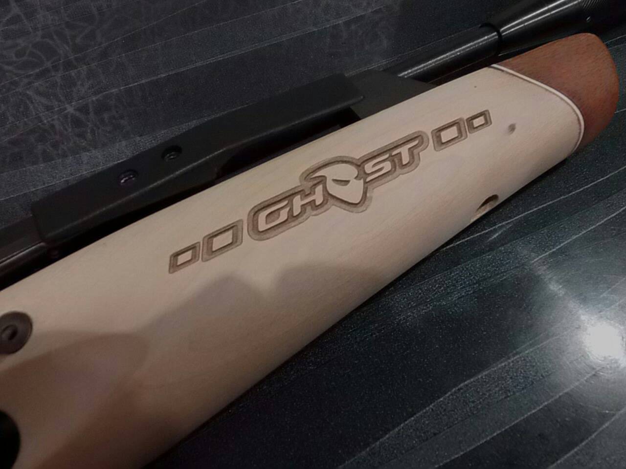 После решил дополнить декорирование ложи лазерной гравировкой. Рабочее название ложи было «Призрак»-уж простите,но люблю я давать своим изделиям какие-нибудь «погремухи».Именно такую «татуировку» решил я нанести в боках ложи.Служила она не только в плане декора,но и была полезна в хвате за цевьё.Также как и на наколотке рука по этим логотипам не скользила.Получилось собственно так: На память товарищу нанёс на левой стороне приклада свой логотипчик: Ну а в сборе с этими элементами вот таким стал ИЖик: Снова разобрал винтовку,выкрутил из ложи и втулочки под маховики.Начал окончательную зачистку ложи перед пропиткой.Наждачка была разной.От средней до самой мелкой нулёвки.Деревяха была казалось бы как стекло. Но ворс конечно был скрыт.Чтобы его убрать-пошёл уже привычным путём. Мочил мягкую тряпочку чистую в кипятке,отжимал её как можно лучше и натирал этой тряпочкой ложу.После подсыхания влаги на древесине стал подниматься тот самый ворс!Снова наждачку в руки-теперь от 600 до 1500 заново зачистил ложу.Потом ещё раз повторил привычную процедуру тряпочка+кипяток. После подсыхания(а сохнет быстро потому что не мокрая тряпка,а именно ВЛАЖНАЯ!) снова зачистил ложу от 800 до 1500 нулёвки.И ещё раз проверил тряпкой влажной ворс(уже третий)-вот теперь ворса не было вообще!Напоследок прошёлся наждачкой строго по волокнам по всем поверхностям ложи наждачкой 1500-2000-2200. «Буратинка» была готова к морению и пропитке на все 100%.