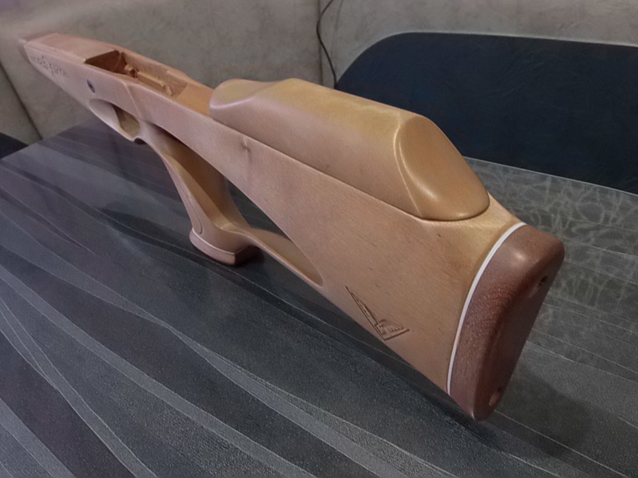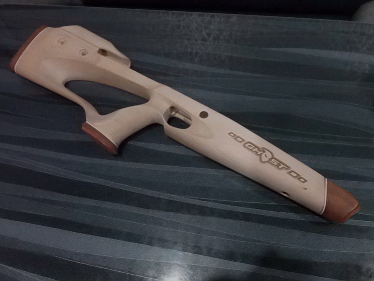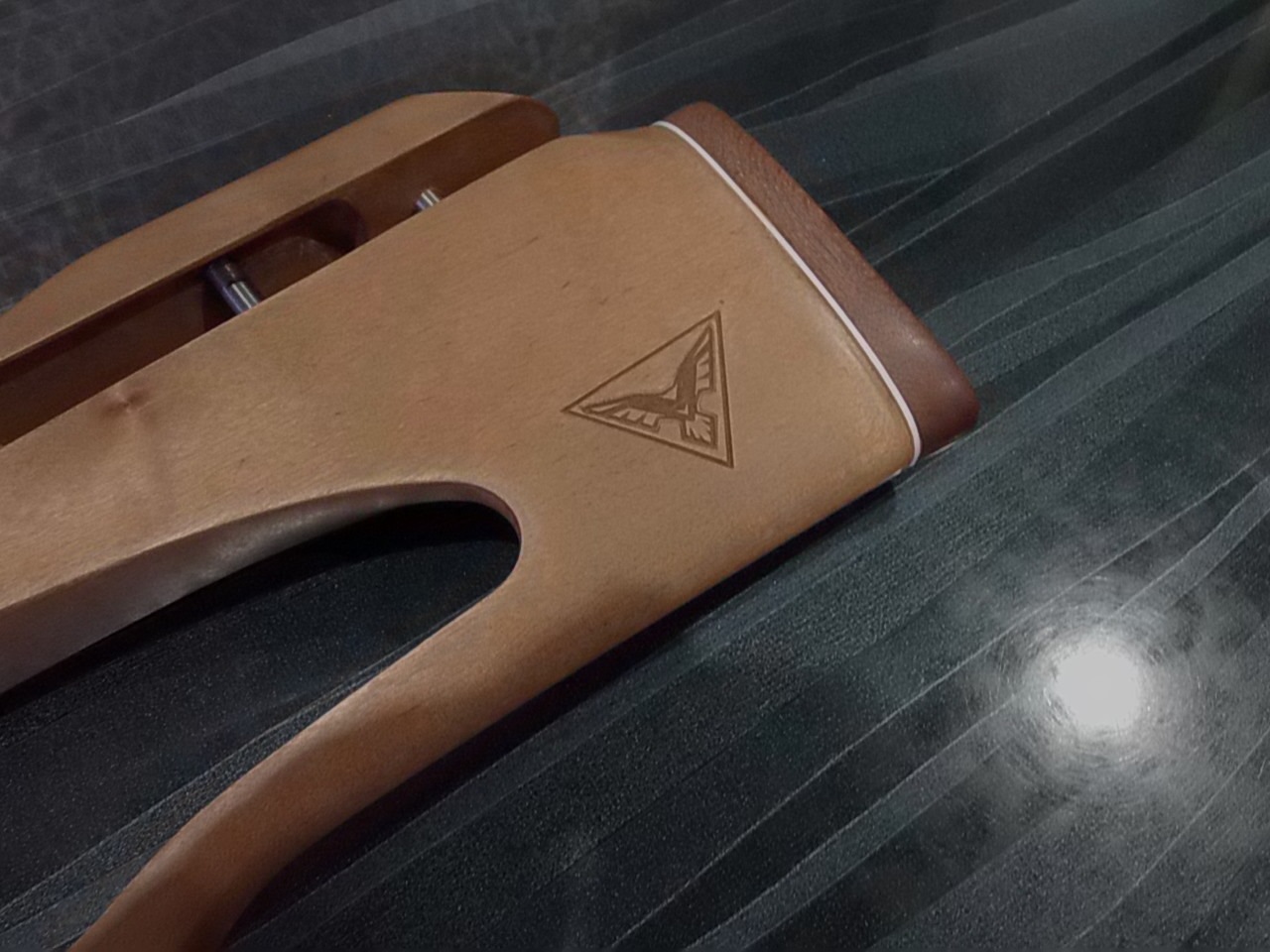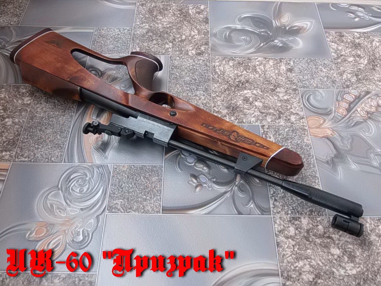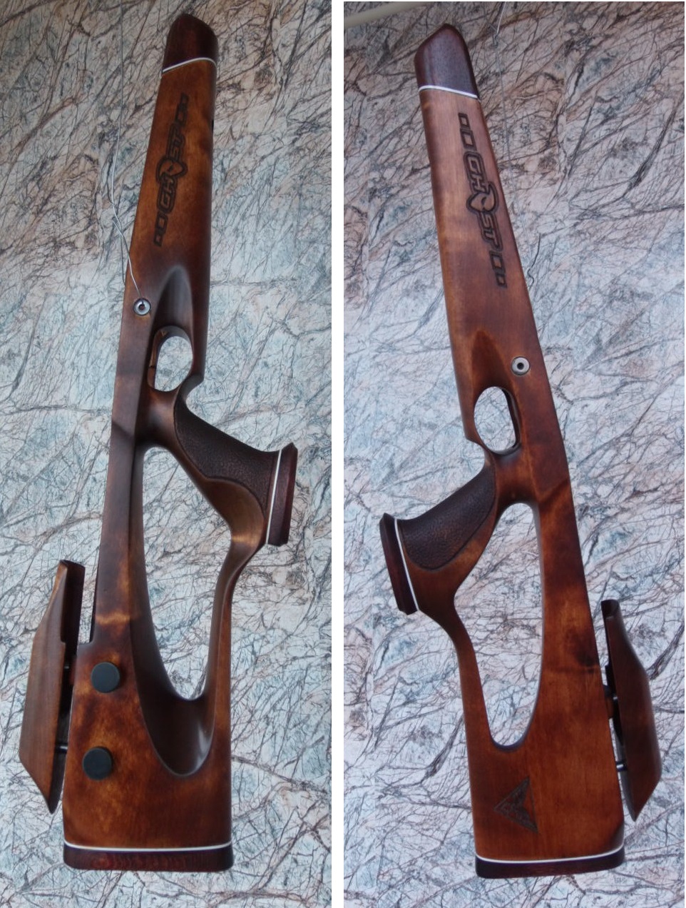 После решил дополнить декорирование ложи лазерной гравировкой. Рабочее название ложи было «Призрак»-уж простите,но люблю я давать своим изделиям какие-нибудь «погремухи».Именно такую «татуировку» решил я нанести в боках ложи.Служила она не только в плане декора,но и была полезна в хвате за цевьё.Также как и на наколотке рука по этим логотипам не скользила.Получилось собственно так: На память товарищу нанёс на левой стороне приклада свой логотипчик: Ну а в сборе с этими элементами вот таким стал ИЖик: Снова разобрал винтовку,выкрутил из ложи и втулочки под маховики.Начал окончательную зачистку ложи перед пропиткой.Наждачка была разной.От средней до самой мелкой нулёвки.Деревяха была казалось бы как стекло. Но ворс конечно был скрыт.Чтобы его убрать-пошёл уже привычным путём. Мочил мягкую тряпочку чистую в кипятке,отжимал её как можно лучше и натирал этой тряпочкой ложу.После подсыхания влаги на древесине стал подниматься тот самый ворс!Снова наждачку в руки-теперь от 600 до 1500 заново зачистил ложу.Потом ещё раз повторил привычную процедуру тряпочка+кипяток. После подсыхания(а сохнет быстро потому что не мокрая тряпка,а именно ВЛАЖНАЯ!) снова зачистил ложу от 800 до 1500 нулёвки.И ещё раз проверил тряпкой влажной ворс(уже третий)-вот теперь ворса не было вообще!Напоследок прошёлся наждачкой строго по волокнам по всем поверхностям ложи наждачкой 1500-2000-2200. «Буратинка» была готова к морению и пропитке на все 100%.