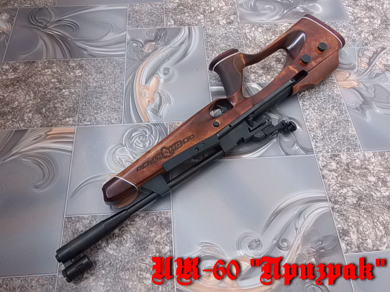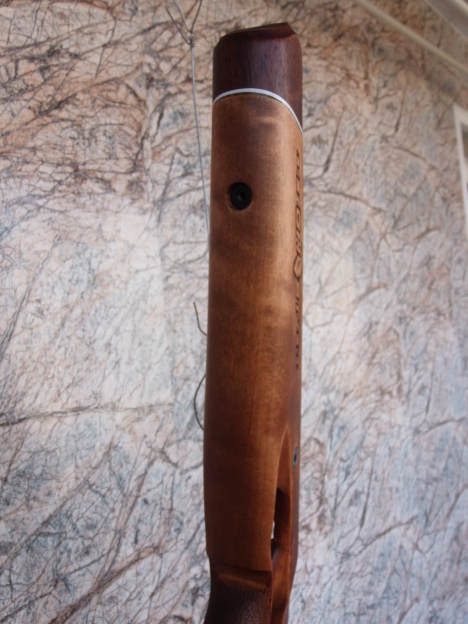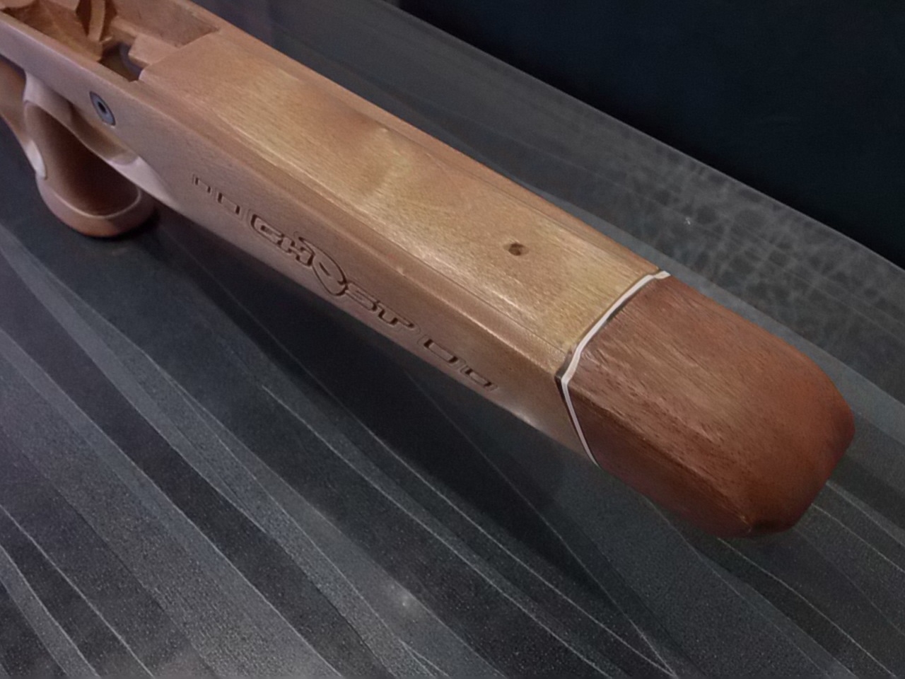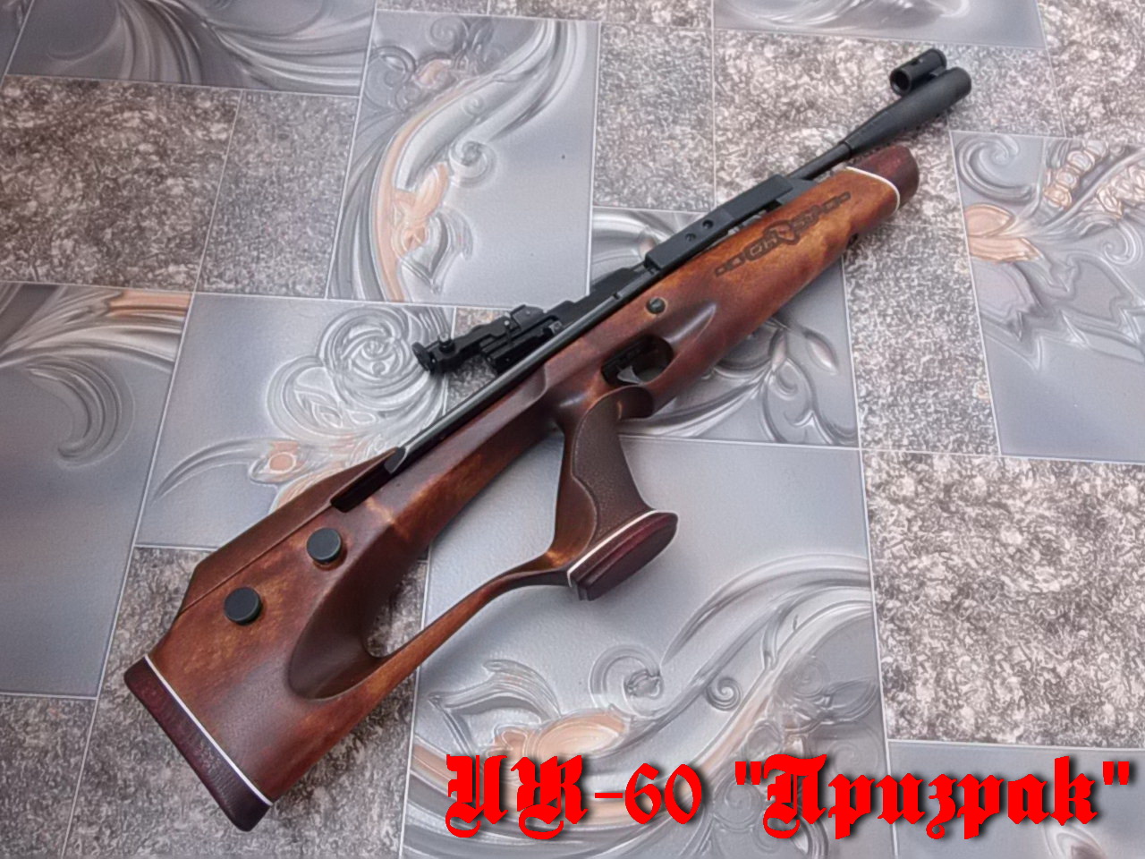 После решил дополнить декорирование ложи лазерной гравировкой. Рабочее название ложи было «Призрак»-уж простите,но люблю я давать своим изделиям какие-нибудь «погремухи».Именно такую «татуировку» решил я нанести в боках ложи.Служила она не только в плане декора,но и была полезна в хвате за цевьё.Также как и на наколотке рука по этим логотипам не скользила.Получилось собственно так: На память товарищу нанёс на левой стороне приклада свой логотипчик: Ну а в сборе с этими элементами вот таким стал ИЖик: Снова разобрал винтовку,выкрутил из ложи и втулочки под маховики.Начал окончательную зачистку ложи перед пропиткой.Наждачка была разной.От средней до самой мелкой нулёвки.Деревяха была казалось бы как стекло. Но ворс конечно был скрыт.Чтобы его убрать-пошёл уже привычным путём. Мочил мягкую тряпочку чистую в кипятке,отжимал её как можно лучше и натирал этой тряпочкой ложу.После подсыхания влаги на древесине стал подниматься тот самый ворс!Снова наждачку в руки-теперь от 600 до 1500 заново зачистил ложу.Потом ещё раз повторил привычную процедуру тряпочка+кипяток. После подсыхания(а сохнет быстро потому что не мокрая тряпка,а именно ВЛАЖНАЯ!) снова зачистил ложу от 800 до 1500 нулёвки.И ещё раз проверил тряпкой влажной ворс(уже третий)-вот теперь ворса не было вообще!Напоследок прошёлся наждачкой строго по волокнам по всем поверхностям ложи наждачкой 1500-2000-2200. «Буратинка» была готова к морению и пропитке на все 100%.