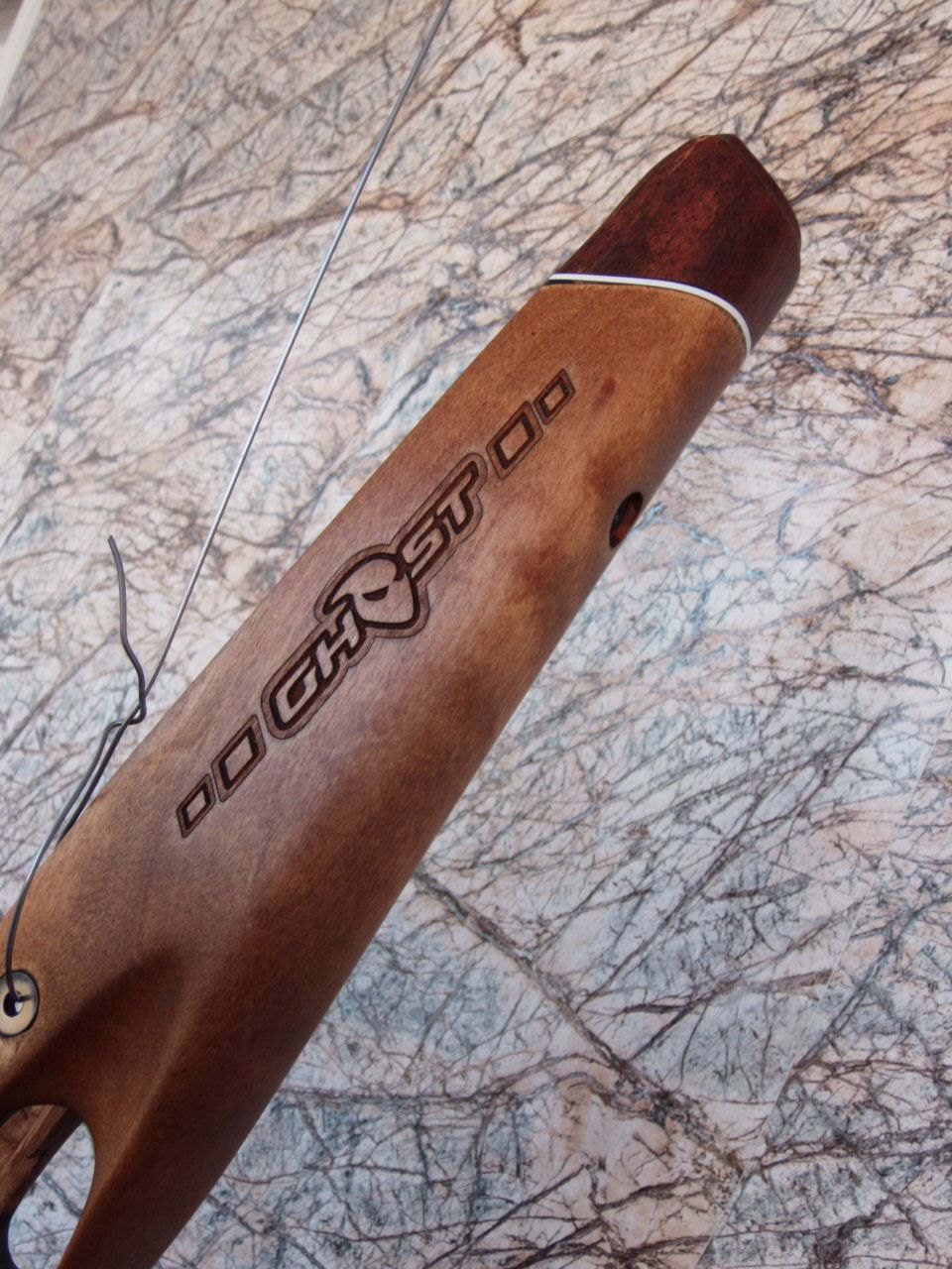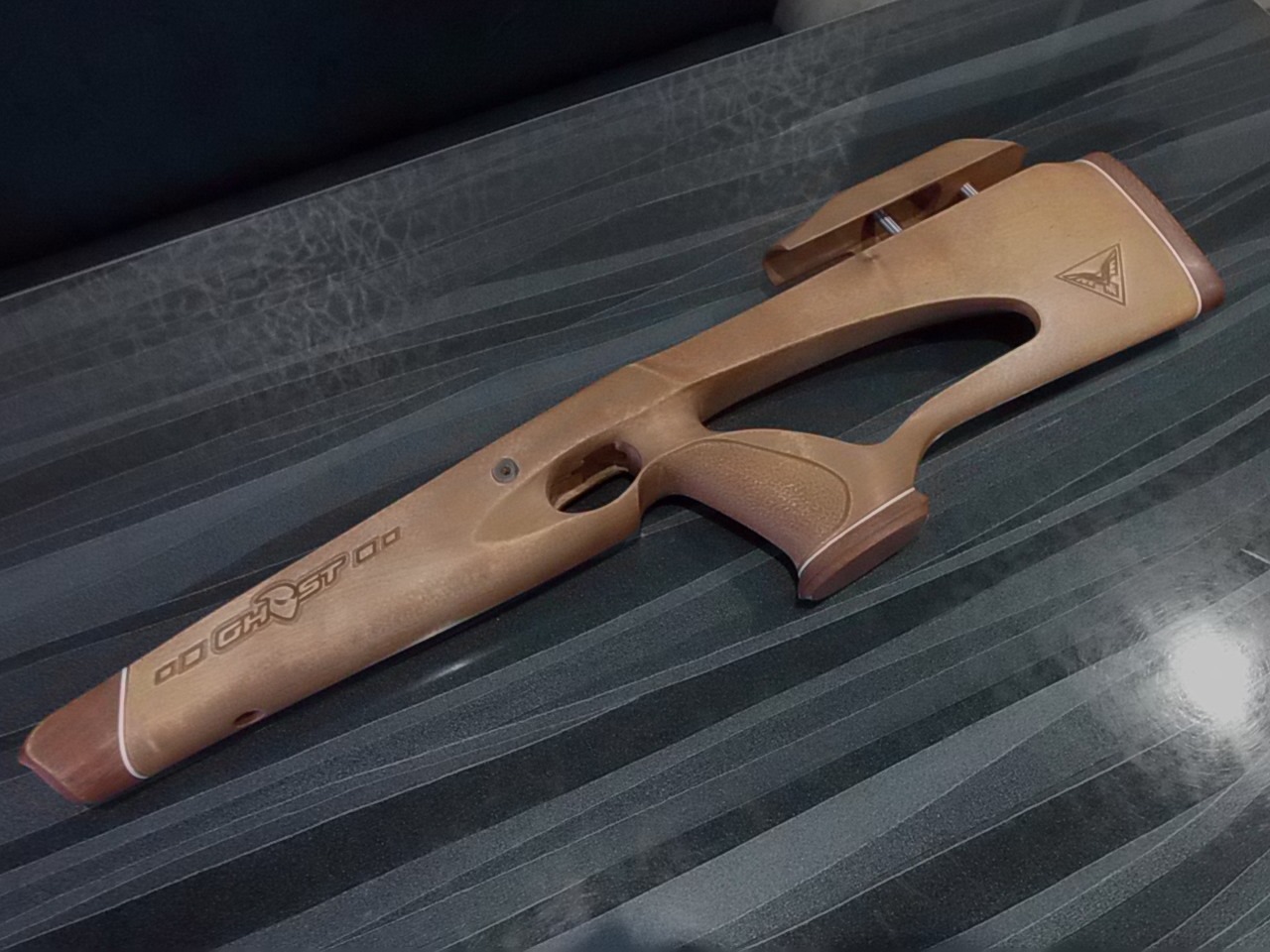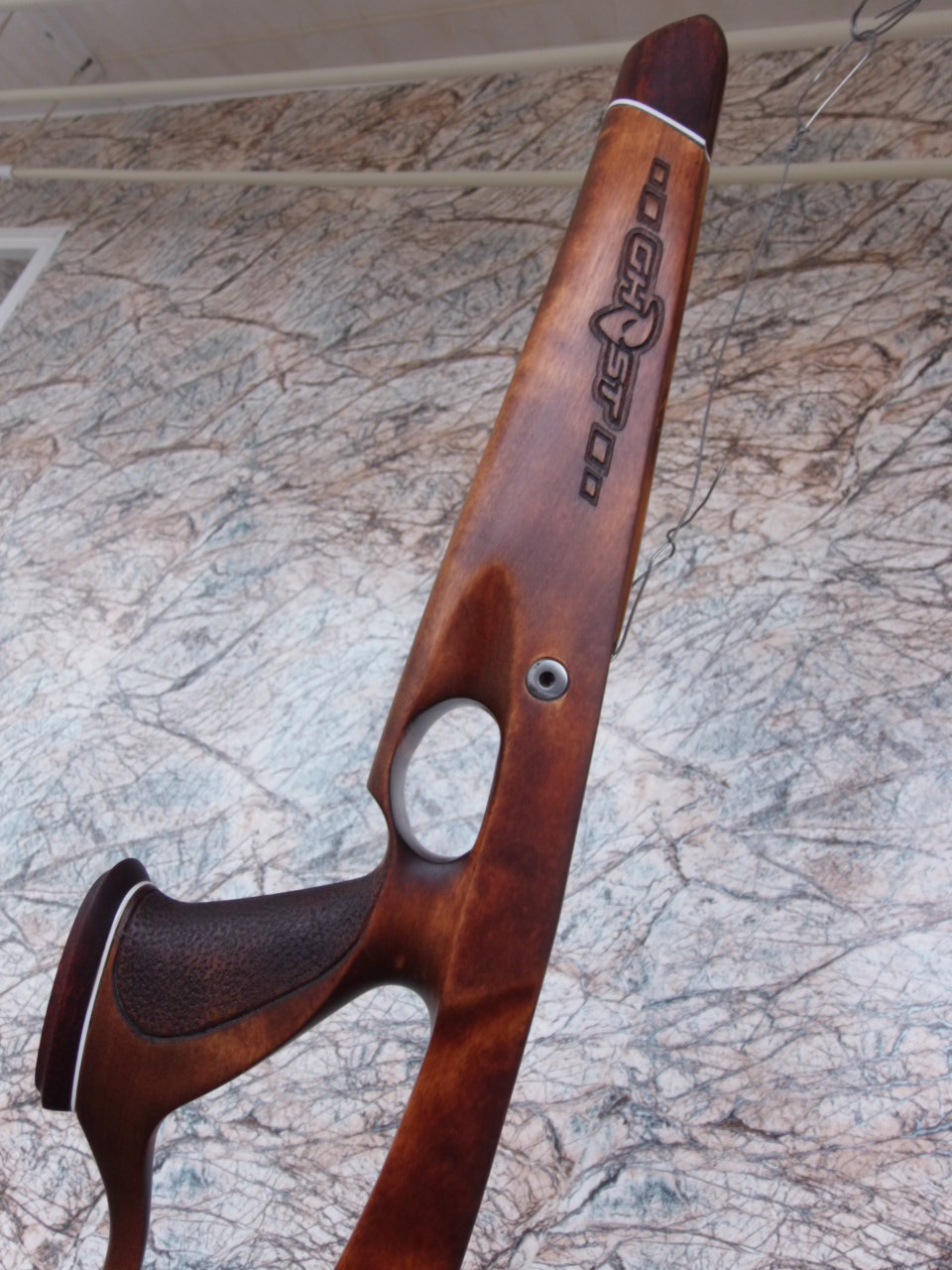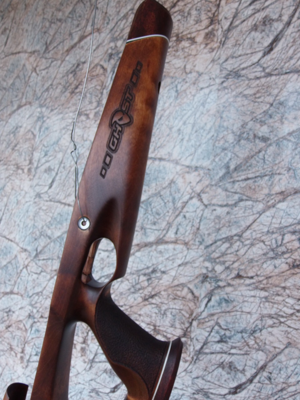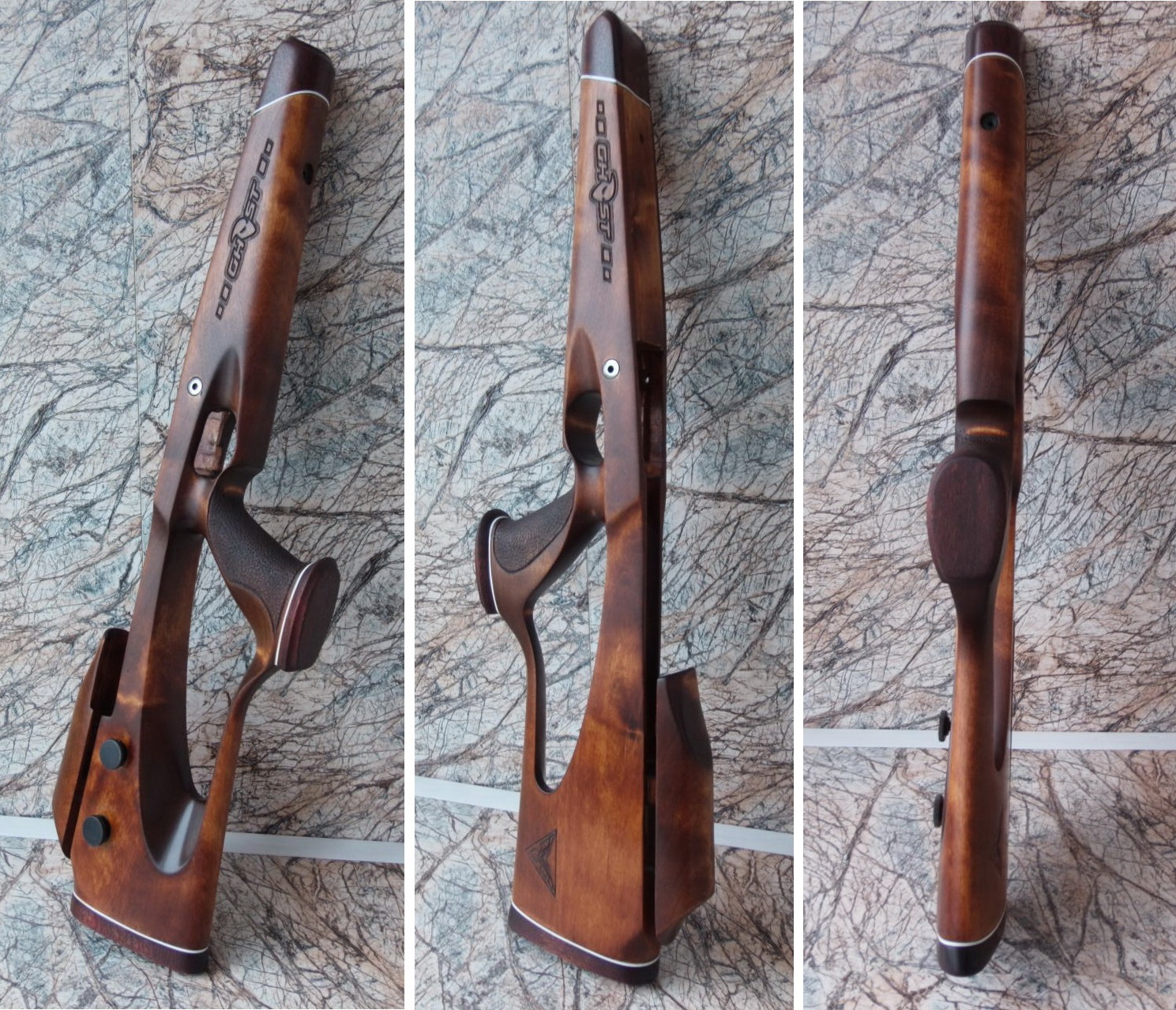 После решил дополнить декорирование ложи лазерной гравировкой. Рабочее название ложи было «Призрак»-уж простите,но люблю я давать своим изделиям какие-нибудь «погремухи».Именно такую «татуировку» решил я нанести в боках ложи.Служила она не только в плане декора,но и была полезна в хвате за цевьё.Также как и на наколотке рука по этим логотипам не скользила.Получилось собственно так: На память товарищу нанёс на левой стороне приклада свой логотипчик: Ну а в сборе с этими элементами вот таким стал ИЖик: Снова разобрал винтовку,выкрутил из ложи и втулочки под маховики.Начал окончательную зачистку ложи перед пропиткой.Наждачка была разной.От средней до самой мелкой нулёвки.Деревяха была казалось бы как стекло. Но ворс конечно был скрыт.Чтобы его убрать-пошёл уже привычным путём. Мочил мягкую тряпочку чистую в кипятке,отжимал её как можно лучше и натирал этой тряпочкой ложу.После подсыхания влаги на древесине стал подниматься тот самый ворс!Снова наждачку в руки-теперь от 600 до 1500 заново зачистил ложу.Потом ещё раз повторил привычную процедуру тряпочка+кипяток. После подсыхания(а сохнет быстро потому что не мокрая тряпка,а именно ВЛАЖНАЯ!) снова зачистил ложу от 800 до 1500 нулёвки.И ещё раз проверил тряпкой влажной ворс(уже третий)-вот теперь ворса не было вообще!Напоследок прошёлся наждачкой строго по волокнам по всем поверхностям ложи наждачкой 1500-2000-2200. «Буратинка» была готова к морению и пропитке на все 100%.