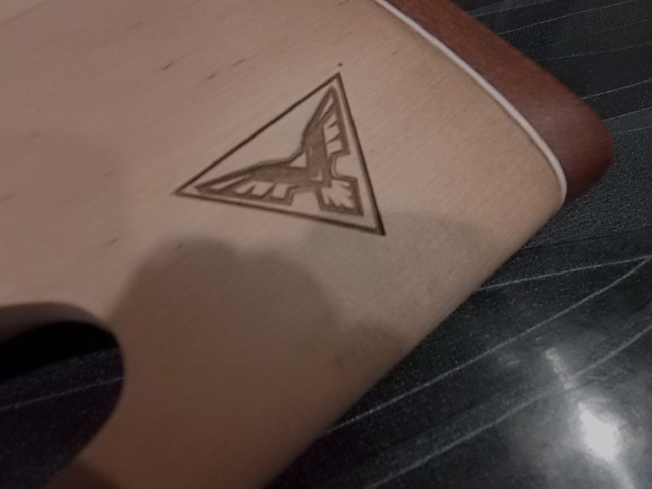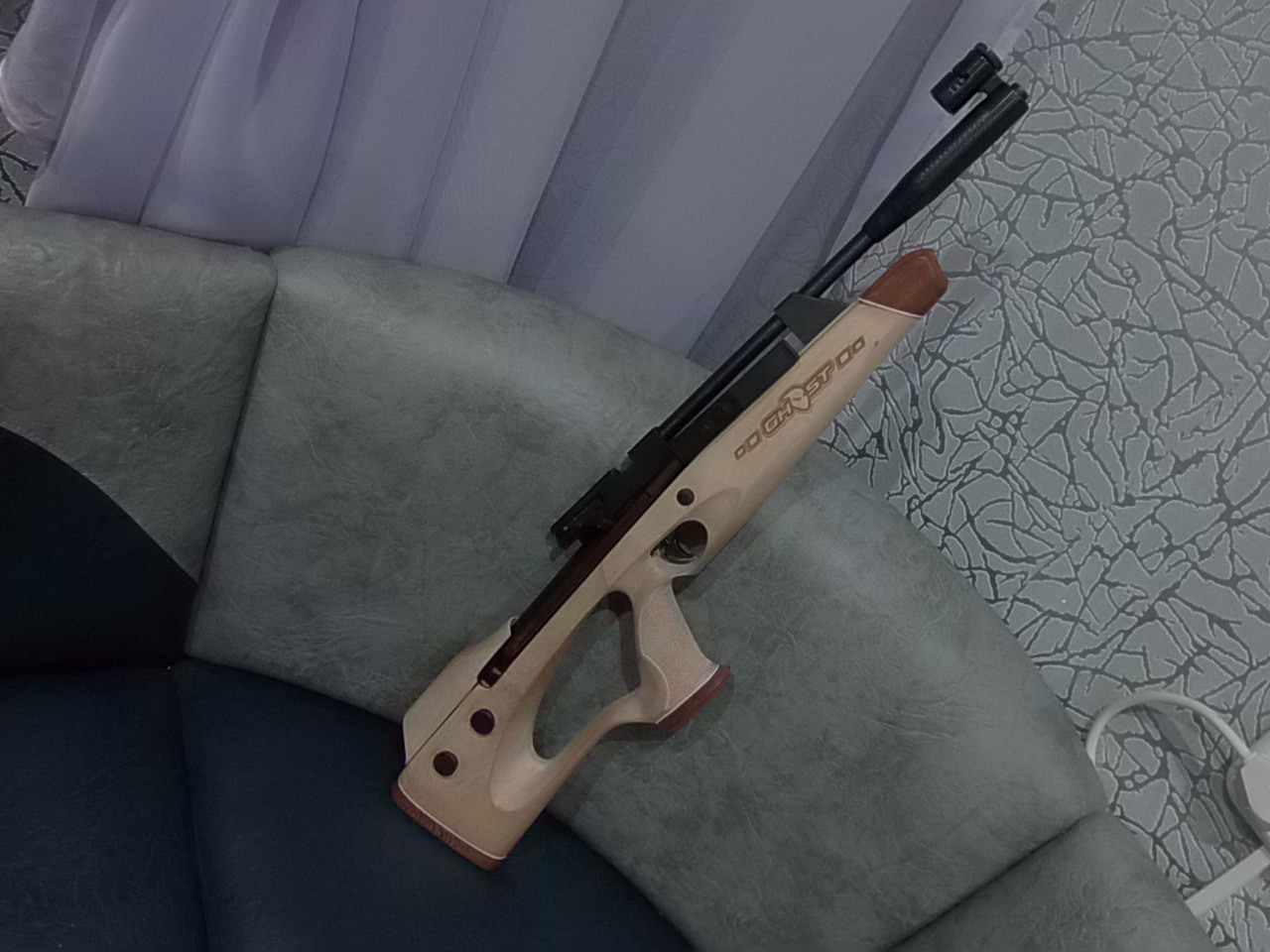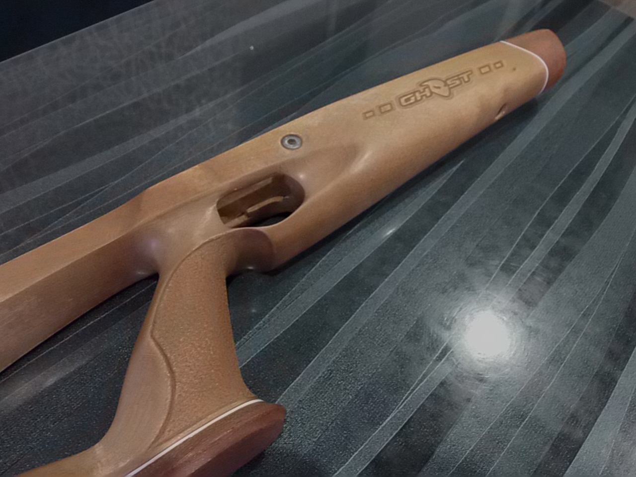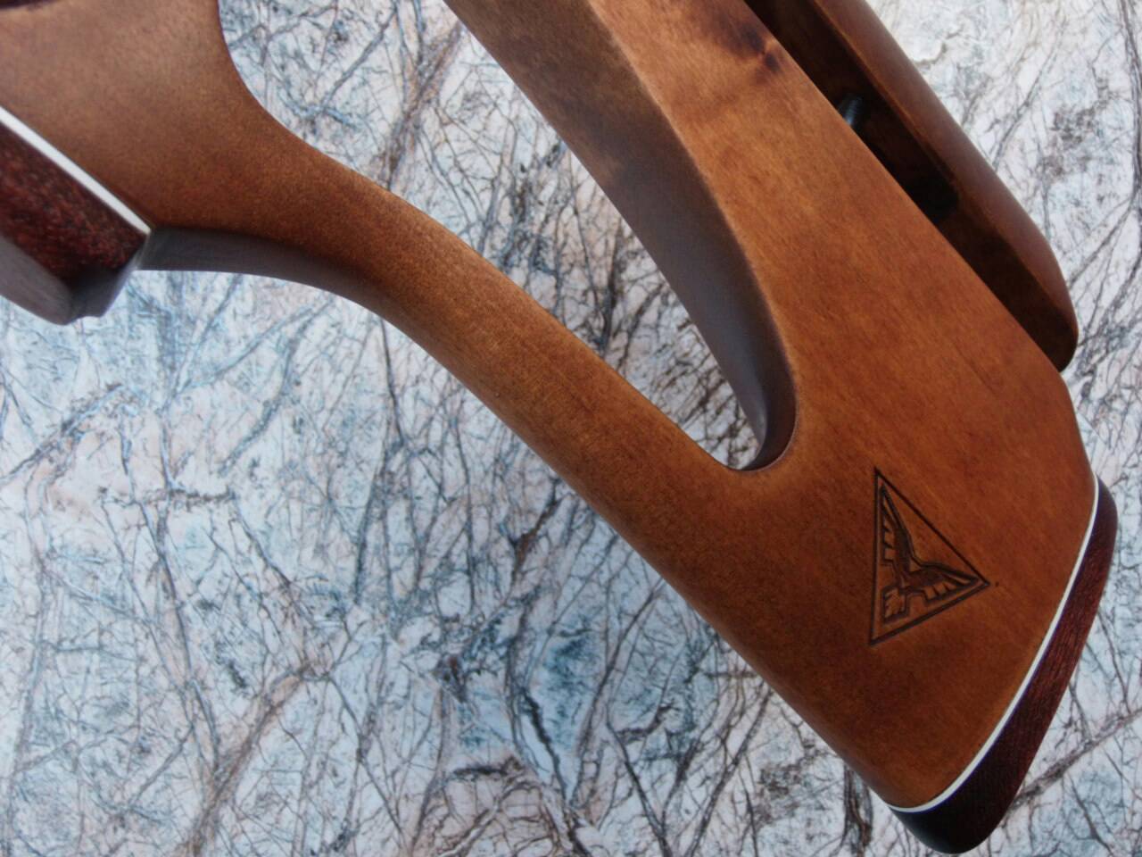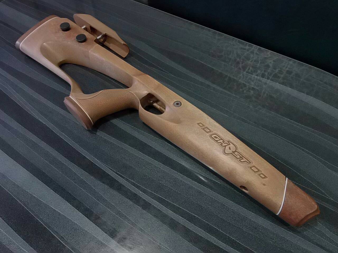 После решил дополнить декорирование ложи лазерной гравировкой. Рабочее название ложи было «Призрак»-уж простите,но люблю я давать своим изделиям какие-нибудь «погремухи».Именно такую «татуировку» решил я нанести в боках ложи.Служила она не только в плане декора,но и была полезна в хвате за цевьё.Также как и на наколотке рука по этим логотипам не скользила.Получилось собственно так: На память товарищу нанёс на левой стороне приклада свой логотипчик: Ну а в сборе с этими элементами вот таким стал ИЖик: Снова разобрал винтовку,выкрутил из ложи и втулочки под маховики.Начал окончательную зачистку ложи перед пропиткой.Наждачка была разной.От средней до самой мелкой нулёвки.Деревяха была казалось бы как стекло. Но ворс конечно был скрыт.Чтобы его убрать-пошёл уже привычным путём. Мочил мягкую тряпочку чистую в кипятке,отжимал её как можно лучше и натирал этой тряпочкой ложу.После подсыхания влаги на древесине стал подниматься тот самый ворс!Снова наждачку в руки-теперь от 600 до 1500 заново зачистил ложу.Потом ещё раз повторил привычную процедуру тряпочка+кипяток. После подсыхания(а сохнет быстро потому что не мокрая тряпка,а именно ВЛАЖНАЯ!) снова зачистил ложу от 800 до 1500 нулёвки.И ещё раз проверил тряпкой влажной ворс(уже третий)-вот теперь ворса не было вообще!Напоследок прошёлся наждачкой строго по волокнам по всем поверхностям ложи наждачкой 1500-2000-2200. «Буратинка» была готова к морению и пропитке на все 100%.