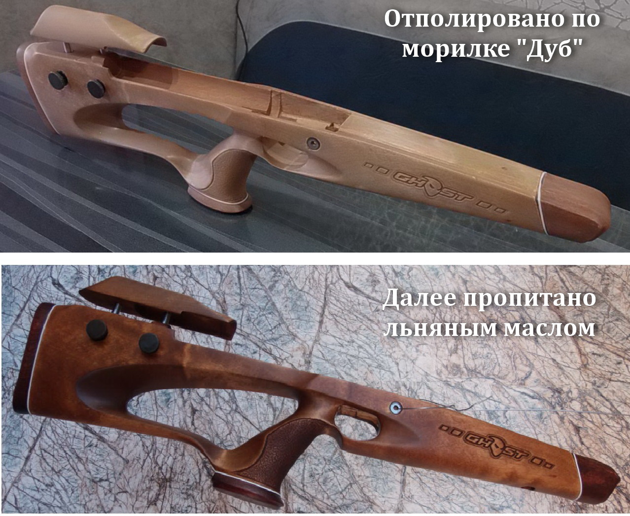 Камраду доверевшему мне свой «Ёжик», хотелось иметь ложу тёмных тонов.Нравятся ему тёмные ложи.Ну не чёрные уж конечно,но темноватые. Потому учитывая пожелания,зная свойства берёзы при увлажнении охотно темнеть,а уж тем более под жидкостями с красителями какими,для морения применил я морилку «Дуб». Даже чуток разбавил её водой процентов на 15.Хорошенько встряхнул,перемешал.Взял 2 чистых мягких тряпочки,приготовил горячую воду.Налил морилку приготовленную в удобную ёмкость,взял чистую тряпочку,намочил обильно в морилке,как позволяла силёнка в руке отжал тряпку и принялся потихоньку натирать этой тряпочкой с морилкой ложу.На торцевых спилах натирал не сильно нажимая на тряпку-в таких местах деревяшка станет заметно темнее общего цвета.Хотелось добиться максимально одинакового окраса.Ну и так за несколько подходов проморил деревяшку.Тряпочка реально лучше работает,чем тампоны,кисти и т.д.!Нет разводов и покрытие более ровное. Не дожидаясь высыхания морилки,взял чистую тряпочку,намочил её в горячей воде,ХОРОШЕНЬКО ОТЖАЛ,и стал растирать нанесённую морилку.Это улучшает результат морения-если какие-то пятна от пальцев,разводы и т.п. были,то влажная тряпочка всё отменно растирает и выравнивает окрашенное.Ну и после высыхания морилки-строго по волокнам отполировал уже окрашенную ложу ещё раз нулёвками 1500-2000-2200-2500.Поверхности стали просто потрясающе гладкими и приятными глазу.Гляньте как мех играет на свету!Шанхайский барс!!!