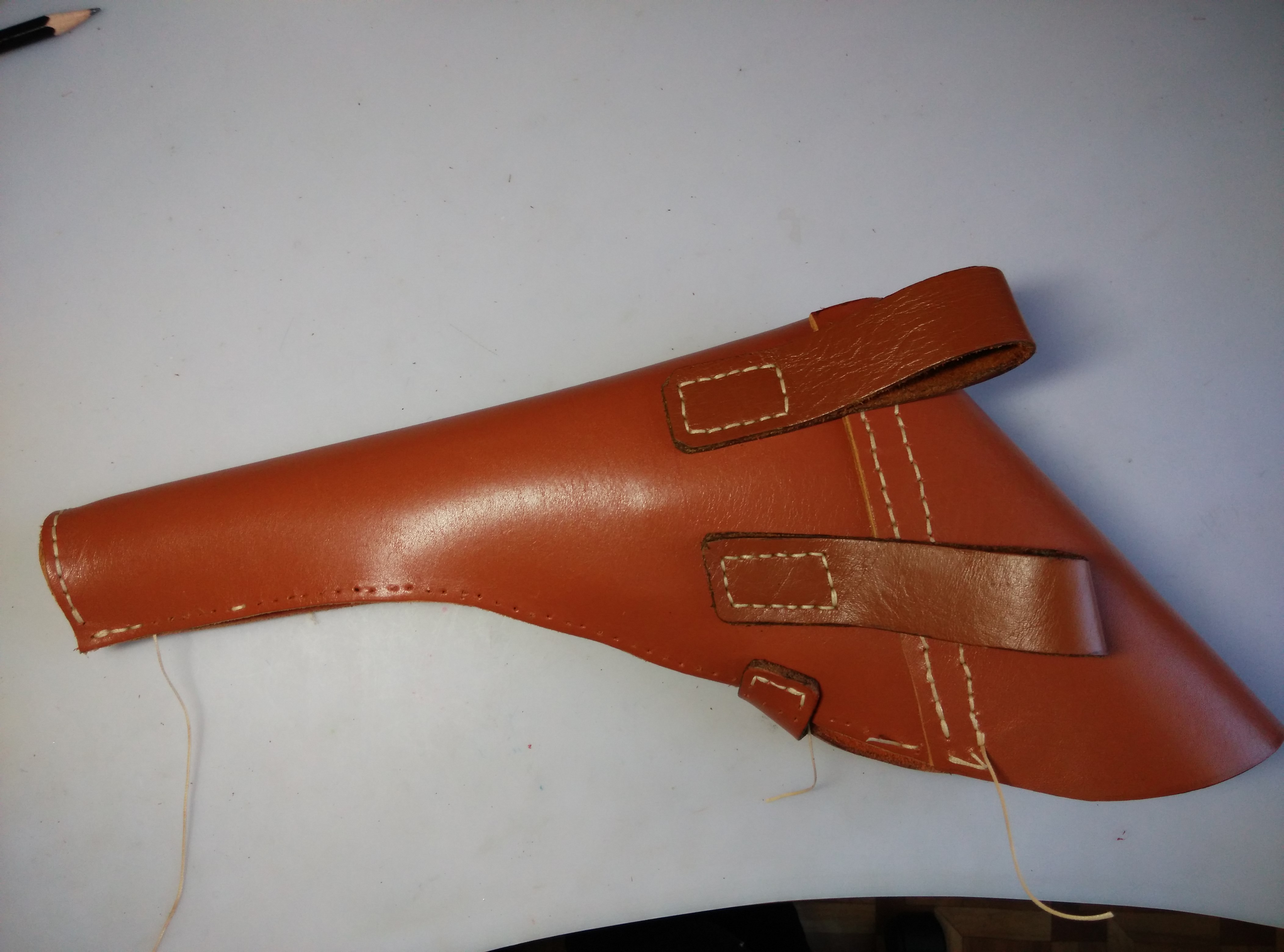 Когда все мелкие детали были пришиты, уже по готовым отверстиям кобура прошита окончательно. Если кому не понятно как шьется - поясню.Одна нитка с иголками на двух концах, или отдельные нитки с иглами, по необходимости. Шьется навстречу через стяжок. Одна нитка идет по верхней стороне, вторая по нижней, на следующем отверстии, они меняются местами. Профессионалы пользуются крючком, тогда одну нитку цепляют крючком, вытягивают на обратную сторону петлю, продевают в нее нитку, а потом с равным усилием затягивают обе нити. Тогда обе части стягиваются между собой как бы внутри шва. Это конечно самый правильный способ. Так войлок шьют, но он толще, с кожей не всегда так получается, конечно, если нет профессиональной швейной машины, или друга скорняка.