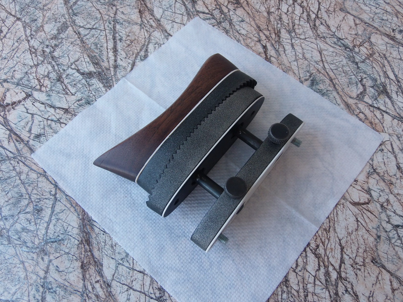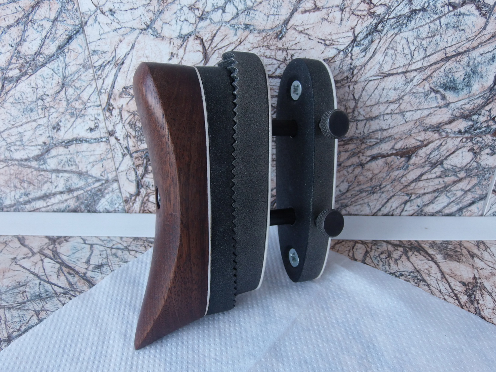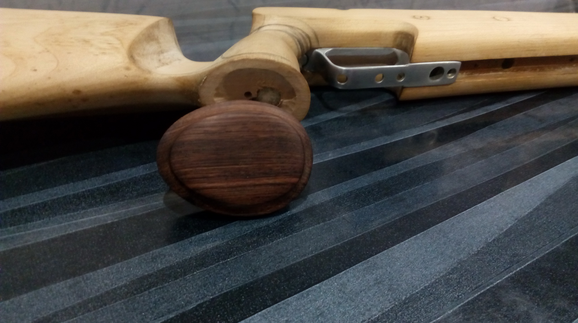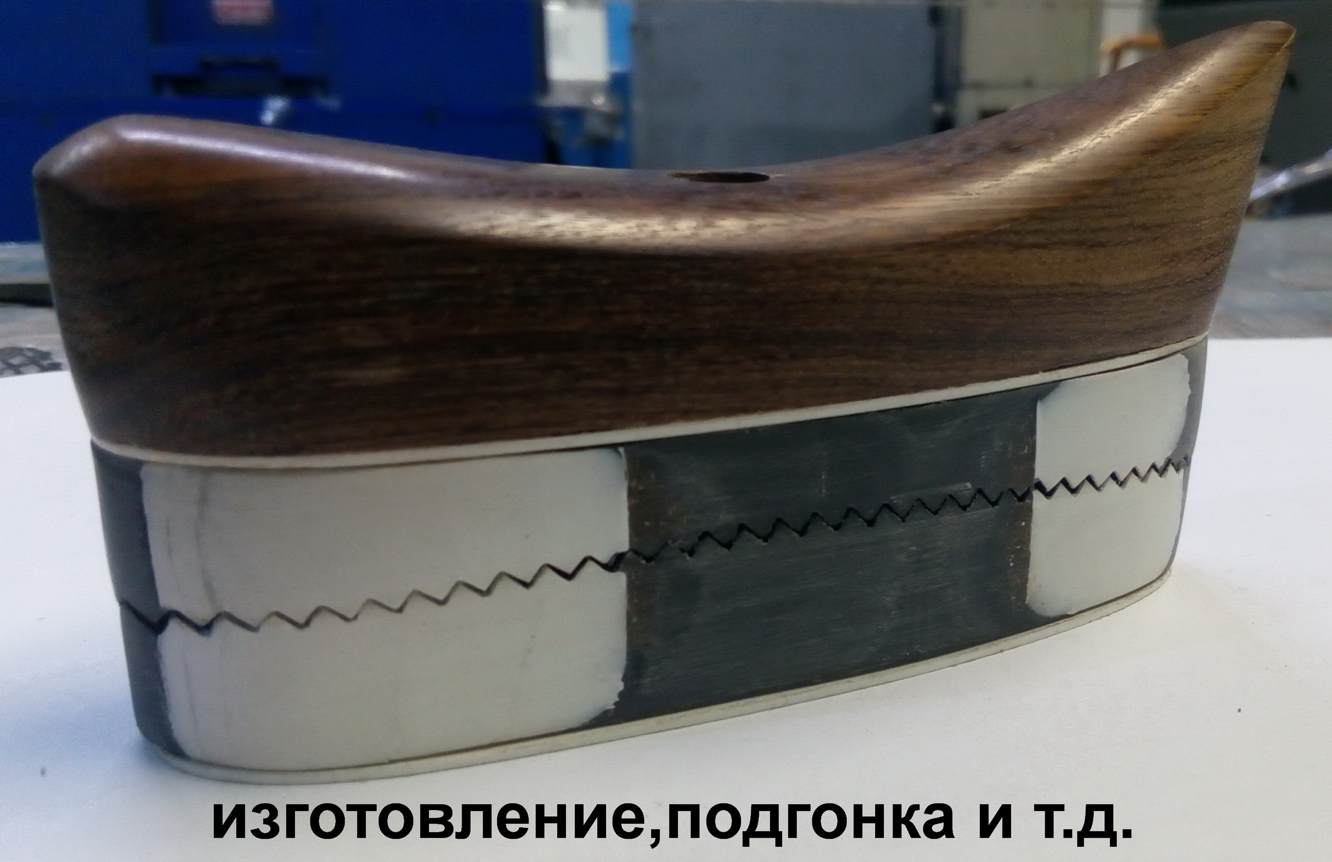 Отмочил сначала ложу в ацетоновой бане, затем протёр чистым ацетоном и отшкурил всю ложу бумажками от Р60 до Р320. Затыльника к ложе в комплекте не было, не было и еврошины. Спусковая скоба из алюминия была. Совместными усилиями с дружком Русланом соорудили регулируемый затыльник. Решили сделать его регулируемым и по высоте и по длине. Он напечатал из хорошего пластика три детали затыльника-к основе крепился с задней стороны двумя саморезами на клею деревянный затыльник. Для него и (забегая наперёд) прочего декора этой ложи я отыскал красивый брусок из экзотической породы. Средняя деталь-ответная половинка первой с шпоночным пазом куда вложена гайка М6 под винт фиксации затыльника при регулировке по высоте. Т.е. в затыльнике деревянном и детали к которой он закреплён просверлено сквозное отверстие под винт. Ослабишь винт-выставив на нужную высоту затыльник винт затянешь. Затыльник останется зафиксированным в выбранном по высоте положении. Регулировка выполняется не на ластохвосте, а на соединении «крокодил» что намного надёжнее-фиксация мёртвая просто!!! Также во вторую деталь были врезаны две шпильки стальные для регулировки по длине. Третья деталь крепится непосредственно к затыльнику двумя винтами с потайными головками во втулки врезанные в затыльник приклада. Также эта деталь оснащена двумя втулками под шпильки средней детали и двумя втулками в боковине правой под маховички стальные для фиксации выдвинутого по длине затыльника. Маховики стальные при закручивании упираются в стальные шпильки и надёжно фиксируют затыльник в нужном положении по длине. Для беспрепятственного перемещения шпилек внутри приклада выполнен необходимый паз. Вот таким был сначала затыльник и вот таким он стал в итоге. Варианты регулировок продемонстрированы: