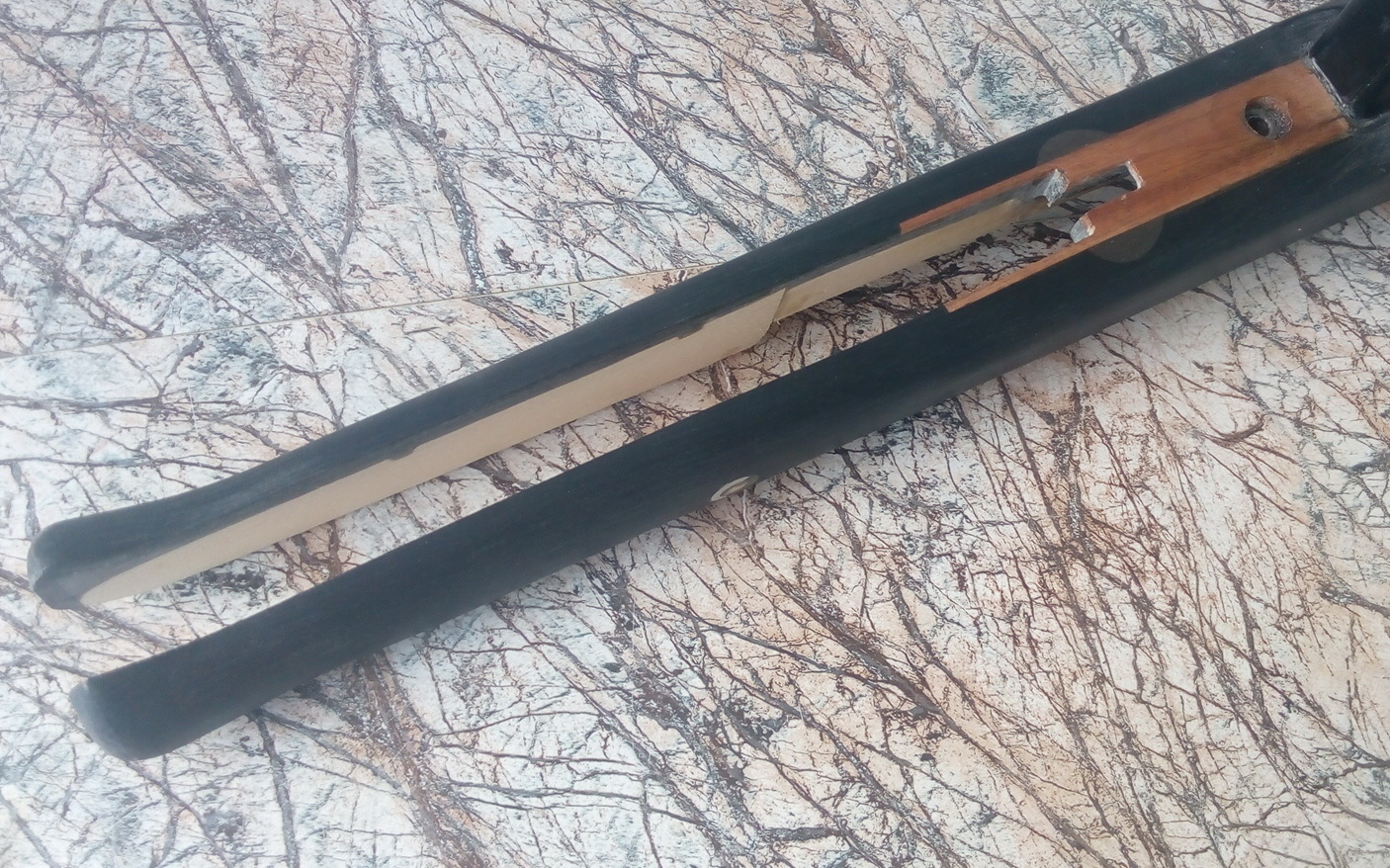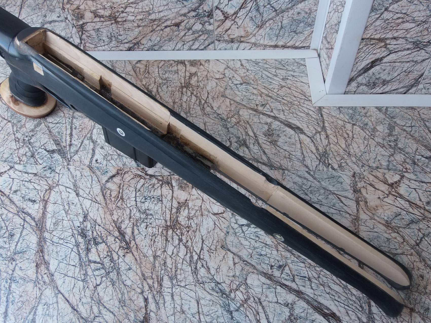 Увеличить длину приклада после точного замера длины от спускового крючка с учётом затыльника приклада нужно было как минимум на 50мм. Был кусок отменного прочного чёрного пластика-из него напилил 17 заготовок(этаких шайб) с припуском на обработку дальнейшую с сечением отпиленного приклада. В центре каждой заготовки сделал отверстия Ф20мм. Сложив все заготовки одна на одну замерил получившуюся длину-было на штангенциркуле 51мм. Толщина пластика соответственно была равна 3мм-как раз что и требовалось для наращивания приклада в длину. После подобрал кусок алюминевой трубы с тем же Ф20мм, но длиной не 51мм,а большей-140мм. На трубку после обезжиривания поочерёдно одел изготовленные пластиковые шайбы на ЭДП. Одевались туго и это был плюс. С одной стороны оставался хвостовик, хвостовик с другой стороны был немного длиннее. Более длинным хвостовиком было решено вклеить получившуюся деталь в ложу, а который короче-в приклад. «Холодной сваркой» залепил внутри торца ложи на месте распила пустотки и пустотки в торце приклада. Это чтобы клей при вклеивании хвостовиков не протёк внутрь приклада и ложи. На хвостовиках болгаркой наделал хаотичных рисок-никак не вырвешь после застывания клея хвостовики!!! Сначала вклеил получившуюся деталь хвостовиком в приклад, хорошенько высушил. Выставил всё точно по центру и без перекосов. Затем вклеил вторым хвостовиком приклад с удлинителем в ложу на тот же ЭДП. Всё вышло просто здорово!!! Схватилось всё прочным монолитом, для точной подгонки припуск на пластиковых заготовках был. Пару часов аккуратной и неспешной подгонки-слилось всё прекрасно в общей конструкции. Если присмотреться-видны тоненькие клеевые швы между пластиковыми шайбами и клеевые швы стыка с прикладом и ложей. Стрелками отмечу оба начала собранной детали и как расположилась примерно в прикладе и ложе алюминевая труба: