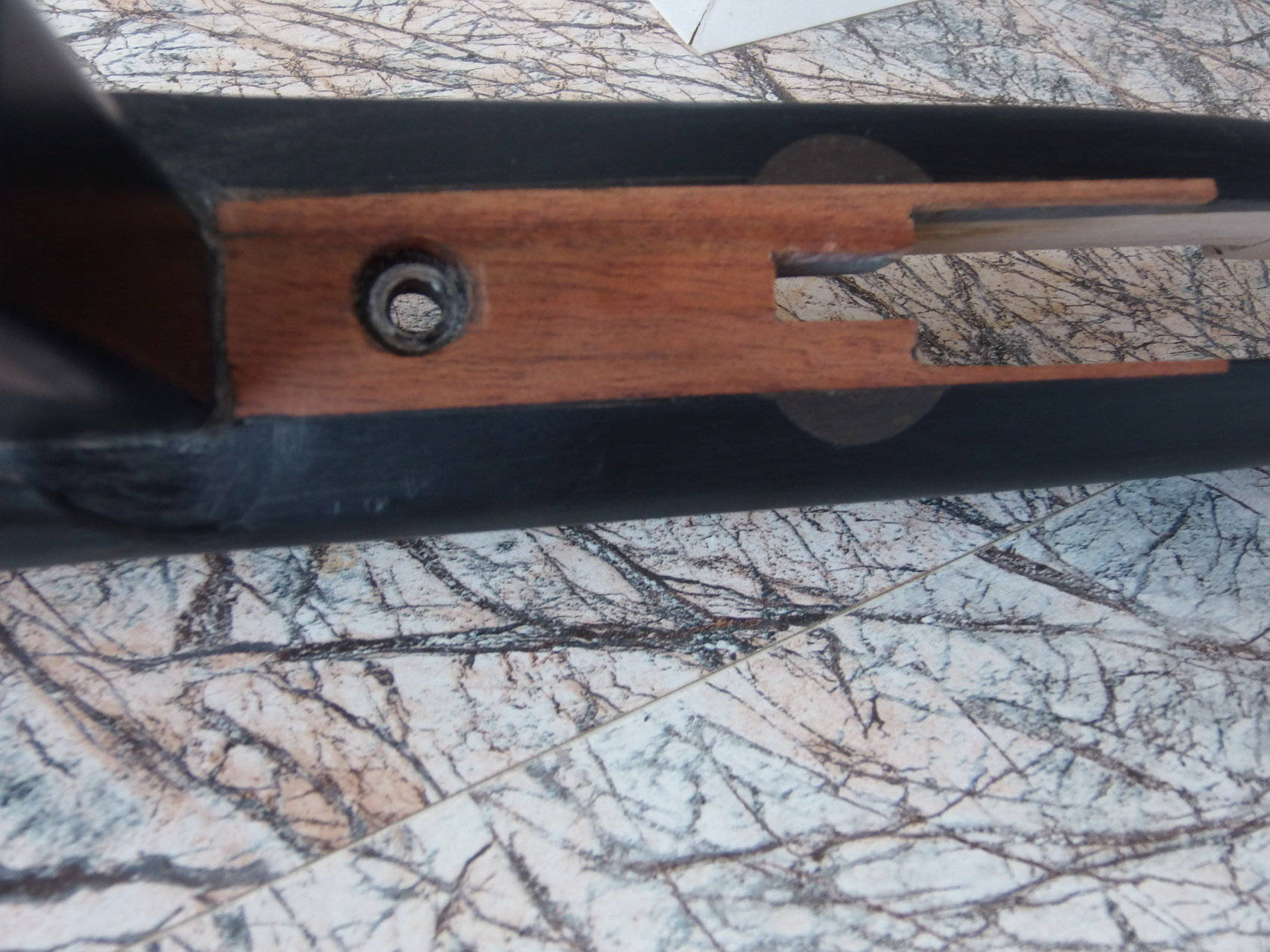 Также потребовалась замена рукояти пистолетной. Ну лично мне рукоять та что была оказалась крайне неудобной. Вроде по конфигурации и эргономичная-а нет! Прежде всего была мне короткой, а в объёме своём какая-то за слишком громоздкая. И руку едва ли не судорогой сводило при охвате. Решил заменить её проверенной давно в деле рукоятью от АКобразных-купил у страйкболистов. Отпилил ножовкой рукоять с ложи, приклеил базу из прочного чёрного пластика. Далее по внутрянке рукояти сделал из этого же пластика крепкую колодку для посадки рукояти. Т.е. не просто гранями приклеить рукоять к базе, а надёжно посадить её на колодку и закрепить к колодке длинным винтом в основание рукояти. После точной примерки приклеил сделанную колодку к базе по месту, затем просверлил отверстие Ф5,2мм сквозное прямо в вклеенную ранее алюминевую трубу для наращивания длины приклада. Нарезал резьбу М6 и дополнительно обмазав обезжиренный винт и отверстие ЭДП, притянул колодку к основанию. После застывания стало просто каменным всё-не оторвёшь 100%. Потом одел рукоять на колодку, отметил длинным винтом куда он будет в колодке закручиваться. Сделал стальную втулку с внут.резьбой М6 и наруж.диаметром 10мм, просверлил в колодке отверстие Ф10,5мм, вклеил в колодку обезжиренную втулку, хаотичные риски на наруж.плоскости втулки конечно сделал. И втулка после застывания ЭДП намертво вросла в колодку. Смазал после обезжирки нутро рукояти ЭДП обильно, колодку, втулку, длинный винт М6 и притянул им рукоять к к ложе. Для плавных переходов от рукояти к ложе замешал шпаклёвку из ЭДП и мелких деревянных и пластиковых опилок-обработал стыки этим составом и аккуратно после высыхания обработал всё наждачками до красивого вида. Попытаюсь нарисовать вам как что. Художник из меня с помощью программ никакой, мне от руки всё начертить проще)))))))) Но думаю будет понятно: