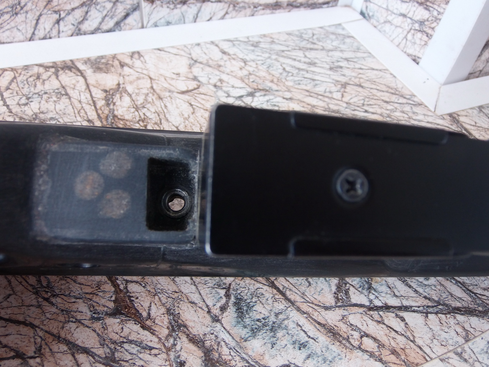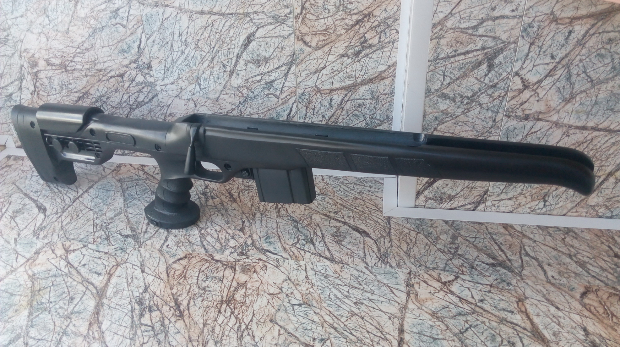 Ложа разбиралась без проблем на две половины( и приклад и основная часть)-это было большим плюсом. Ложа имела много рёбер жёсткости внутри, перегородки, отверстия, пустую шахту под магазин. Чтобы в эту ложу было возможно разместить «Мурку»-требовалось рёбра удалить, а всё остальное заделать вклейкой всяких вставок. К слову расположение шахты магазина( его в комплекте с ложей не было) лично у меня вызвало недоумение. Она была расположена настолько далеко к носу цевья, что элементарно не совпадала с окном экстракции гильз с правой стороны ложи. Не знаю кто это проектировал, но руки отбить не мешало бы))) Вот примерно: