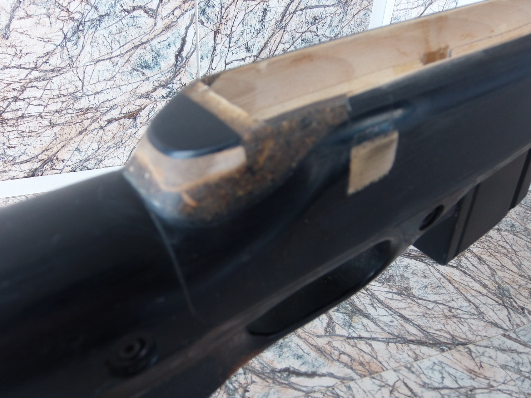 На ложе справа было гнездо под рукоять затвора. Изначально я думал сделать некую имитацию затвора на компрессоре +стебель(ручку) в это гнездо. Но поразмыслив решил этого не делать. Потому данное гнездо заделал деревянной деталькой на супергель и зашпаклевал присыпав пищевой содой мелкие щелочки, а затем прокапав соду суперклеем-вышла просто «броня»!!! Очень крепкая получилась «шпаклёвка». Ну и после аккуратно зачистил этот участок. Также сзади за компрессором оставалась плавно сужающаяся пустота. Её также заделал деревянным брусочком необходимой формы и для плавного перехода заделал стыки с небольшим запасом смесью ЭДП, пластиковых и деревянных опилок. Вышел этакий «бакелит», после и тут неспешно и аккуратно поработал наждачками, предварительно приклеив сверху на вклеенный дерев.брусок кусок прочного чёрного пластика. Сделал тщательно плавные переходы и вышел стойкий монолит: