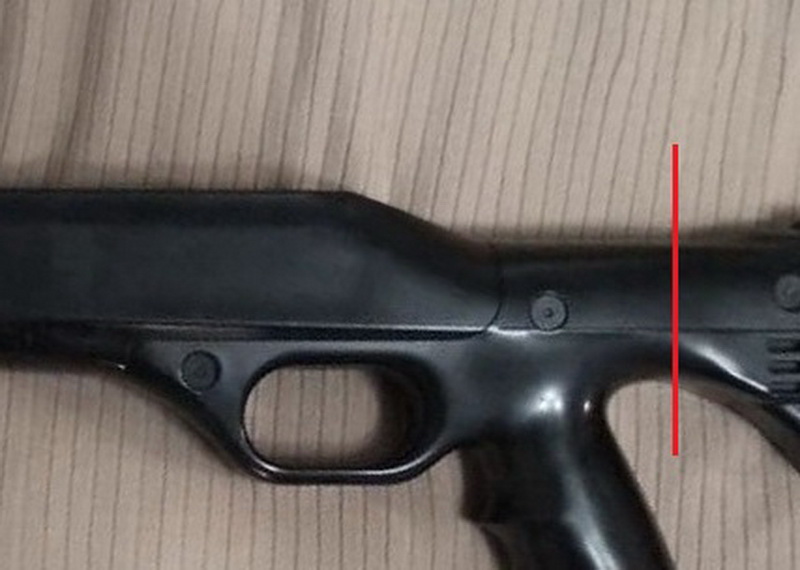 Нужно было конечно нарастить длину приклада. Разумеется необходимо было сделать это максимально надёжно. Сначала я приклад отпилил аккуратно от ложи с помощью ножовки по металлу. Пластик кстати оказался весьма прочным!!! Красной линией тут отмечено примерное место распила: