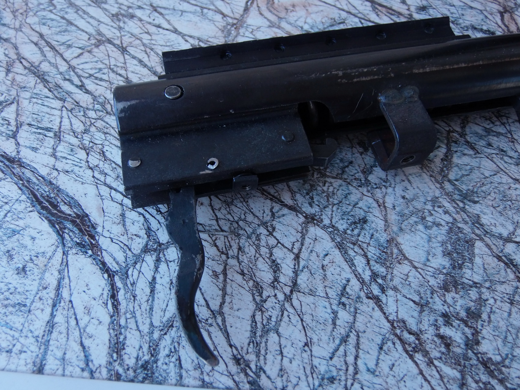 После окрашивания обещало быть ещё интереснее. Итак-ложа процентов на 95 была уже готова. Вставил «Мурку» в ложу и….. На тебе, Виталий Сергеевич!!! А спусковой крючок короткий! А предохранителя и совсем не видать!!! На стилизованной снайперке «L-96» было тоже самое-там я нарастил крючок вторым от «МР-512». Предохранитель(кнопку)также пришлось наращивать винтом, но к слову вышло там всё замечательно. Никогда ещё я от предохранителя на «Мурке» не отказывался, но в этот раз решил я его всё же «ампутировать». Сам же крючок я решил сделать новый, просто сделать его более длинным. Подходящий кусок стальной стали, болгарка, наждак, напильники, надфили….Часа два неспешной работы и отличный спусковой крючок необходимых размеров готов. Воспользовался советом уважаемого Евгения Ивановича и закалил изготовленный крючок с помощью газовой горелки и ёмкости с маслом. Вышел отменно работающий крючок!!! Ну а предохранитель(его ус) я максимально опустил в колодке УСМ,вложил брусочек под него чтобы он никуда не сдвинулся и просверлил в колодке сквозь него отверстие Ф3мм. После загнал туда калёную шпильку Ф3,2мм с пропилом вдоль шпильки-не знаю как они правильно называются)))) Именно пропил позволяет загнать такую штуку в отверстие меньшего диаметра. Обточил излишки шпильки и в итоге предохранитель я заблокировал таким образом. Напоследок ус предохранителя я обрезал ровно по передку колодки УСМ. На фото если присмотритесь всё видно-и заблокированный кусок предохранителя и шпильку. Главное всё работало как швейцарские часы и позволяло без проблем снять винтовку со взвода. Взвёл винтовку, а стрелять передумал? Пожалуйста-переломал ствол снова до конца, крепко его удерживая нажал на крючок, и плавно возвращаешь его в исходное положение-винтовка снята со взвода и безопасна!!! Вот картинки: