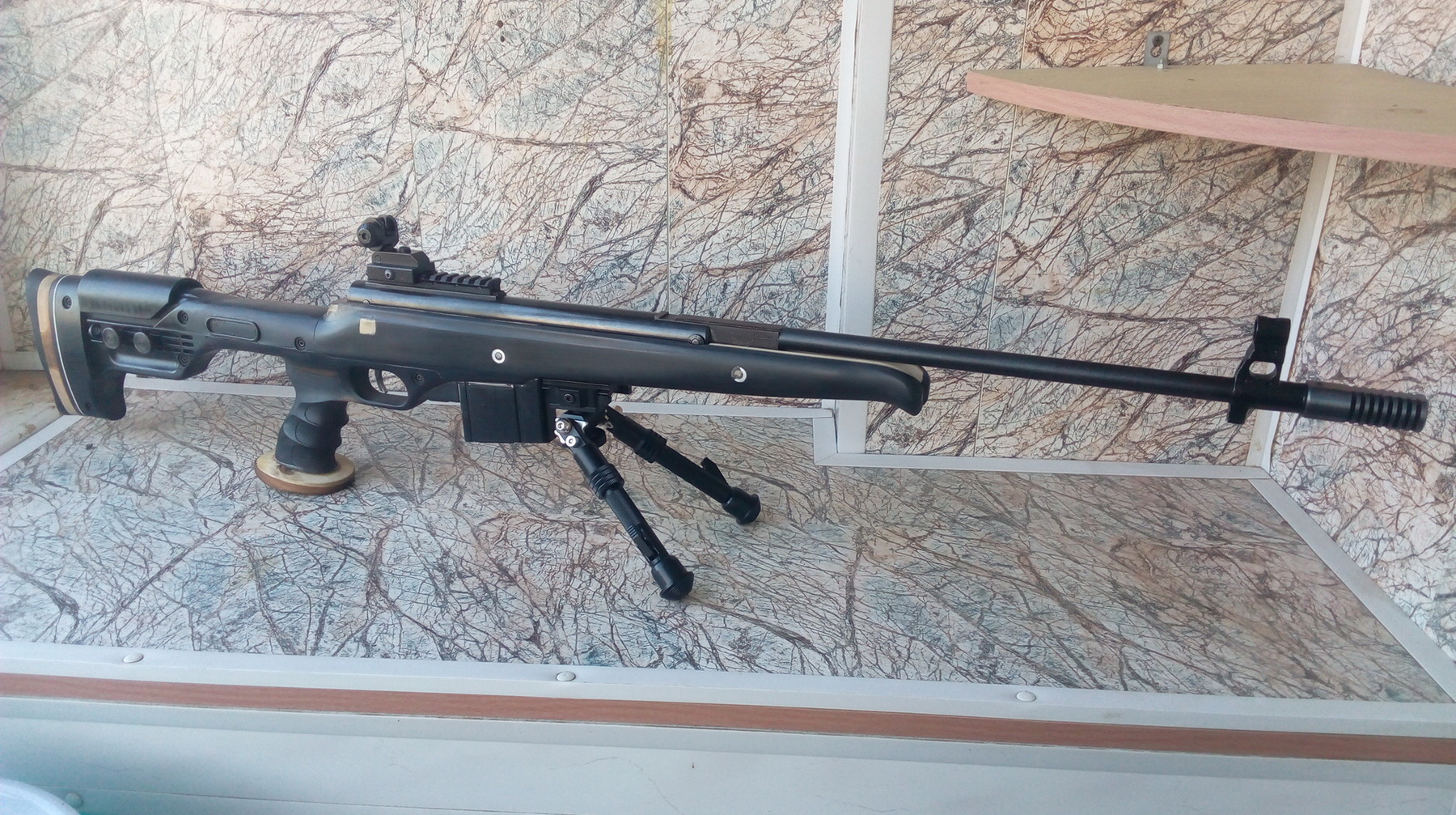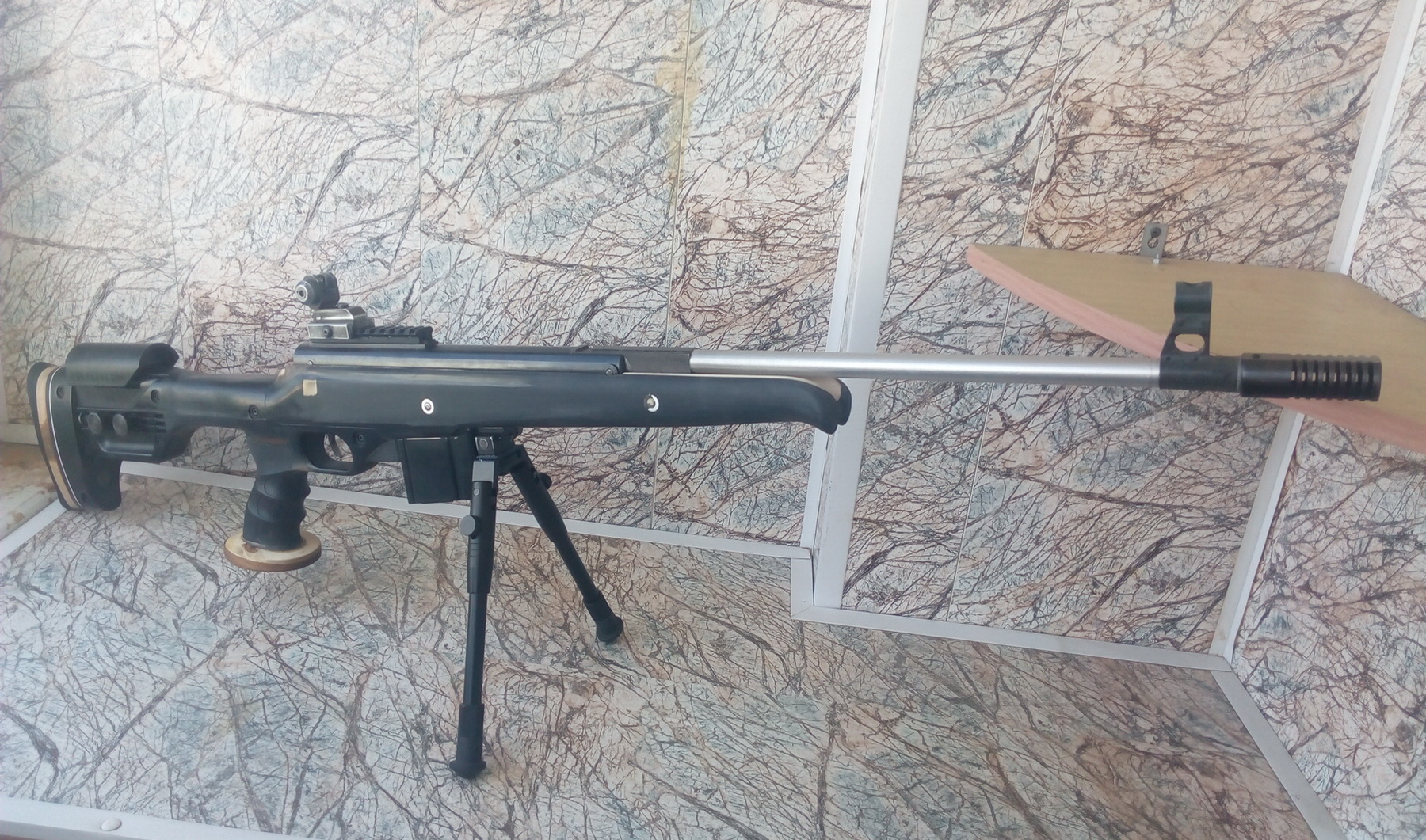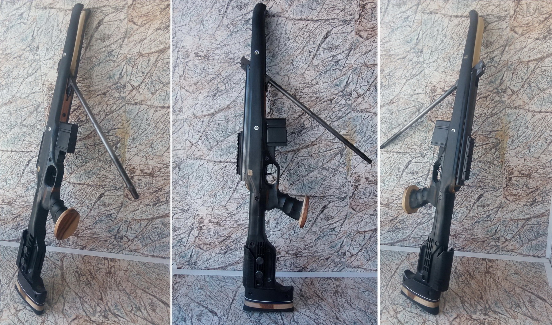 Установочные винты(гужоны) здесь не закручены, а вообще они после поджатия становятся заподлицо с плоскостями ДТК. И вот такая картина вырисовывается. Сошки попавшиеся под руку приладил, о крепеже сошек я расскажу чуть позже, да и сошки будут другие. Ничего не тёрло и не мешало установленному фальшстволу при переломе и взводе винтовки, не мешали и установленные сошки-и разложенные и сложенные. Я сделал паз для перелома под новый ствол чуть больше, но не слишком-с обоих сторон был запас между стенками ложи и фальшстволом около 1,5мм. Пока было так: