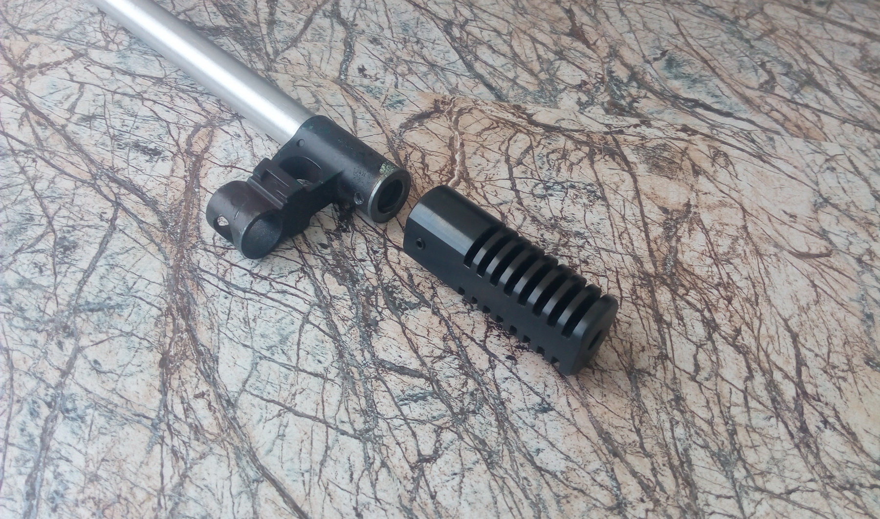 И совсем мне не понравилась толщина ствола. Хотелось чтобы был он чуток потолще. Достал одну из кучки ,давно подаренную дружком Эдуардом алюминевую трубку с сечением 20Х13, на токарном станке неспешно сточил снаружи диаметр с 20мм до 16мм и сторцевал нужной длины. Резьба на стволе родном при этом оставалась открытой. Трубка получившаяся внутри была слегка обработана наждачкой Р80 накрученной на длинную шпильку с резьбой М8 и зажатой в шуруповёрте. Это чтобы данный фальшствол натянуть на ижевский ствол-а то ну ооочень туго одевалась, стала одеваться чуть свободнее в натяг. Намушник с мушкой подошёл СВДшный-только сам ДТК я спилил. Он здорово после мелкой доработки трубки(впереди) стал на неё одеваться. Ну а закончить ствол решено было изготовленным земляком Серёгой многощелевым стальным на горячую воронёным ДТК. Изделие шикарней нет! Внутри резьба под ствол ижевский-М12х1. Дополнительно сверху и снизу для исключения проворота влево-вправо фиксируется маленькими установочными винтами. Вот что вышло: