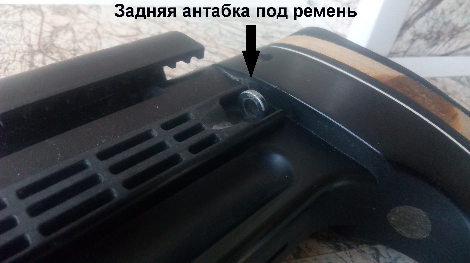 Едва не упустил на мой взгляд важную деталь! Решил сделать возможным крепление на винтовке плечевого ремня для удобной переноски. Ведь на прикладе с обоих сторон были антабки-стало быть и впереди нужно было её сделать. Крепить её было возможным только на боковине ложи ближе к носу цевья. Отыскал тульскую антабку стальную под карабин-т.е. идеально подходил ремешок от АК двухкарабинный. Сделал с помощью «Дремеля» необходимое гнездо и на ЭДП + 2 тульских родных антабке самореза, врезал я антабку по месту: