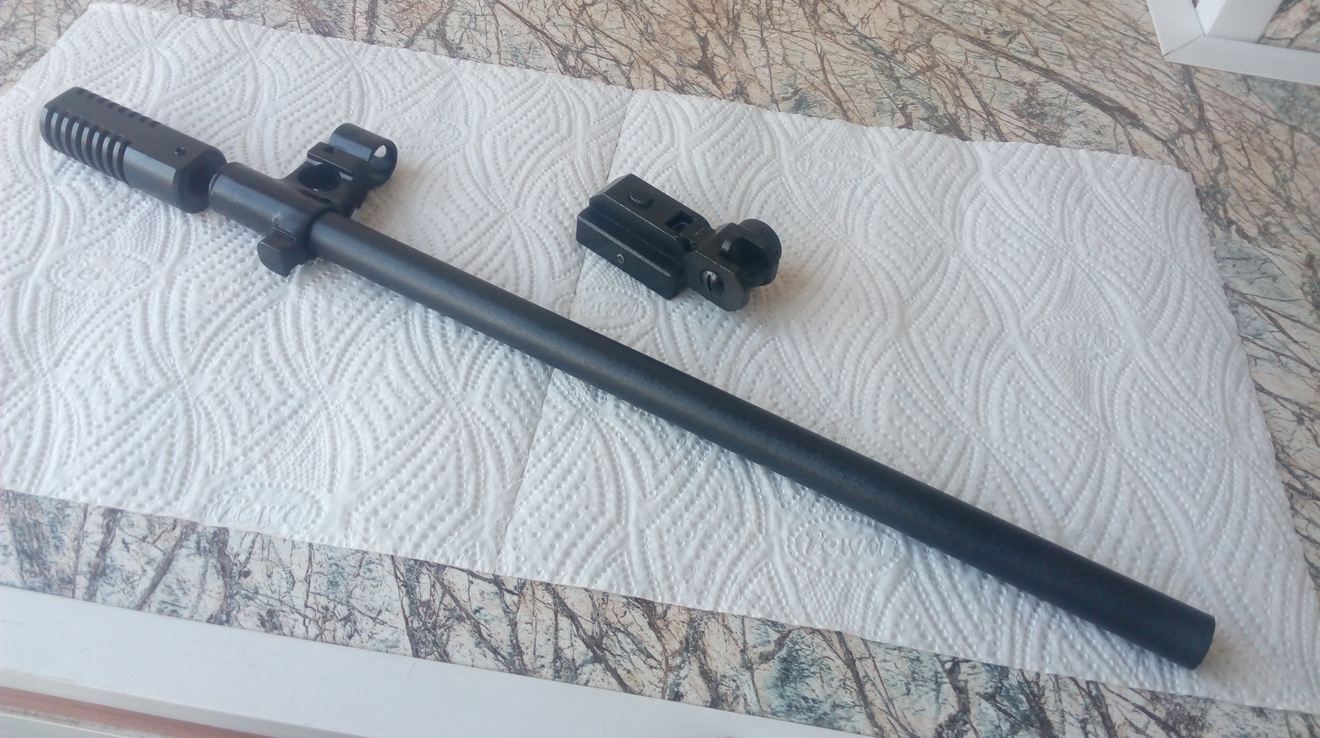 Ну и после этого фальшствол был отдан на анодирование в заводских условиях. Также были загрунтованы и окрашены чёрной матовой краской диоптрический целик и намушник, чуть поверх оросил их металликом для придания металлического оттенка. После слегка обработал их матовым лаком. Потом посадил намушник на готовый фальшствол на ЭДП. Вот загрунтованные и окрашенные диоптрический прицел, намушник и анодированный фальшствол с приклеенным на него окрашенным уже намушником. Анод слегка отличался оттенком(был иссиня-чёрным) от намушника и воронёного ДТК, потому поверх анода я легонько оросил фальшствол той же матовой чёрной краской. Так оттенки несколько выровнялись. Итог покраски и анодирования: