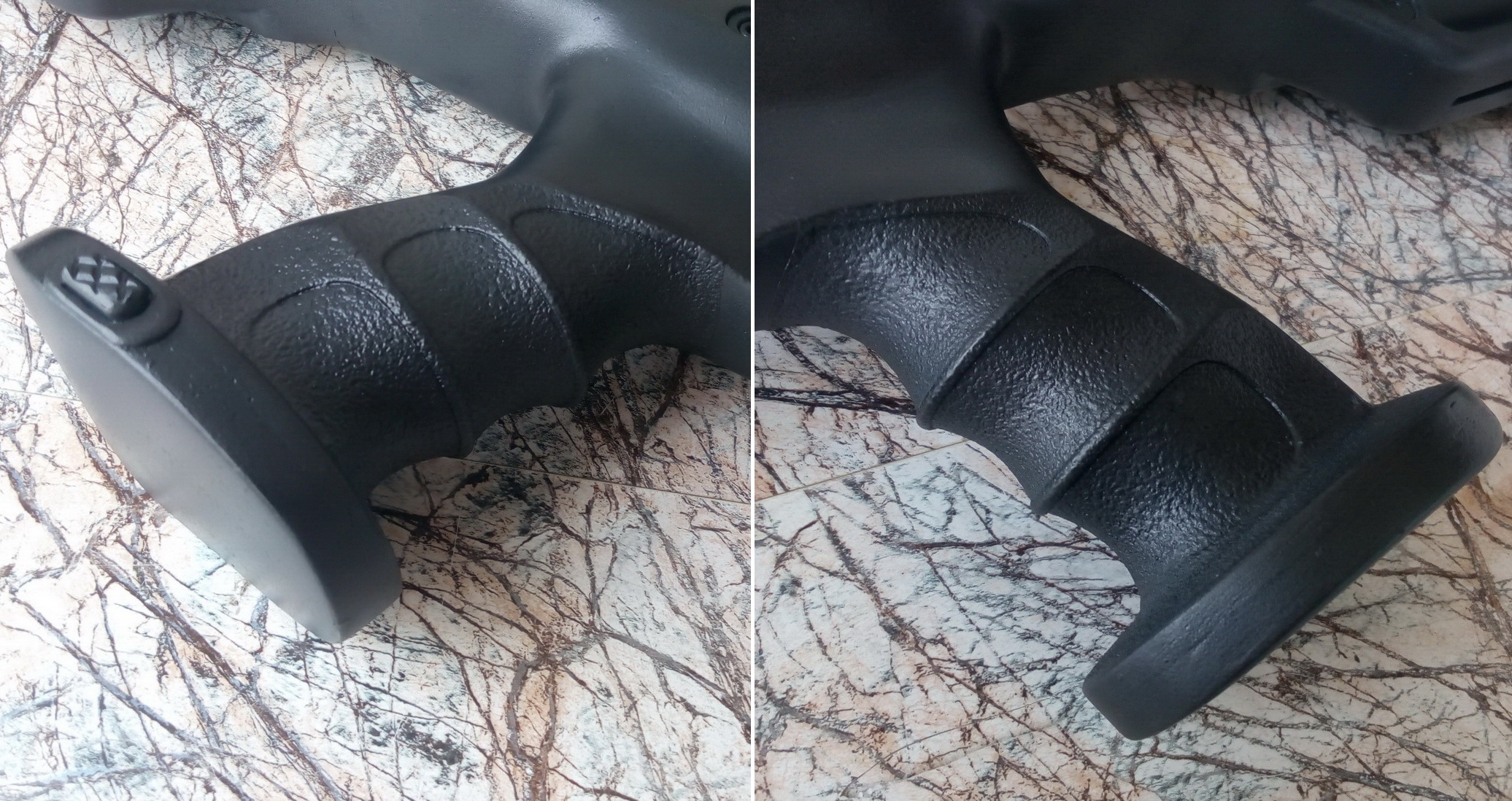 Пришло время доработать затыльник-прежде всего чтобы он не скользил в плече-с помощью треугольного и круглого надфилей, сапожного ножа я сделал канавки параллельные на затыльнике резиновом. Ну а потом обезжирил основательно всё как задумал, оклеил малярным скотчем границы окрашиваемого и с помощью мелкозернистого антигравия сделал шагреневое покрытие, напоминающее фактуру микропористой резины. Итог думаю вам понравится-затыльник в плече был годный!