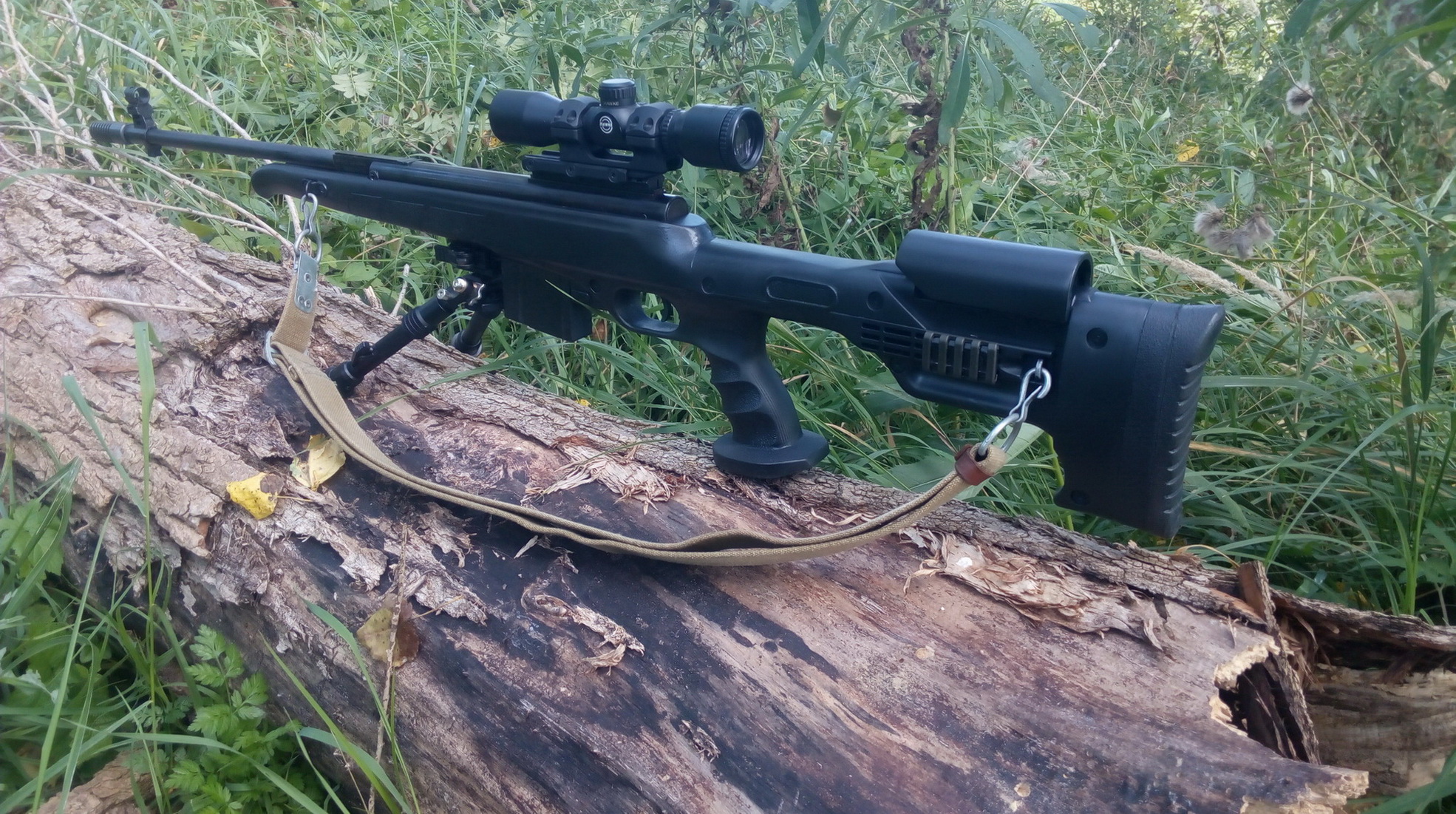 Логичное завершение-установка оптики. Снайперу нужен прицел!!! Ну и как положено закреплён был в антабках ружейный ремешок-пока стандартный от «АК». Как вам итог? Годится? Вполне такая винтовка поддержки получилась кажется? Здесь установил компактный прицел в моноблоке-кажется неплохо выглядит. Айрелиф в этом «HAWKE» приличный, шею к нему тянуть не надо-уложил морду лица на щеку приклада и наслаждайся пейзажами, ищи цель...