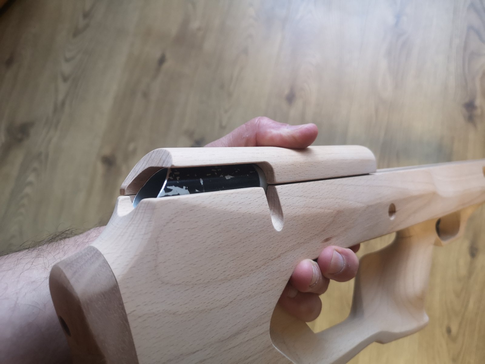 Если бы он утопил накопитель и сделал бы выборку на половину высоты коробки,то установив открытые прицельные,целиться было бы невозможно-высота щеки приклада практически в одну линию с верхом ложи. Ну если оптику поставить-только в кольцах повыше. Это как к примеру делают "карабин" из ИЖ-53,приклад сбацают с щекой в линию с компрессором и на...... Целик к глазу близко и как не выкручивай шею-хрен приложишься! Порой и коллиматор не спасёт даже высокий.