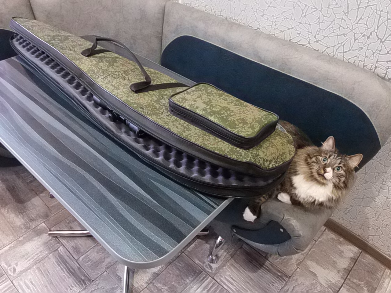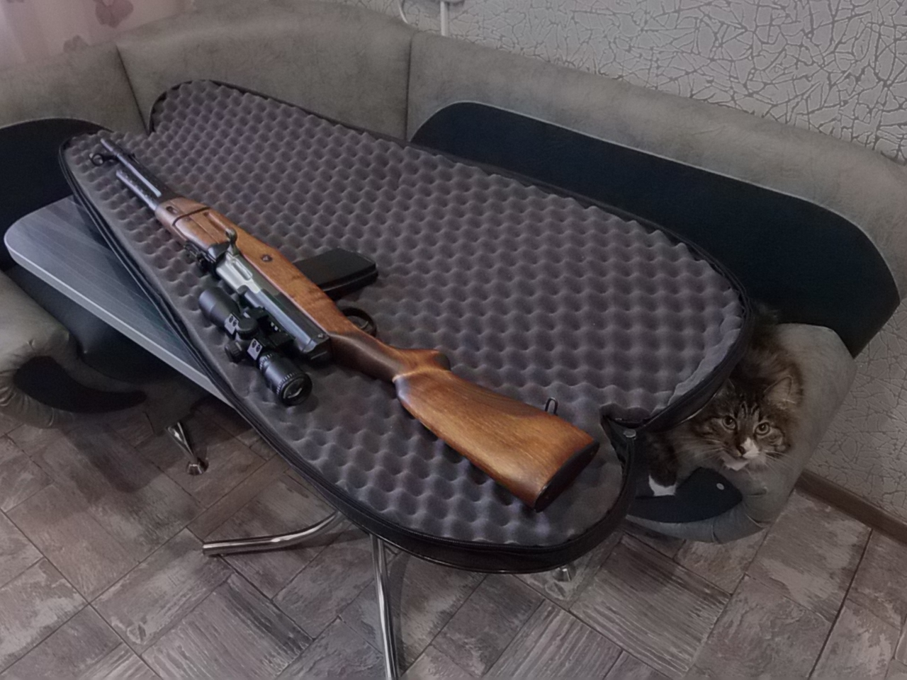 Ответ: Наплечный ремень в данный момент снят,но при необходимости можно его на карабин пристроить в любой момент.Он переносится вместе с карабином в кофре в боковом кармане.Ремень от ППШ с клеймом "1943г.",но как видите на более ранних фото,что даже мне с ростом в 193см данный ремешок вполне в пору и годен для переноски карабинчика.Карабин без проблем вмещается в мой кофр с размерами 120Х25 по внутренней площади.Можно уложить и в 110см-в моём много свободного места остаётся.Подтверждение на фотографиях-пустой кофр,с уложенным карабином,застёгнутыми замками и готовый к переноске с карабином: