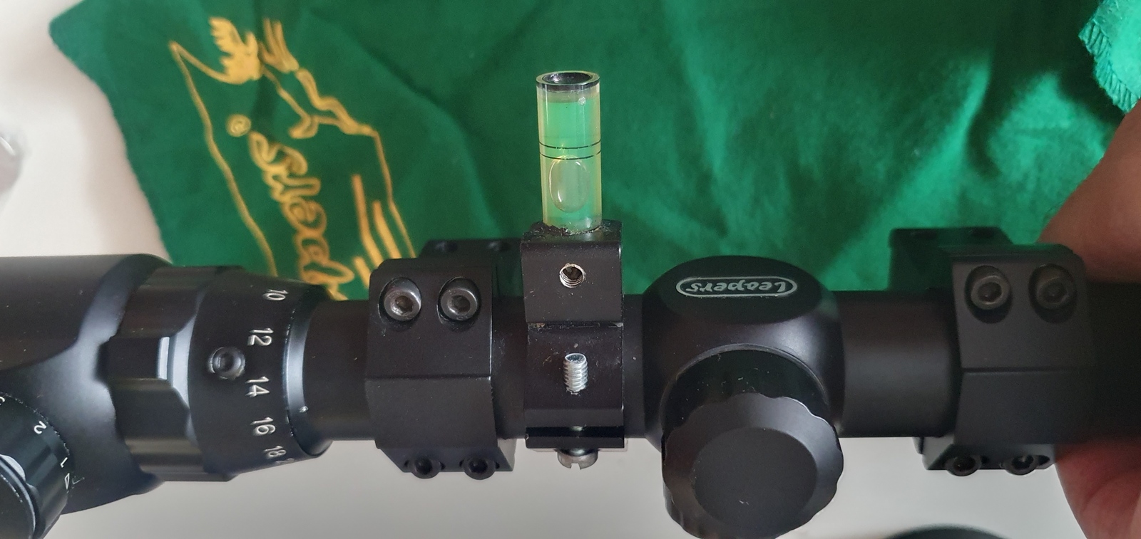 В комплекте сам прицел, кольца к нему, дополнительно висит кольцо с уровнем, запасная батарейка, бленда, бумажки, фирмовая зеленая тряпочка )