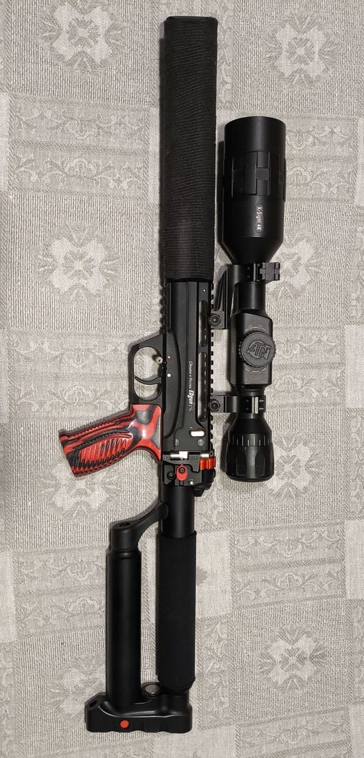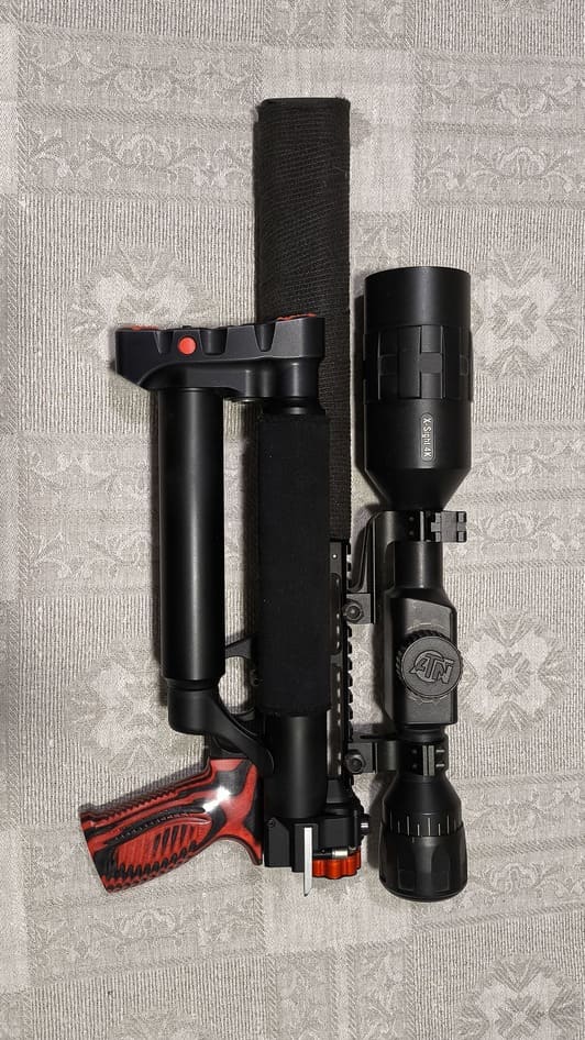 1. Винтовка Леший 2, 6,35мм. Из последних партий с продольным редуктором. Отрегулирована, обслужена, сделана регулировка стволика по вылету и установлен жиклер 0,7мм на переводчик барабана, механизм перевода барабана работает мягко и тихо, два металлических барабана. Состояние новой. Редуктор на 145. Стволик Альфа 350 мм., отполирован. Настроена на слаги FX 2.2 гр. скорость 250 км/ч, летят очень кучно. С одной заправки 290-145 два с половиной барабана. Работал на дистанциях 5,0-12,0 м. не по бумаге. Прицел цифровой день-ночь ATN X-Sight 4K Pro 5-20, привезен из США. Не смотря на габариты, пользоваться на лешем очень удобно, благодаря аэрлифу 90 мм. Прицел с баллистическим калькулятором, но можно стрелять и по сетке. В комплекте к прицелу два фонаря и комплект колец. Так же в подарок: расширенный ЗИП к винтовке на все случаи жизни: вся внутрянка, резинки, запасной редуктор, вставка в обечайку. Станция настройки редуктора. Пули Slug FX 2,2гр. 300 шт. Пульница. Набор для чистки стволика. Кейс пластиковый для переноски. Рюкзак для переноски. Коробки, документы. При продаже винтовка в состоянии 3дж.