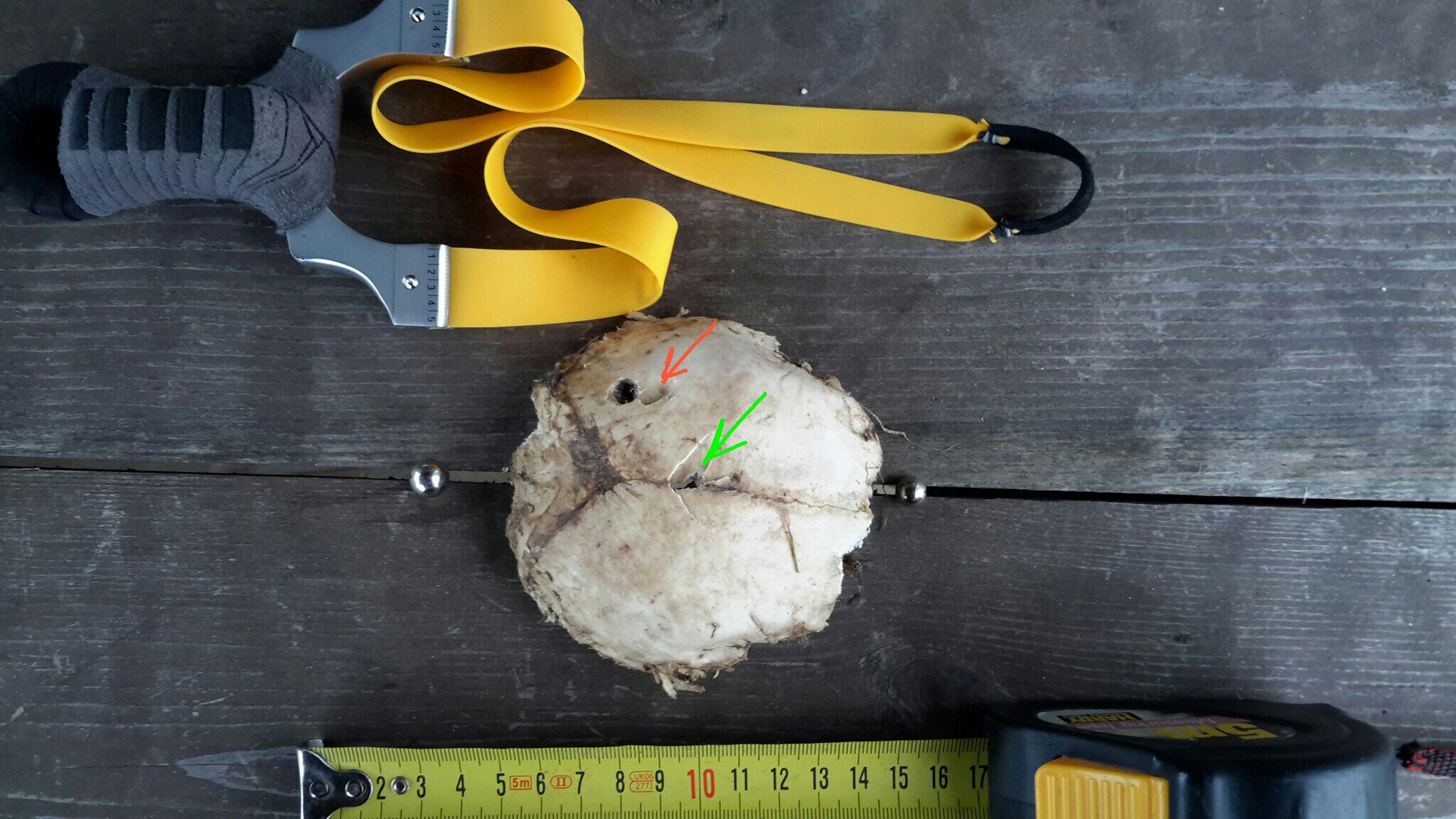 Череп полугодовалого теленка. Стрельба с 7ми метров. 8мм шар не пробил но треснуло, 10мм шар навылет