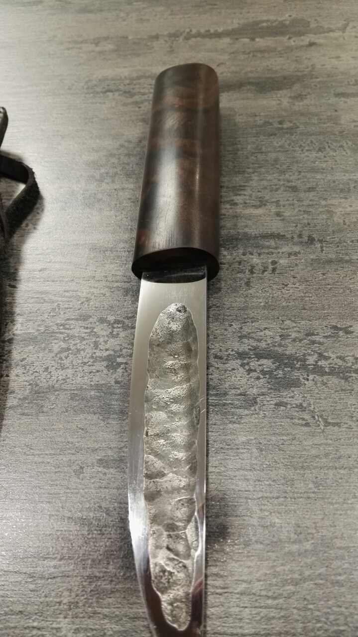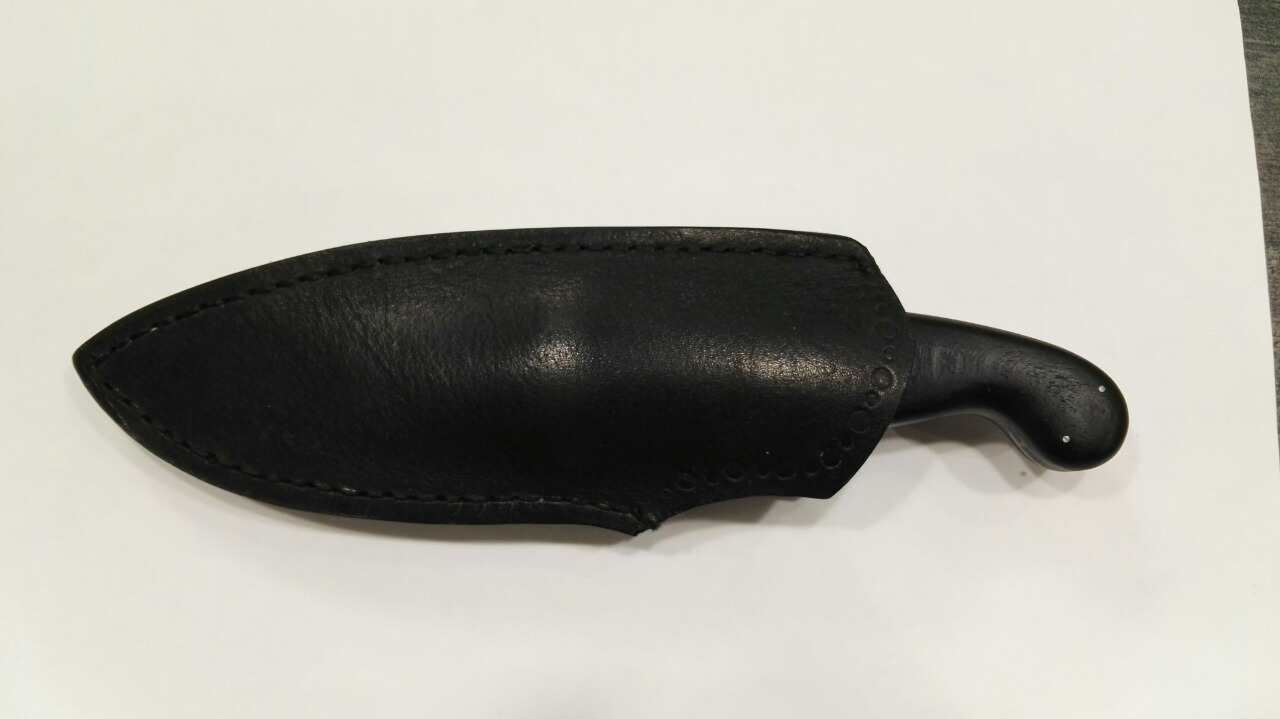 2.нож якут, сталь У10, клинок 125х26х4,0, рукоятка свилеватый темный орех, пропитка тунговое масло, ножны кожа пола, вощеная нить, финиш карнаубский воск