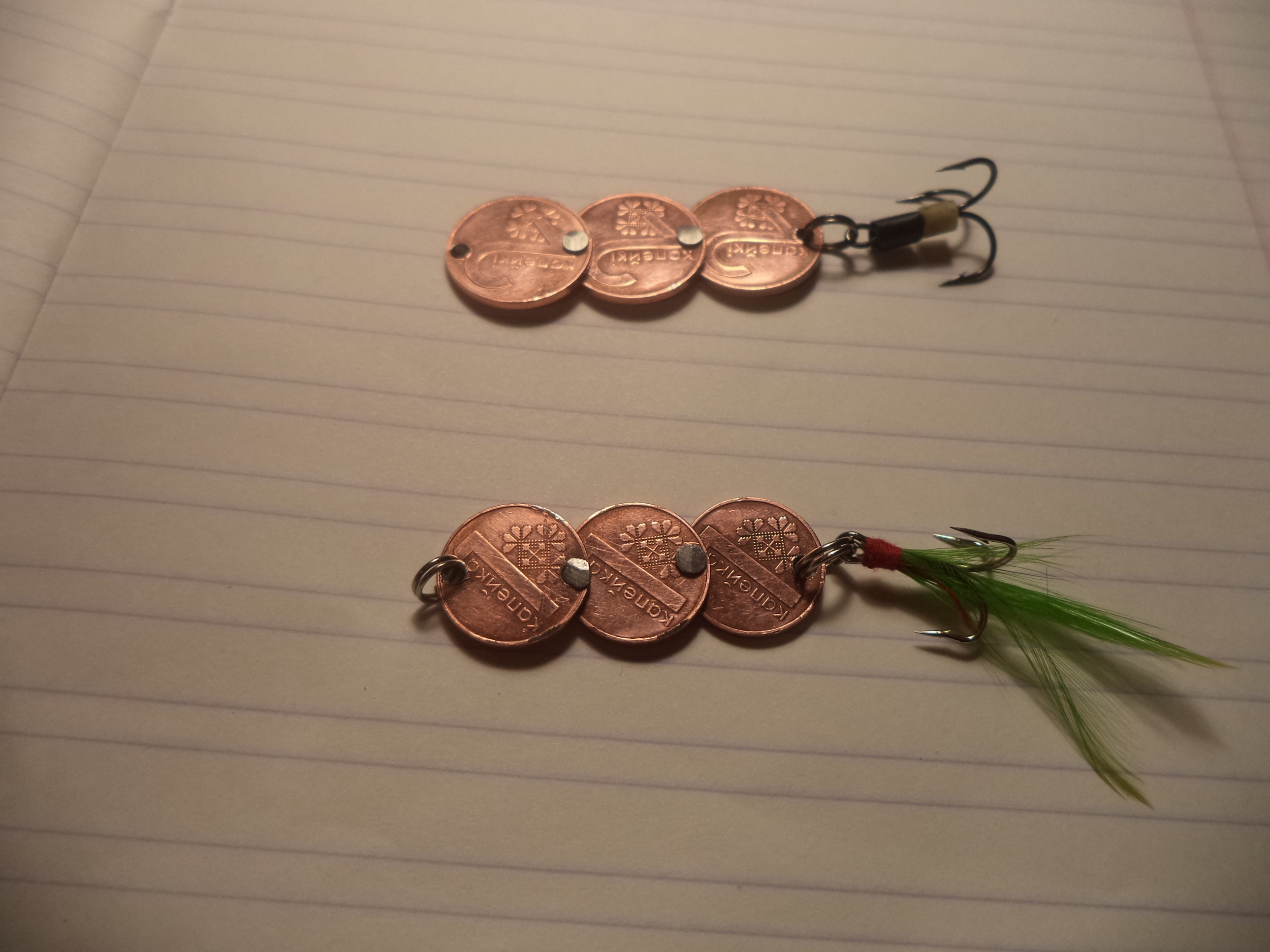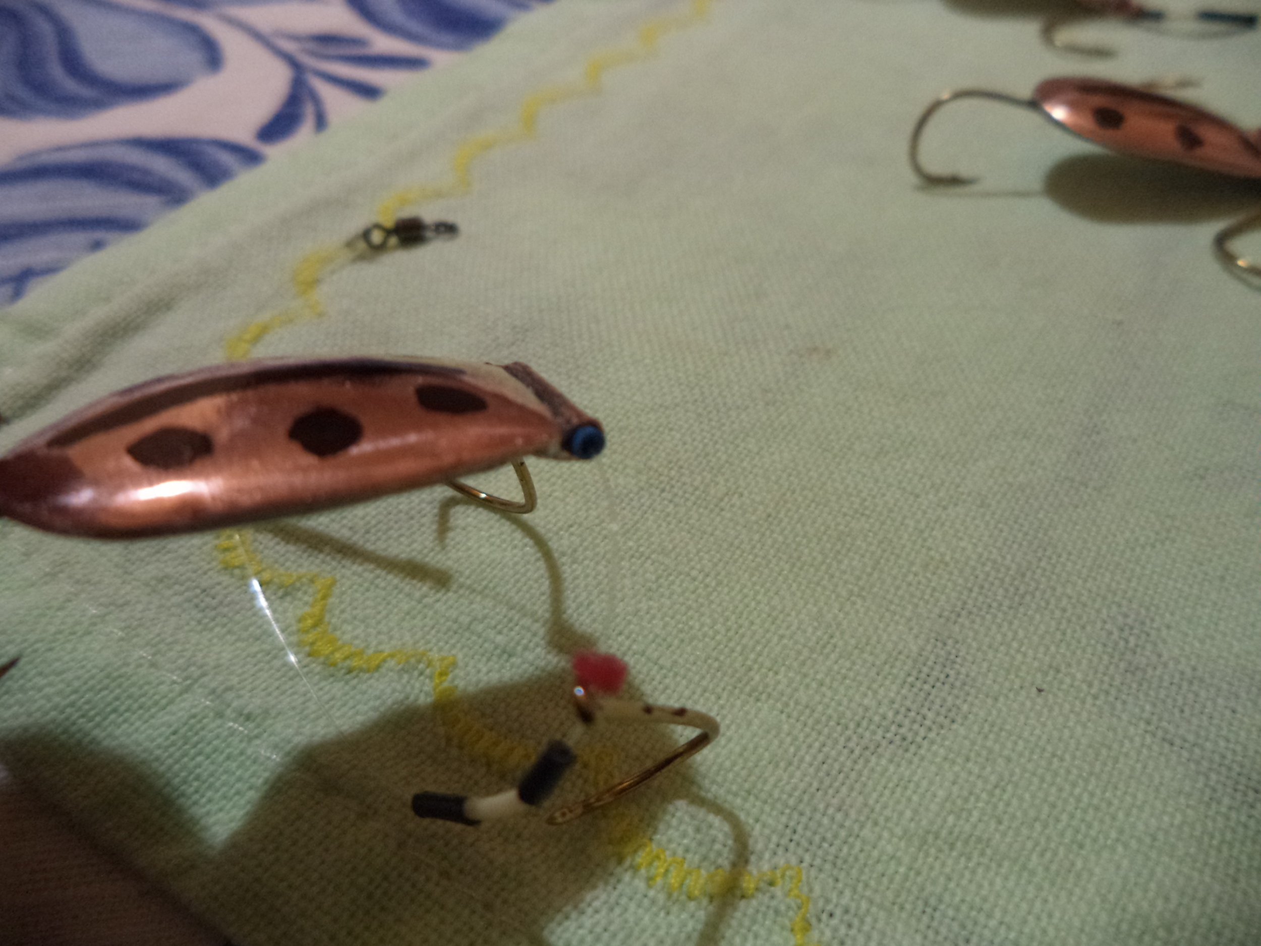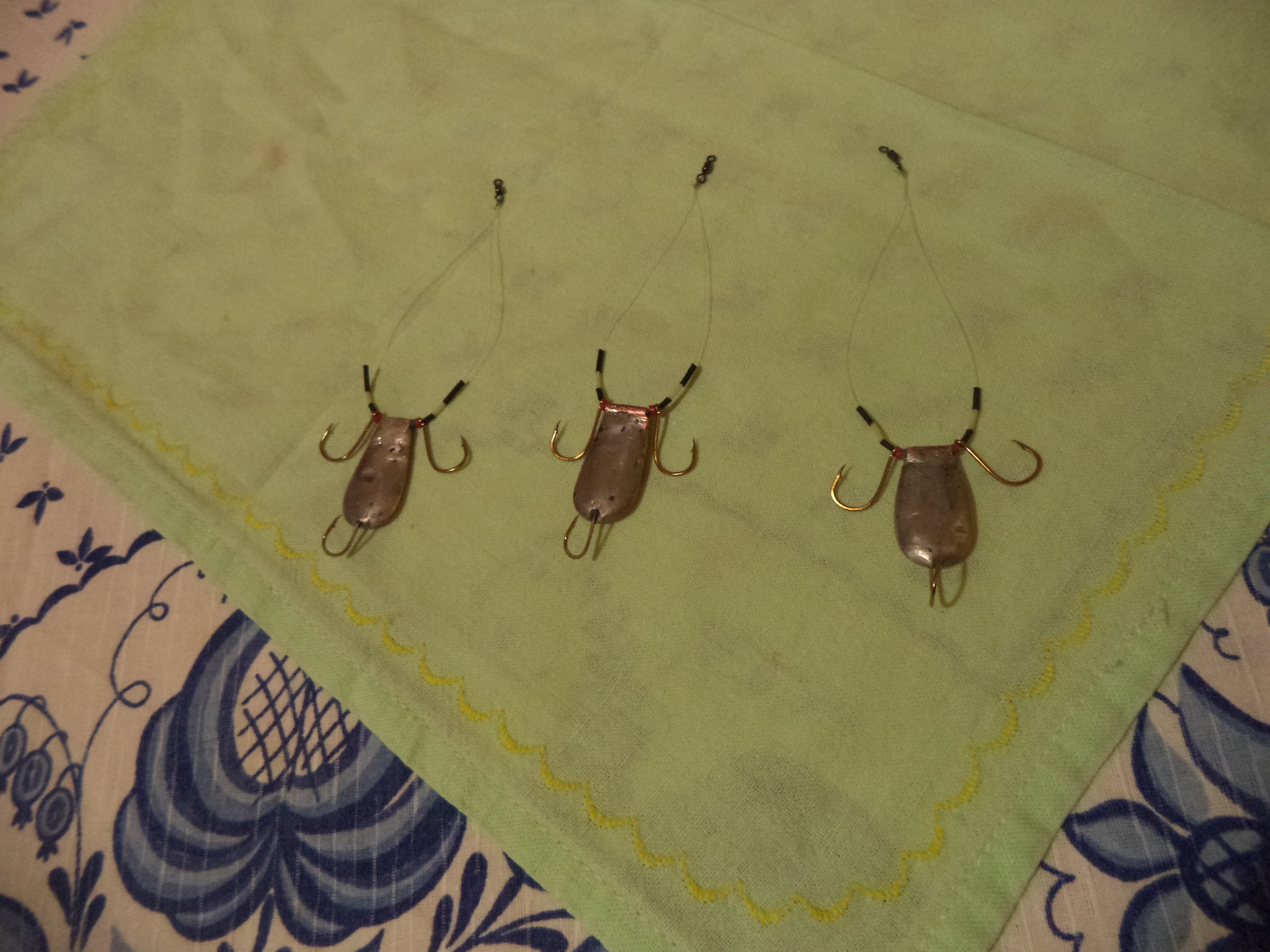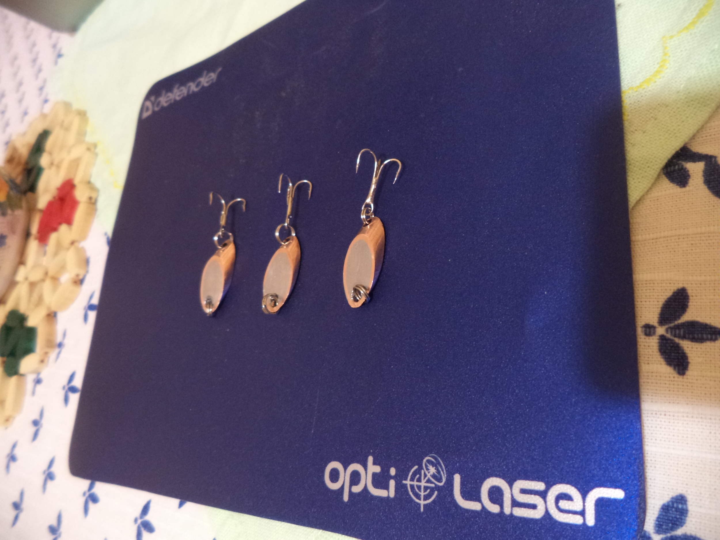 Сегодня изготовил пару блёсен для зимы. Цена вопроса - копейки (в прямом смысле :-): ). Для соединения использовал гвоздики от вытяжных заклёпок - они из нержавейки и легко откусываются плоскогубцами. Проверял в ведре с водой - игра нормальная. Завтра на водоём :fish: .