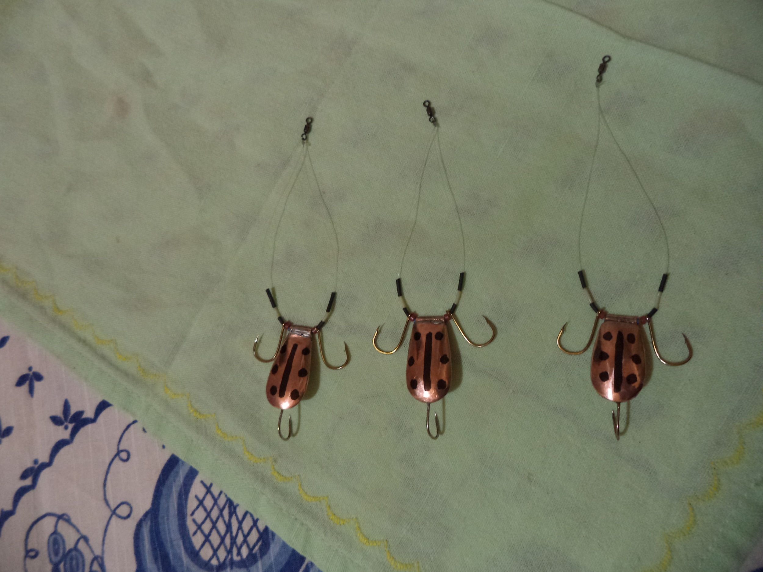 Поделюсь опытом изготовления самодельной блесны для ловли окуня. Называется она - "жук". В моих местах по первому льду эта насадка просто "убойная" - попадаются килограммовые экземпляры. Из материалов понадобятся: медная пластинка, паяльник с припоем, крючки, кембрики от эл. проводов, леска, вертлюжок. Думаю, процесс изготовления понятен по фото.