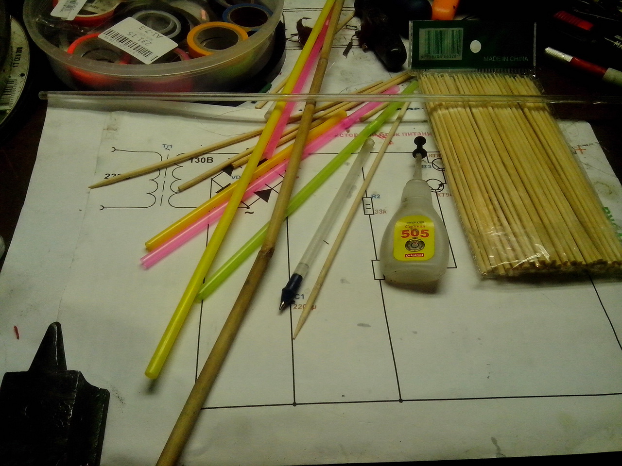 Использовал стебель сухого камыша и всякие трубочки, шпажки и т.д...