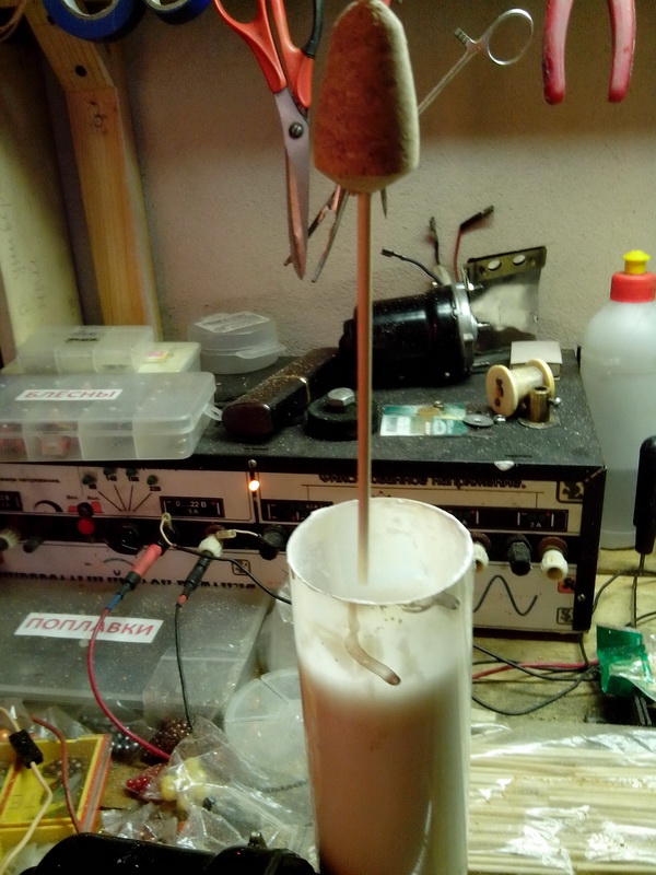 После полировки зажимаю поплавок в станок и разукрашиваю его красками на очень малых оборотах.