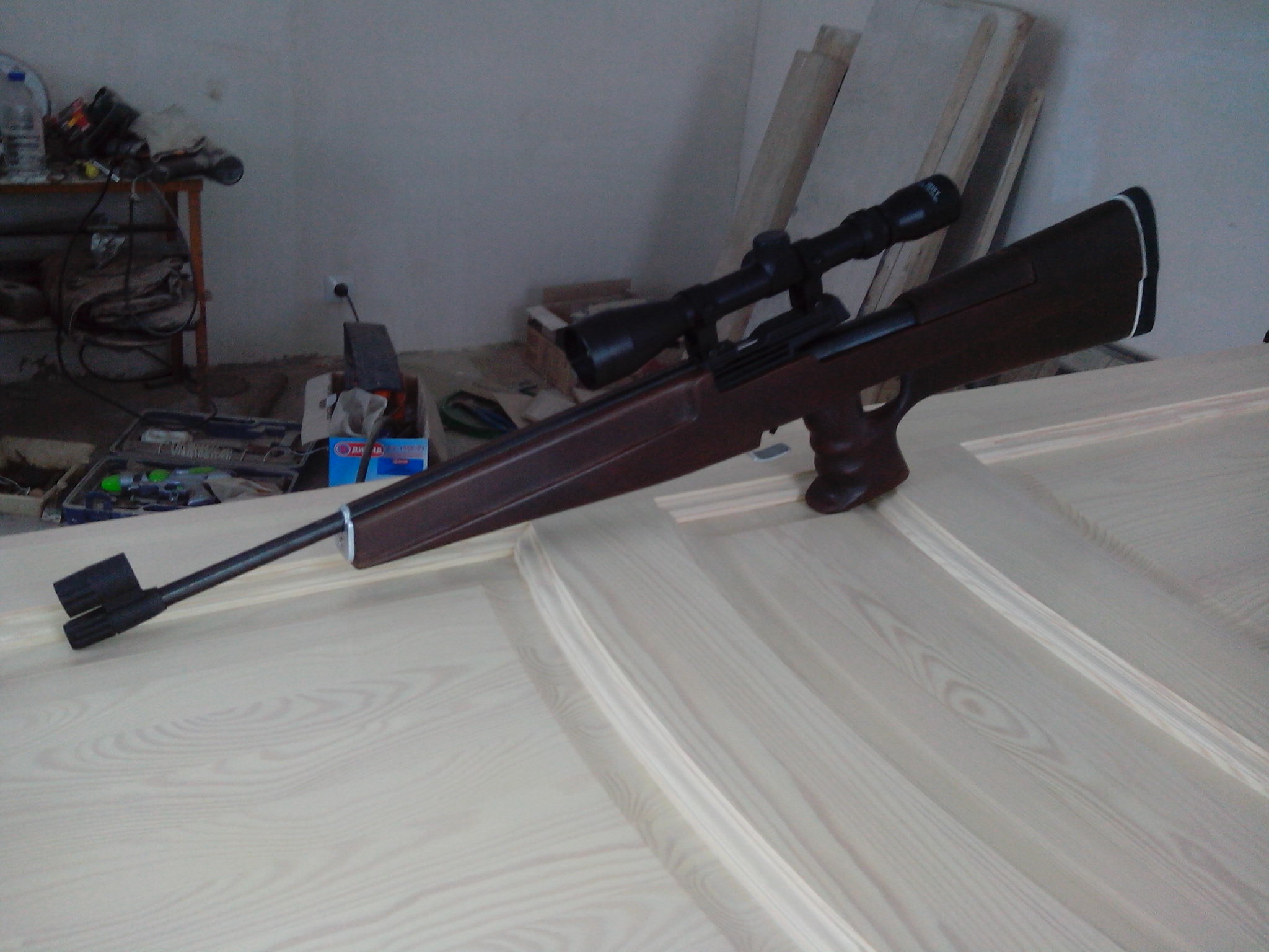 Остались нерешенные вопросы с прицельными, буду думать ставить открытые, ОП или калик, крепить ли коробку к ложу стандартными винтами или вырезать надствольную накладку с прорезями типа СВД (вот зачем придумал на ходу, придется делать), скоба над курком, утяжелитель на ствол и т.д. и т.п. Как додумаю скину фото.