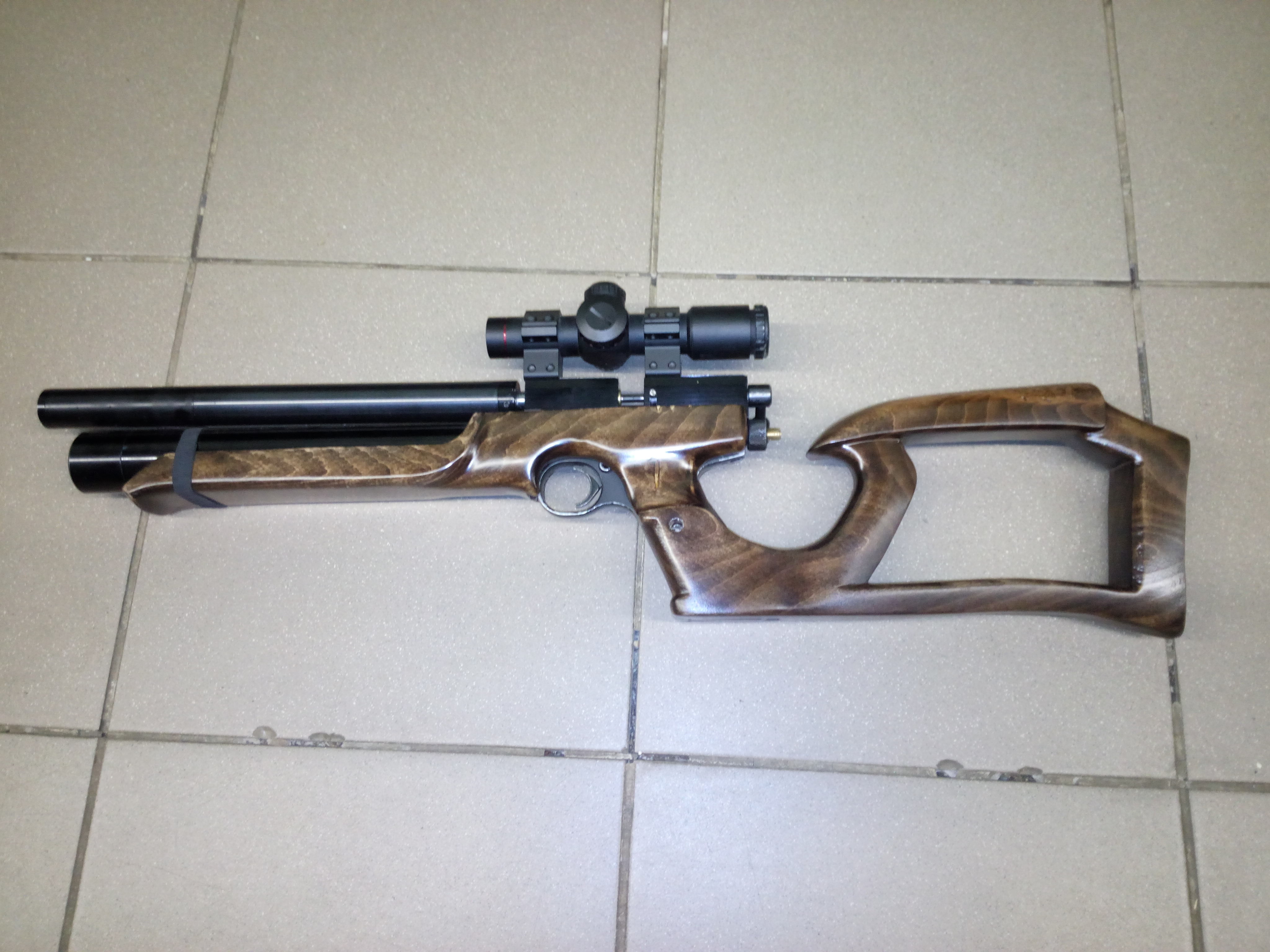 А у меня, по случаю, появился Крыс - пекаль ПСП-редуктор-cal 0.177. Тихий, кучный - с упора на 50 метров куча 25 мм Хэвиком. Решил одеть его в одёжку - сделать миникарабасик. Хотел делать приклад съёмный или откидывающийся, но на этом экземпляре в последний момент передумал. Вот что получилось. Осталось затылок из толстой кожи приклеить. Дерево бук, морилка палисандр водная + лак яхтный нанесён в несколько слоёв из пульвера. Весит меньше 0,5 кг.