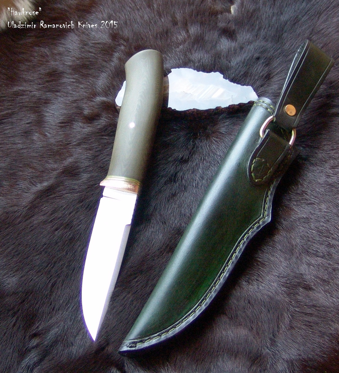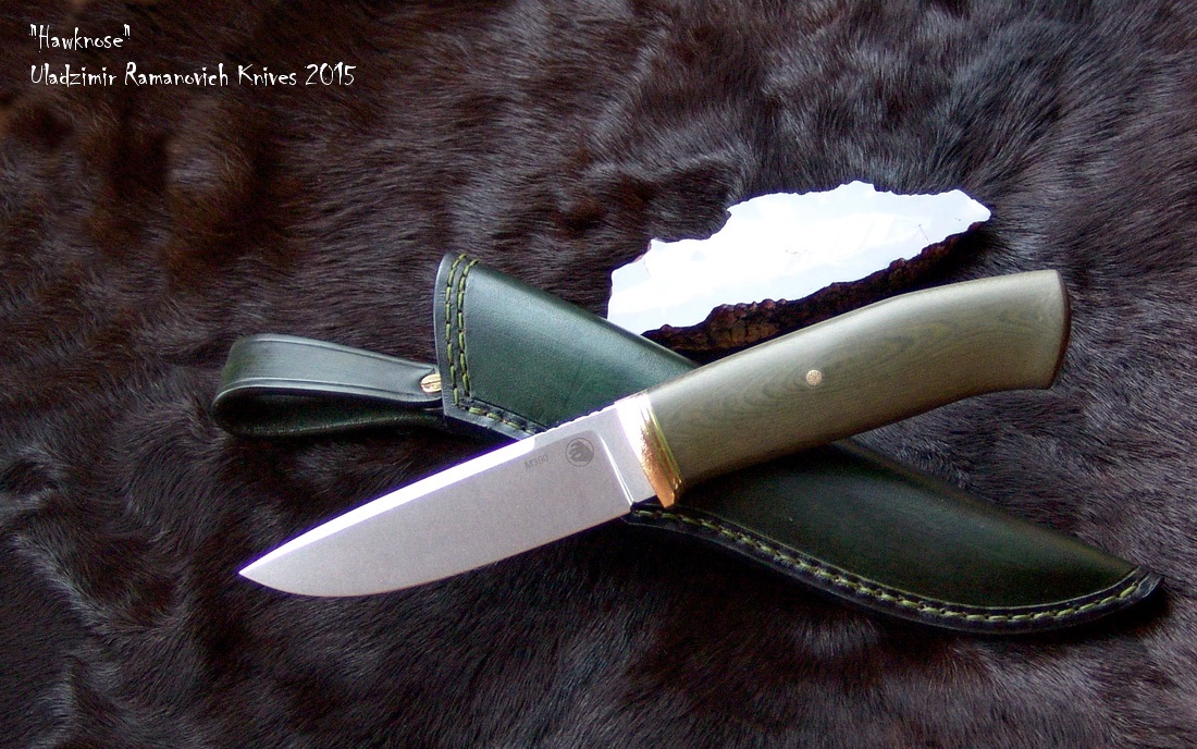 Нож "Орлиный нос", пикниково-разделочный, сталь клинка - М390, твёрдость 61-63 HRC, галтовка. Длина ножа 240мм, длина клинка 117мм, толщина клинка 3,9мм. Рукоять микарта - 123мм, бронза, проставки - зелёная G10. Цена 5,0 млн. руб. Тел. 8-025-738-90-48, Владимир