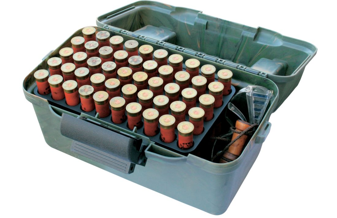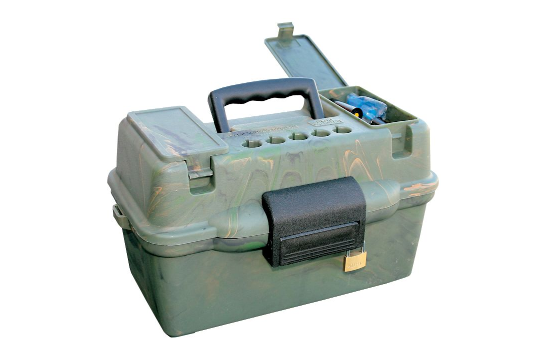 Емкость называется MTM Deluxe Shotshell Case. Вмещает 2 поддона (входят в комплект) по 50 патронов 12 калибра. Имеются отделения под разную полезную мелочь. Сделана в США, привезена оттуда же. Цена - 450 000 рублей.