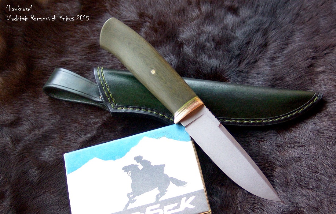 Нож "Орлиный нос", пикниково-разделочный, сталь клинка - М390, твёрдость 61-63 HRC, галтовка. Длина ножа 240мм, длина клинка 117мм, толщина клинка 3,9мм. Рукоять микарта - 123мм, бронза, проставки - зелёная G10. Цена 5,0 млн. руб. Тел. 8-025-738-90-48, Владимир