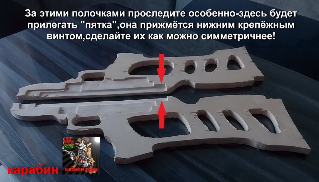 Также при наброске эскиза на затылке приклада внимательно подойдите к размеру(точнее к высоте)резинового затыльника.Положив его на бок и приложив к окончанию Вашего приклада точно обведите его прилегание,высоту рисуемого эскиза увеличьте выше затыльника на пару миллиметров,лучше потом срезать лишнее,чем не хватит!!!