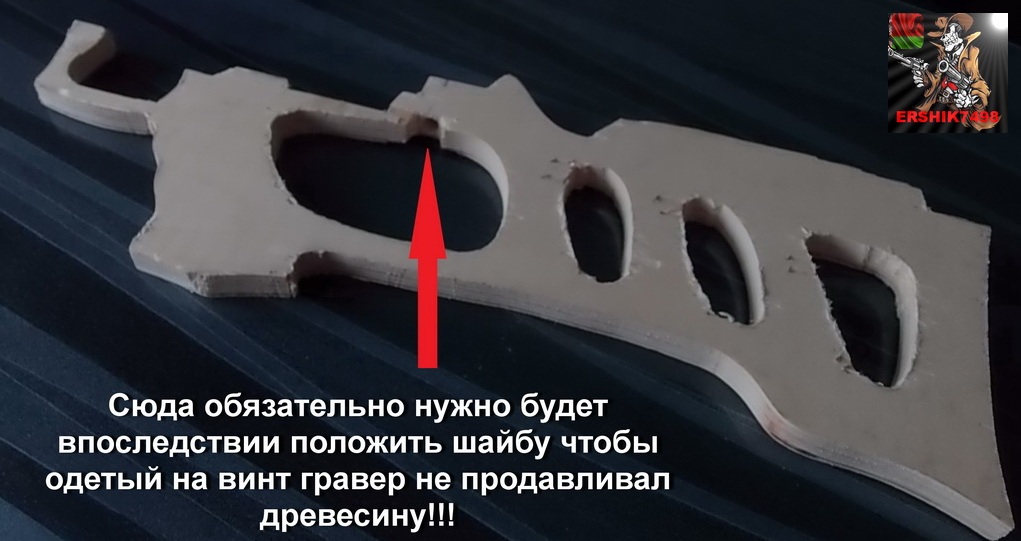 Сразу скажу что на этот винт будет при сборке одет гравер,а на гравер положим шайбу-это поможет чтобы винт с гравером не продавил древесину.Пистолет при взводе достаточно тугой,при взводе мы будем применять усилие на ствол,следовательно задняя часть «железа» будет стремиться поднятся.Винт нужно будет зажать достаточно туго,но без фанатизма,чтобы не наломать дров,сорвав резьбу в «железе».Тоже касается и боковых винтов-под них нужно будет положить обязательно шайбы!Теперь мы подошли к склеиванию заготовок нашей ложи.